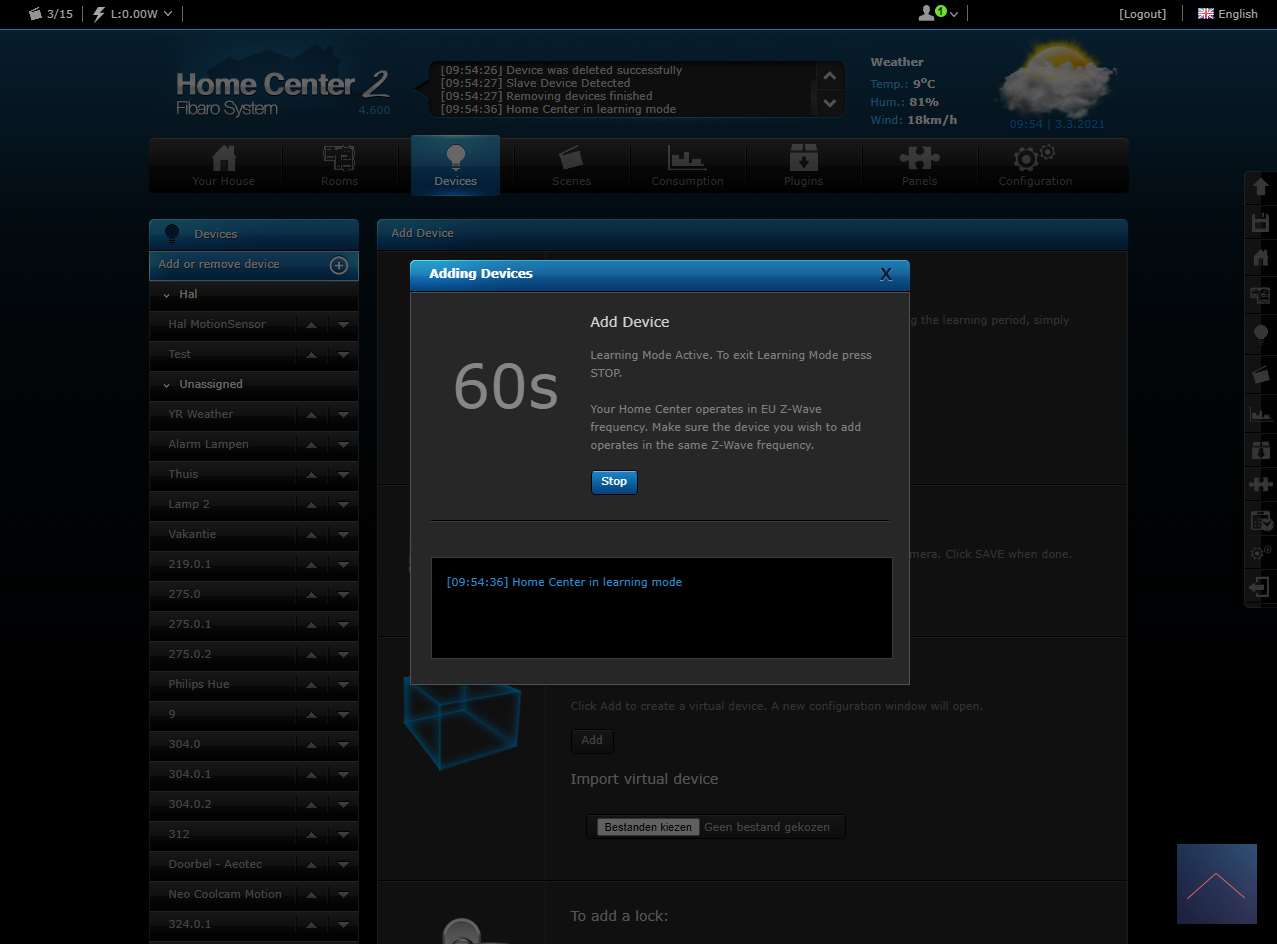 We voorzien het geheel van stroom en loggen in op de HC2 en gaan naar onze apparaten. We klikken vervolgens op "Add new device" en hierna op "Add".