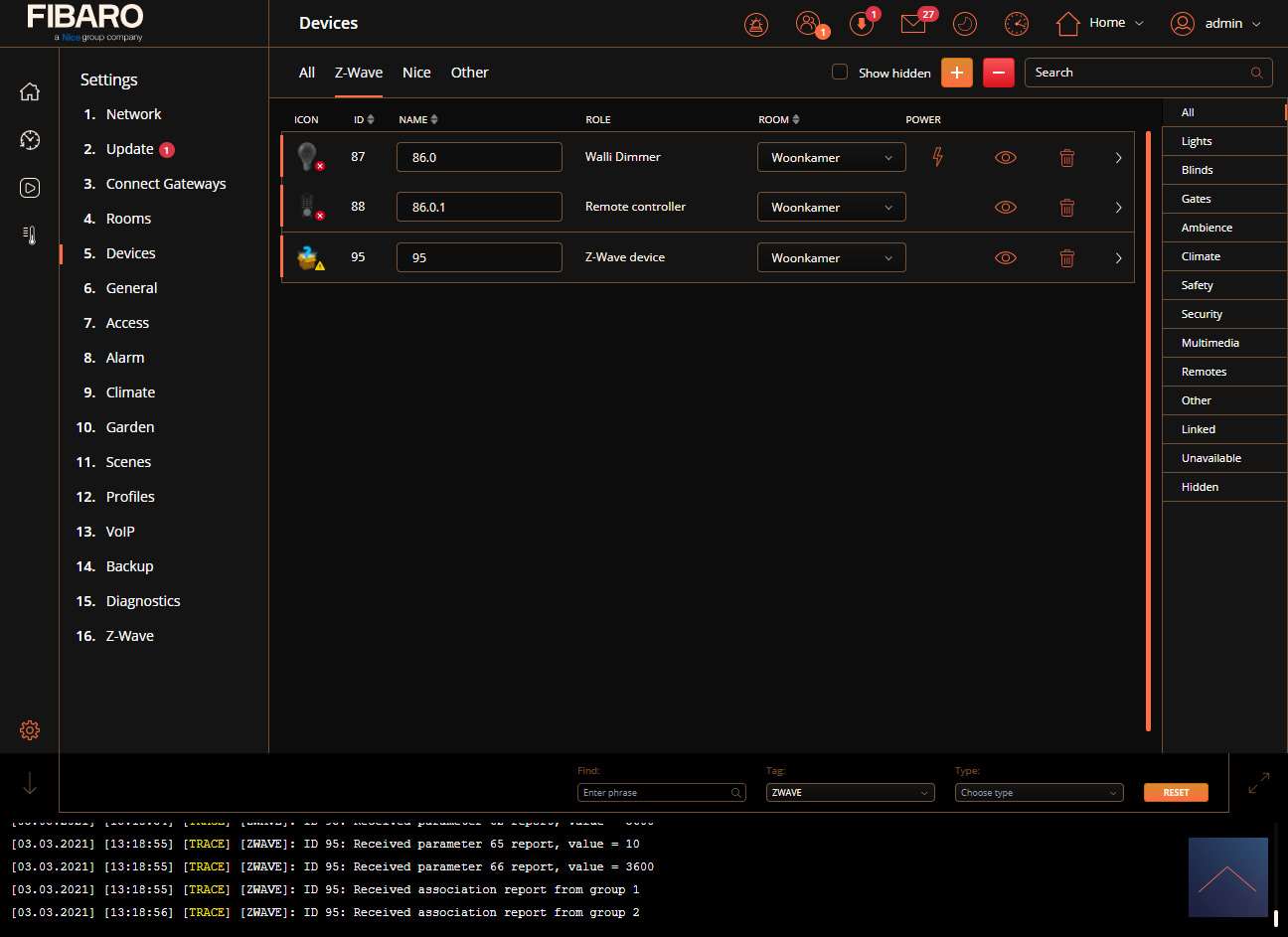 Nu we alles aangesloten hebben voorzien we de Walli van stroom en loggen in op de HC3. We gaan naar onze apparaten en drukken op het plusje. Nu moeten het toevoegen knopje aan de voorkant van de Walli 3x snel achter elkaar indrukken. De LED van de Walli zal geel oplichten en hierna groen gaan branden om aan te geven dat het gelukt is. Ik zie ook wat waardes voorbij komen in de HC3 en zie hem uiteindelijk bij mijn apparaten verschijnen.