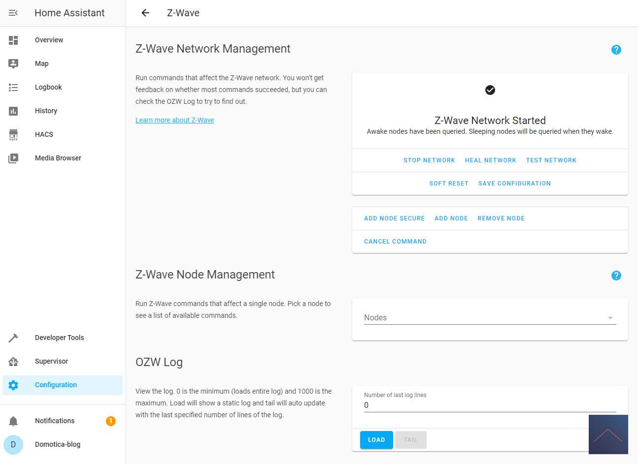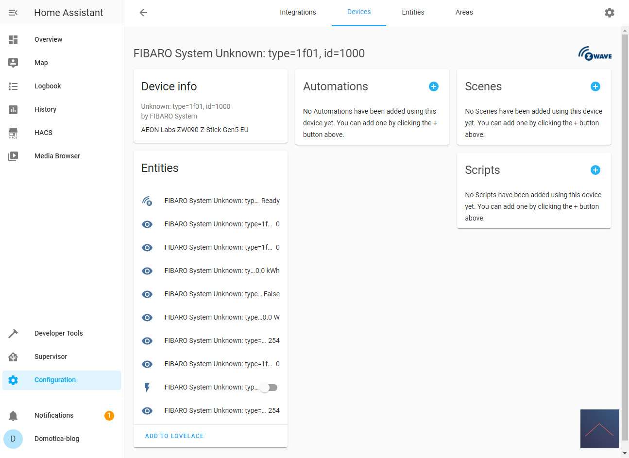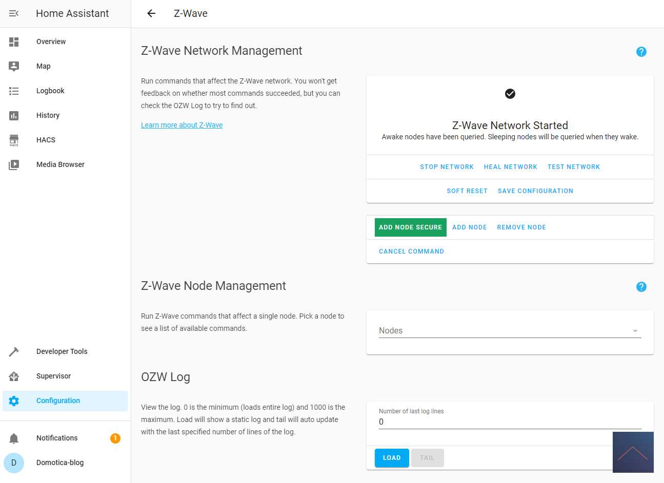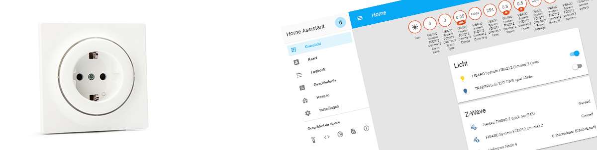 Nu kunnen we hem gaan toevoegen. We loggen eerst in op Hass via je browser en gaan naar de configuratie. Hierna gaan we naar "integrations" en drukken we op "configure" bij het z-wave onderdeel. Vervolgens klik je op "add node secure" om het toevoegen te starten. Nu drukken we 3x snel achter elkaar op de knop aan de voorkant van het stopcontact. De LED zal groen oplichten en hierna wit van kleur worden. HASS geeft een zeer korte melding dat het toevoegen is gestart. Als ik na een tijdje kijk bij mij apparaten dan zie ik hem staan.