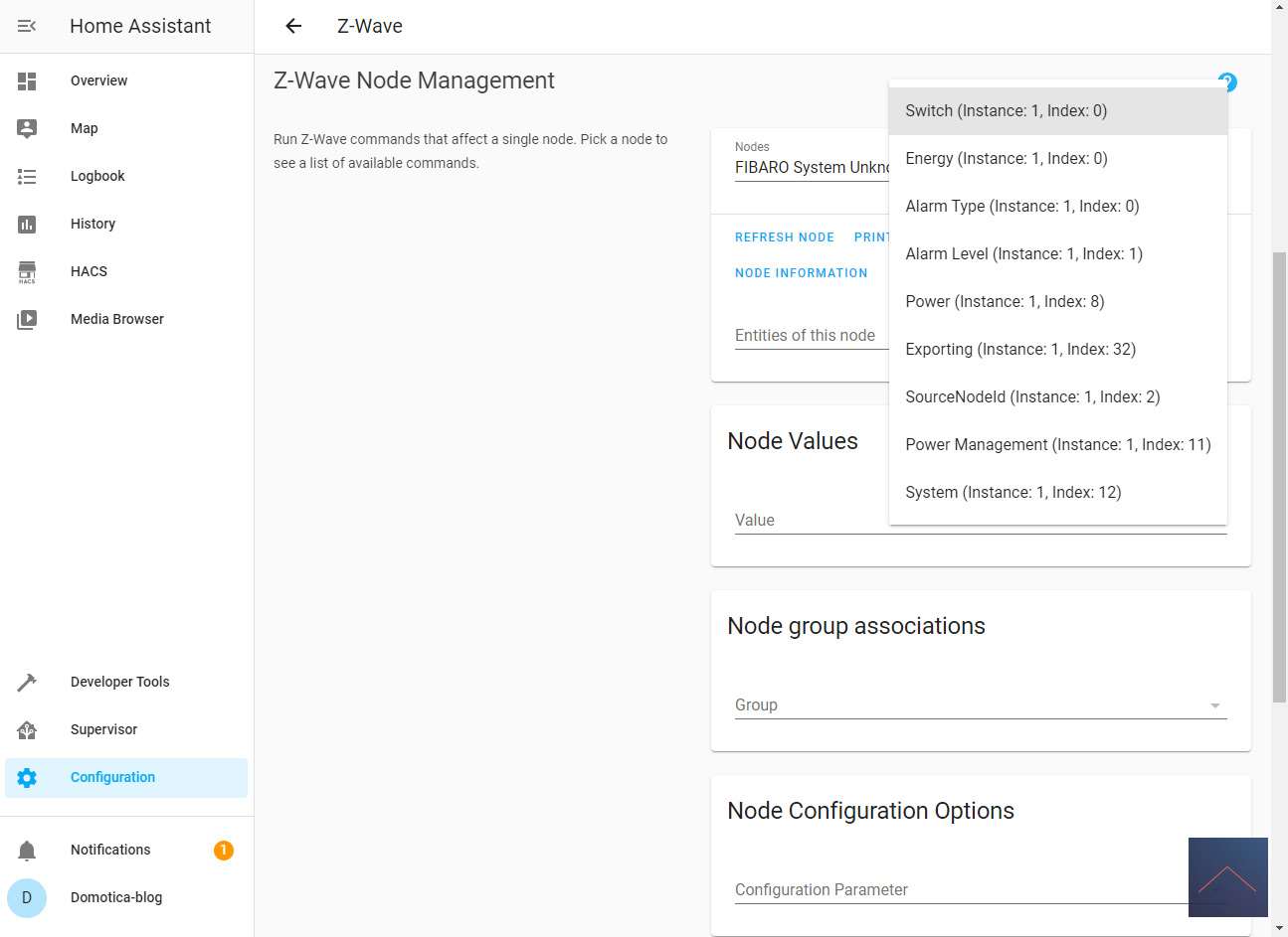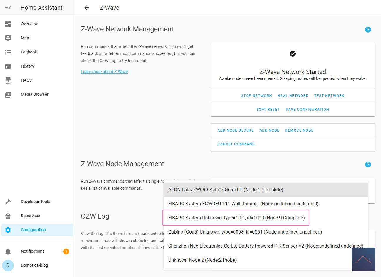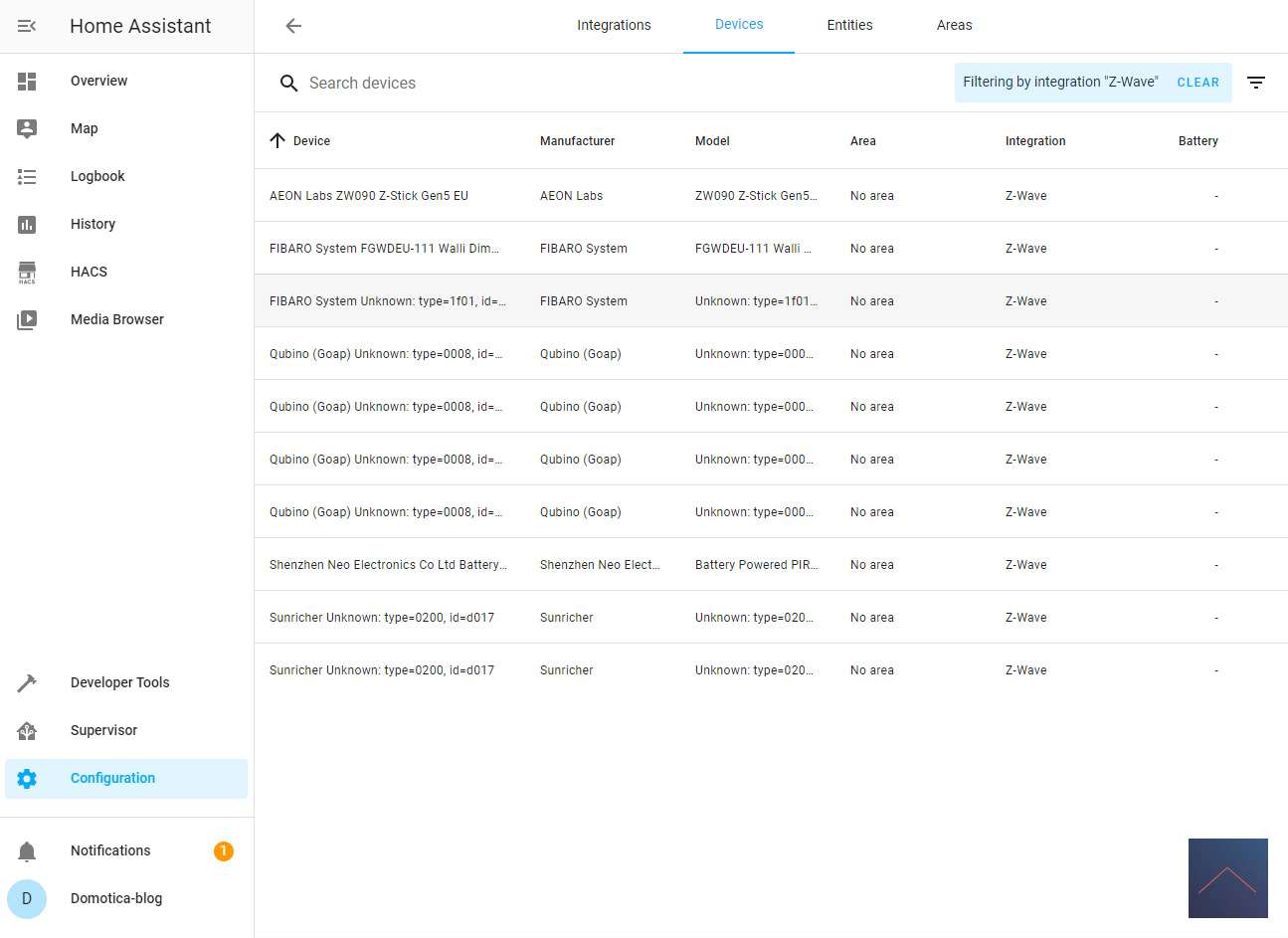 Nu kunnen we hem gaan toevoegen. We loggen eerst in op Hass via je browser en gaan naar de configuratie. Hierna gaan we naar "integrations" en drukken we op "configure" bij het z-wave onderdeel. Vervolgens klik je op "add node secure" om het toevoegen te starten. Nu drukken we 3x snel achter elkaar op de knop aan de voorkant van het stopcontact. De LED zal groen oplichten en hierna wit van kleur worden. HASS geeft een zeer korte melding dat het toevoegen is gestart. Als ik na een tijdje kijk bij mij apparaten dan zie ik hem staan.