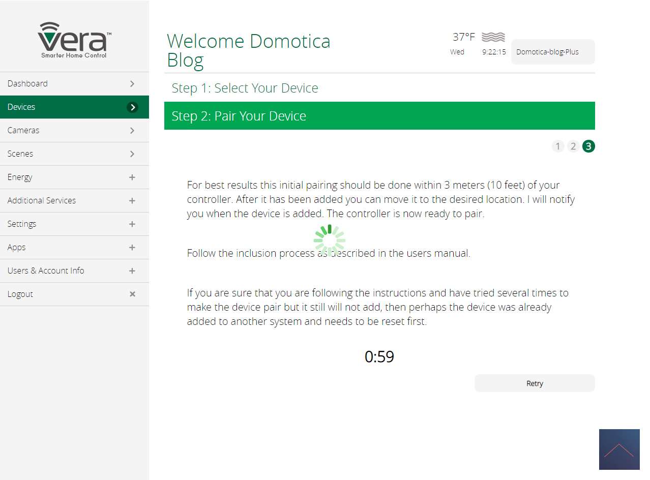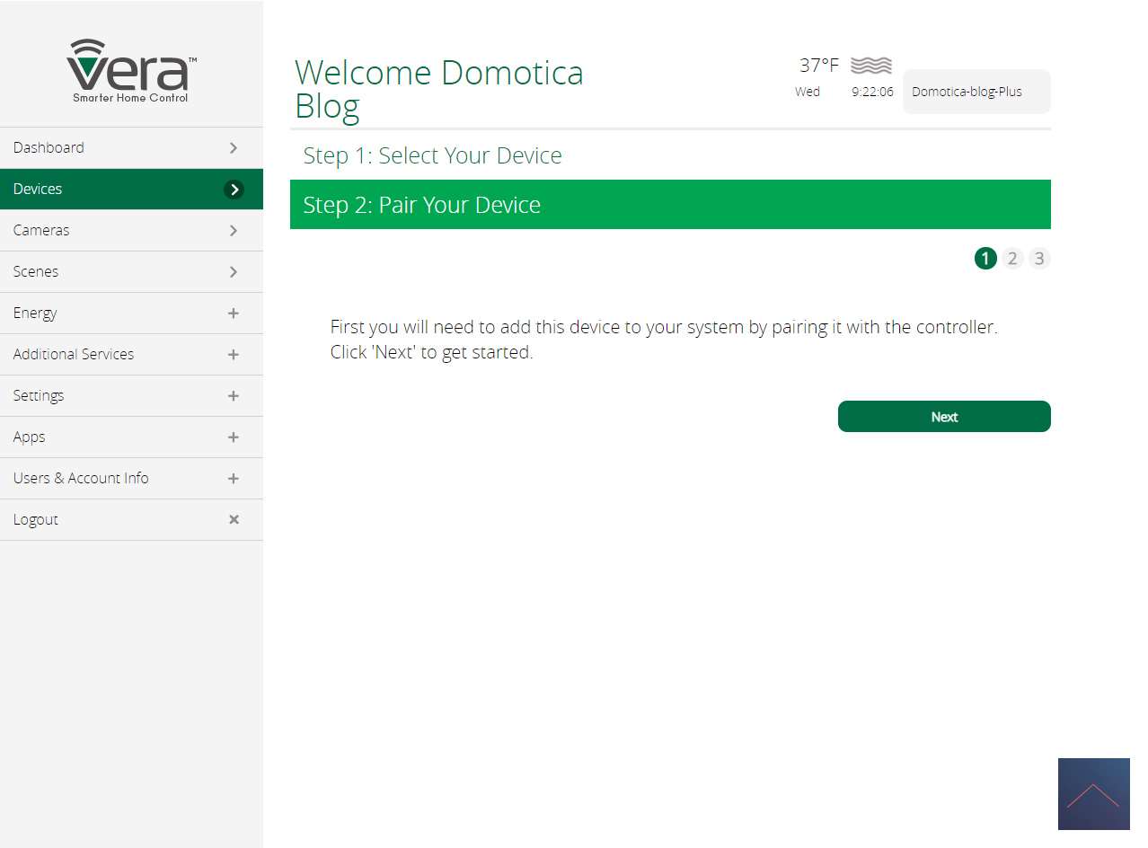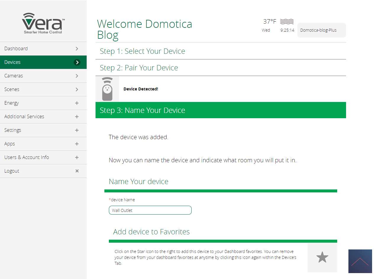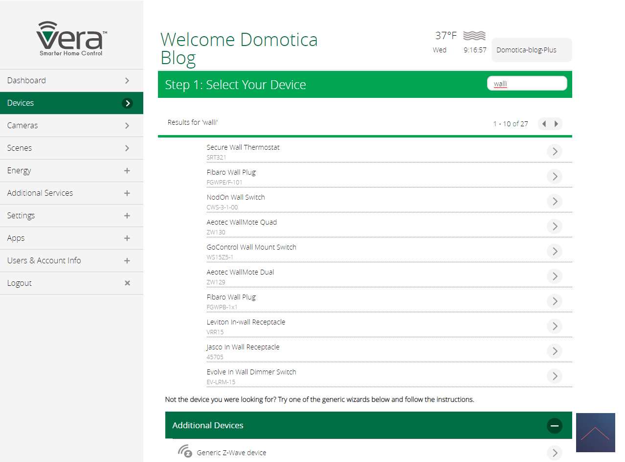 We voorzien de Walli nu weer van stroom en loggen in op de Vera en gaan naar onze apparaten. We klikken vervolgens op "Add device". We zoeken op Walli maar helaas wordt deze niet gevonden. Dus zit er niks anders op dan hem al "Generic z-wave" toe te voegen.