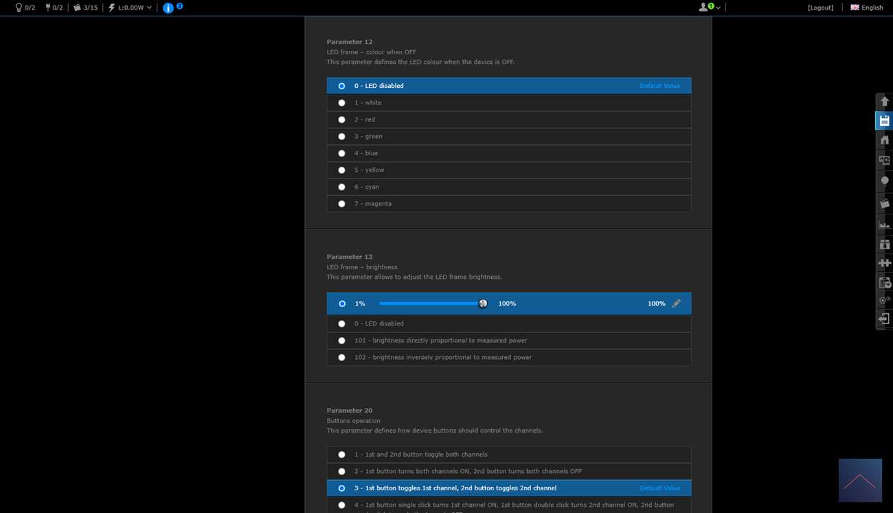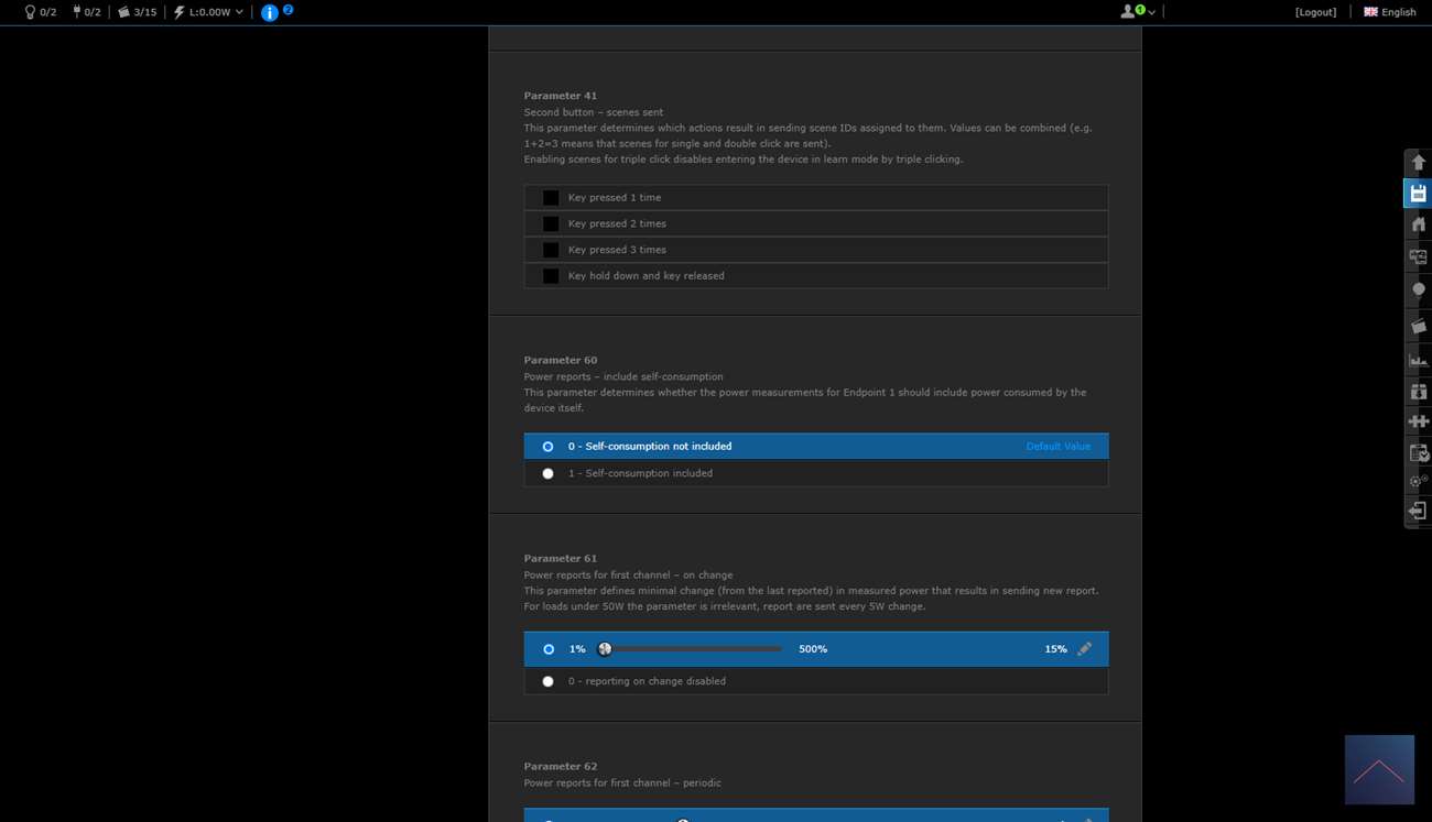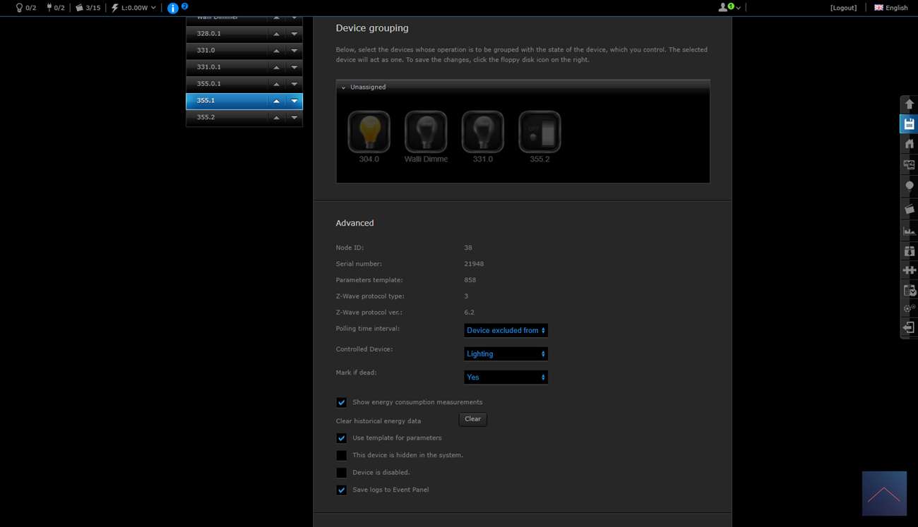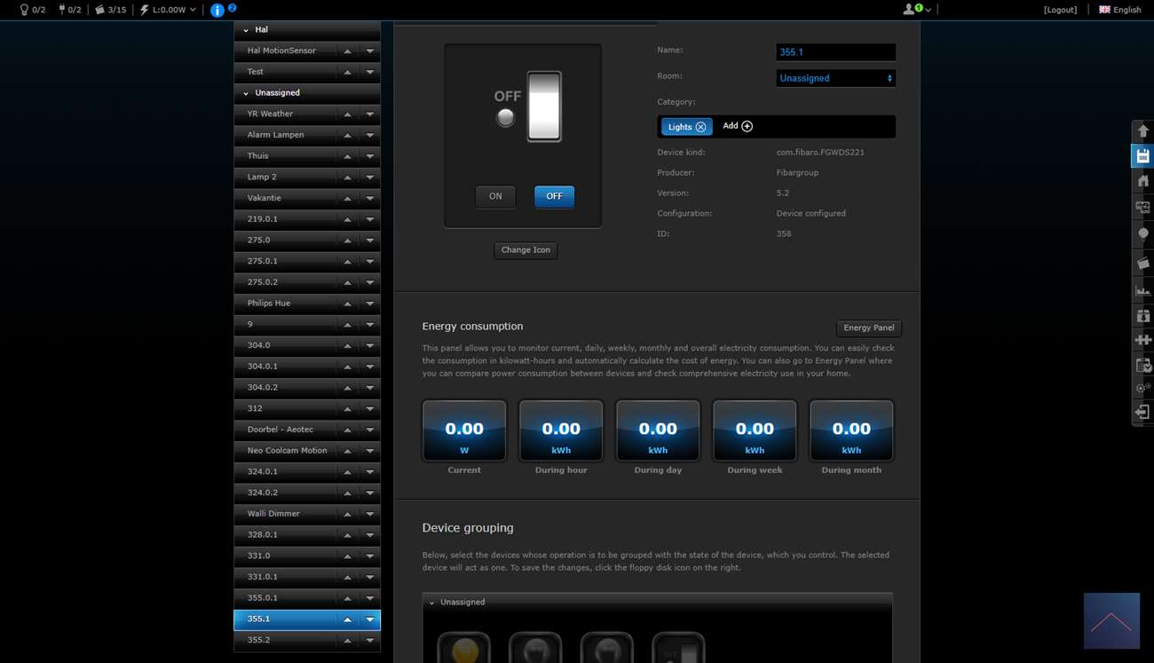 Je krijgt 2 schakelaars en een scene schakelaar. Deze laatste is om bv de 2x klik te regelen. Je ziet ook het totaal verbruik en huidige verbruik.