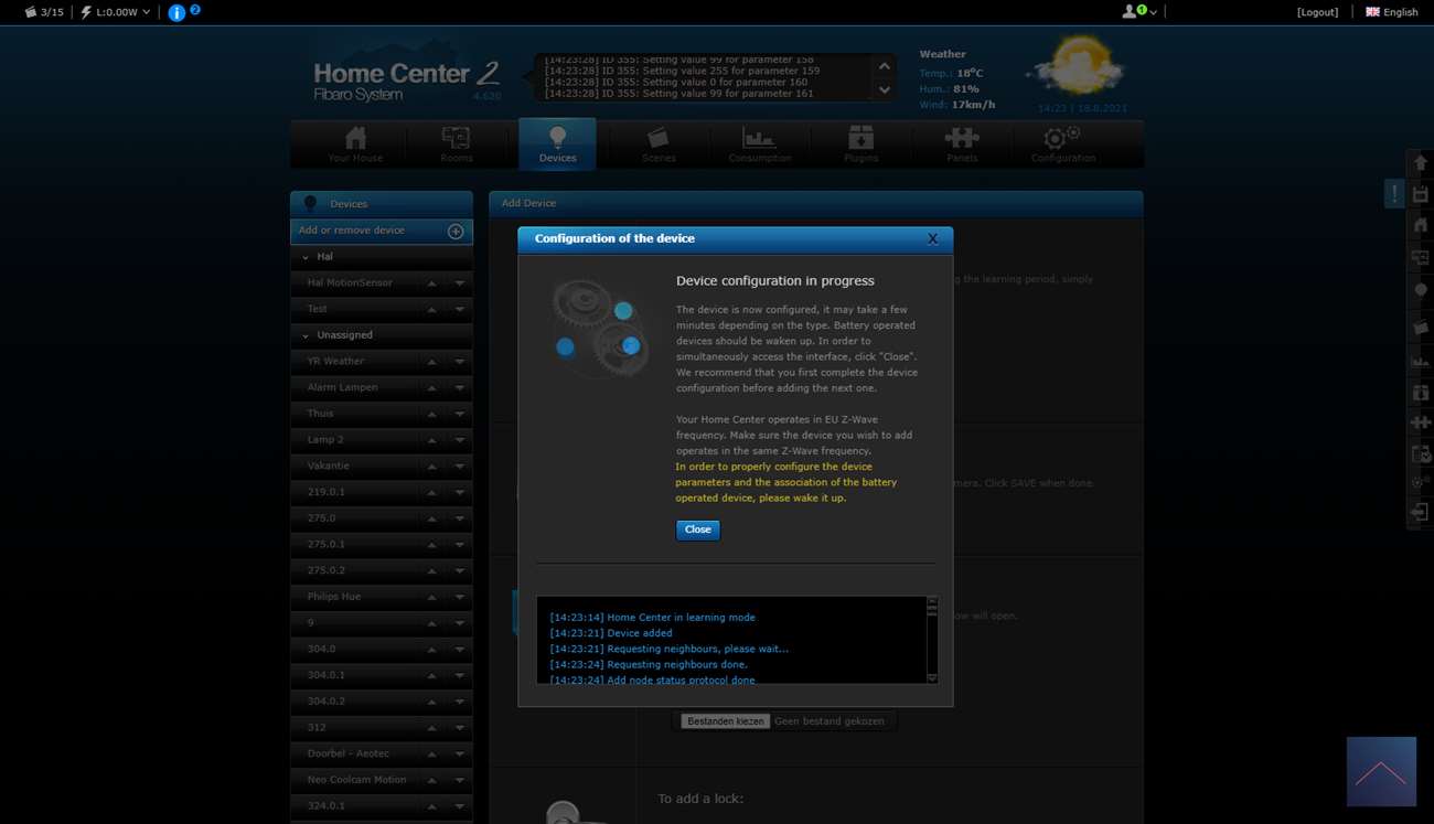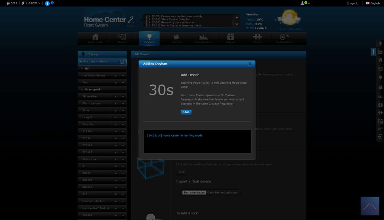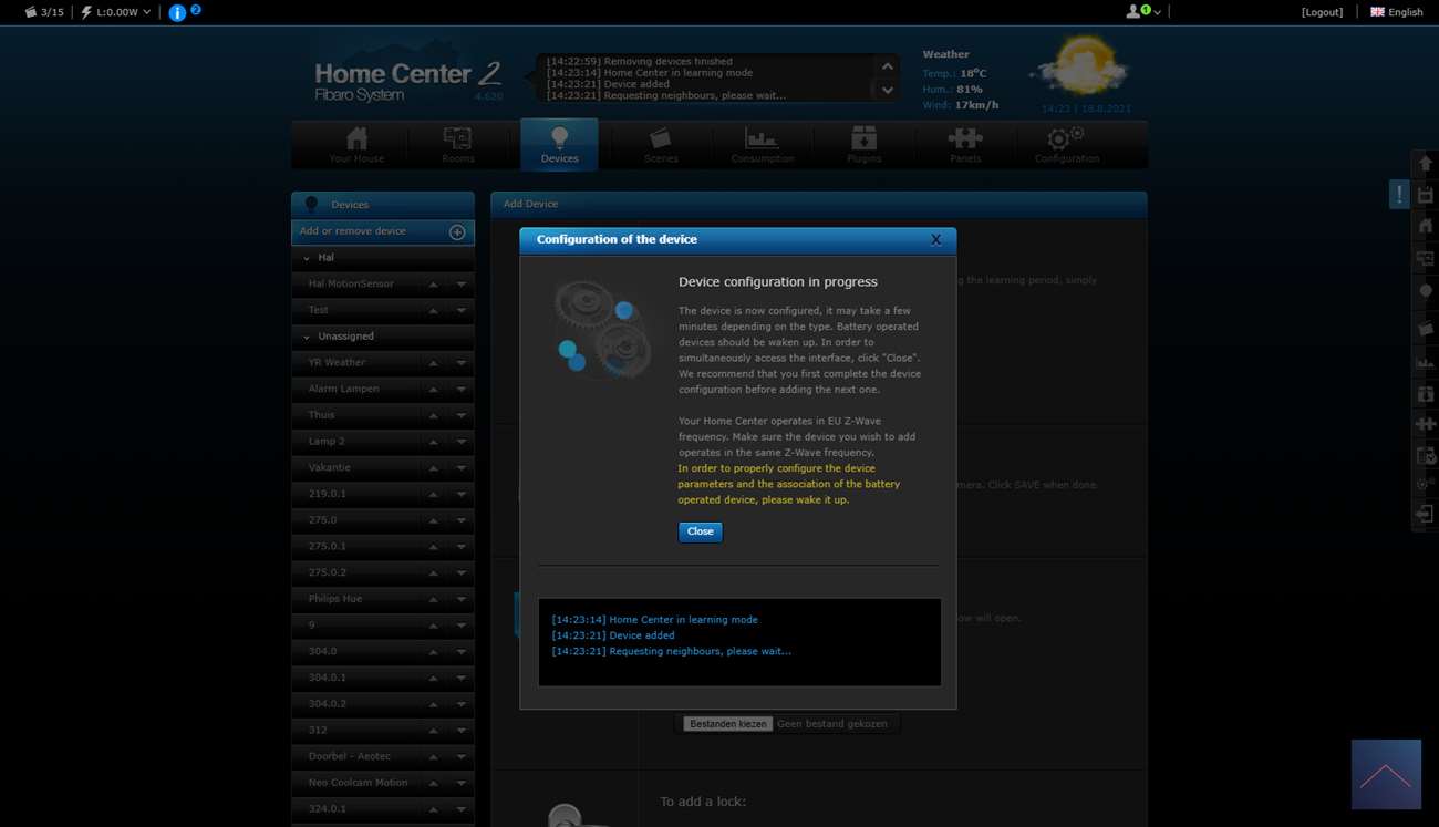 Klik vervolgens op "add or remove device" en dan zet het vinkje "add secure" aan. Het toevoegen zal nu starten op de HC2. Nu moeten we dit ook activeren op de Walli. Dit kun je doen door 3x op de aan knop te klikken. De LED zal geel knipperen en hierna groen van kleur worden. Ik zie in de HC2 dat hij gevonden wordt.