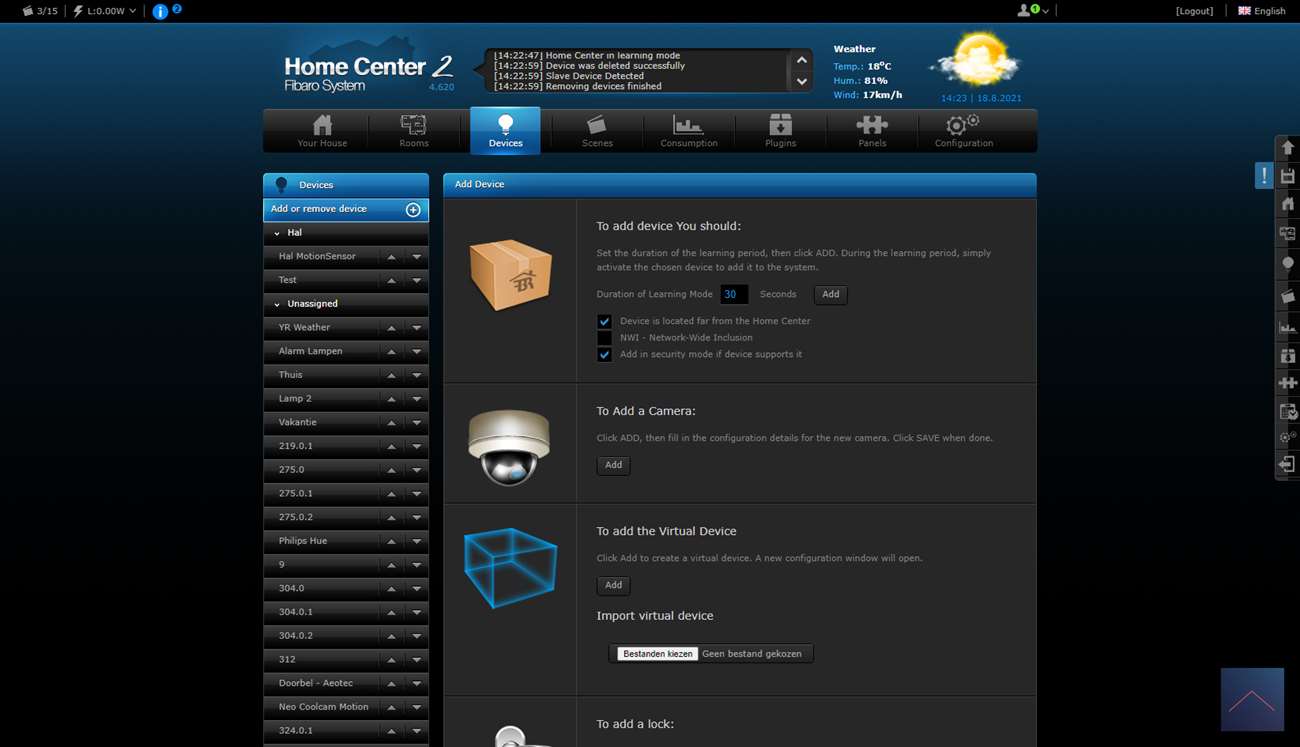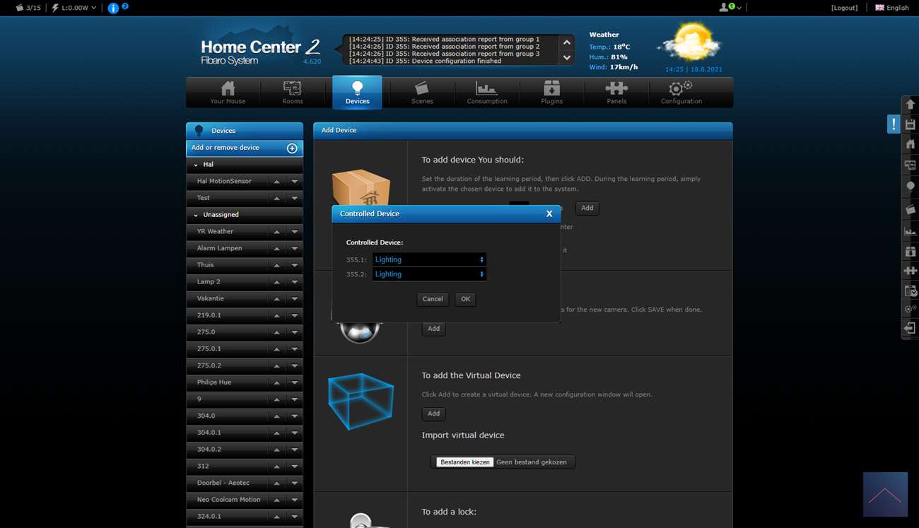 Nu kunnen we hem gaan toevoegen. Om dit voor elkaar te krijgen log ik in op de HC2 en ga ik naar mijn apparaten.