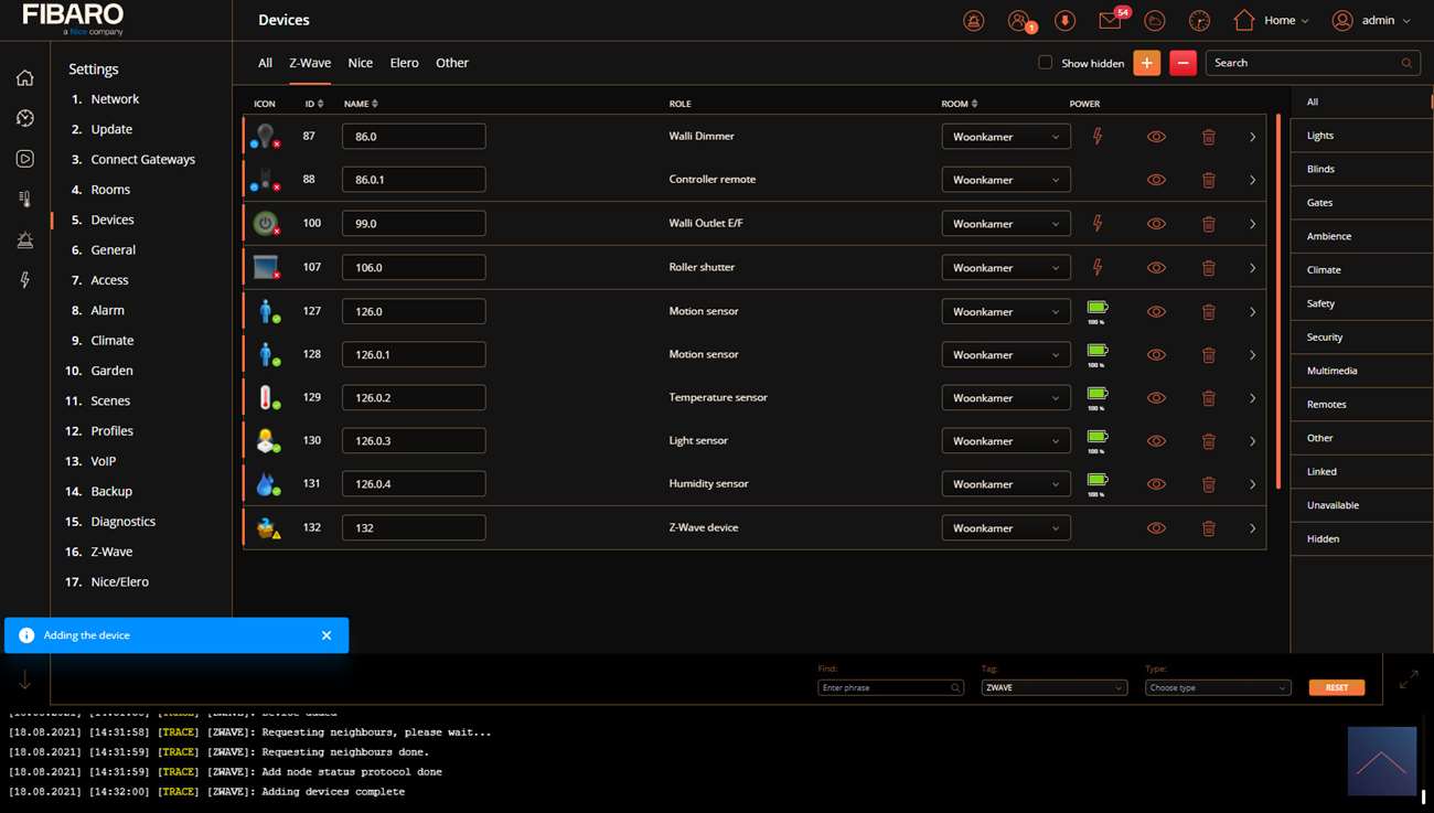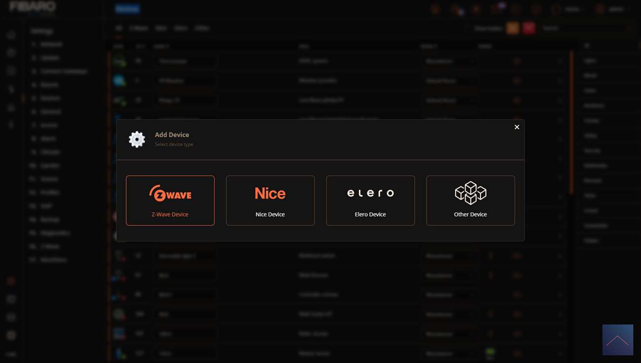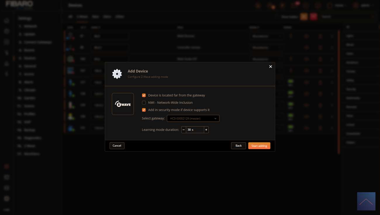 Nu kunnen we de switch toevoegen aan de HC3 door in te loggen en naar de "settings" te gaan en vervolgens op "devices" te klikken. We klikken rechtsboven op het blauwe plus en selecteren Z-wave. Hierna vinkje "add node secure" aan en drukt op start adding. Onderin zal een balk komen waarin vermeld staat dat je de Walli in leermodus moet zetten.