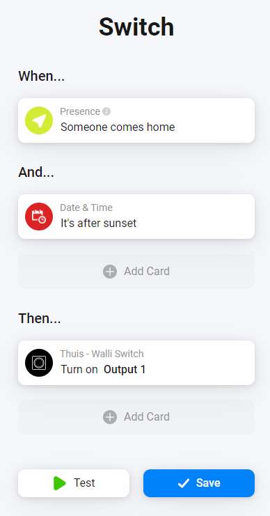 We maken een flow als er iemand thuis is en het is na zonsondergang dat dan de Walli aangezet moet worden.