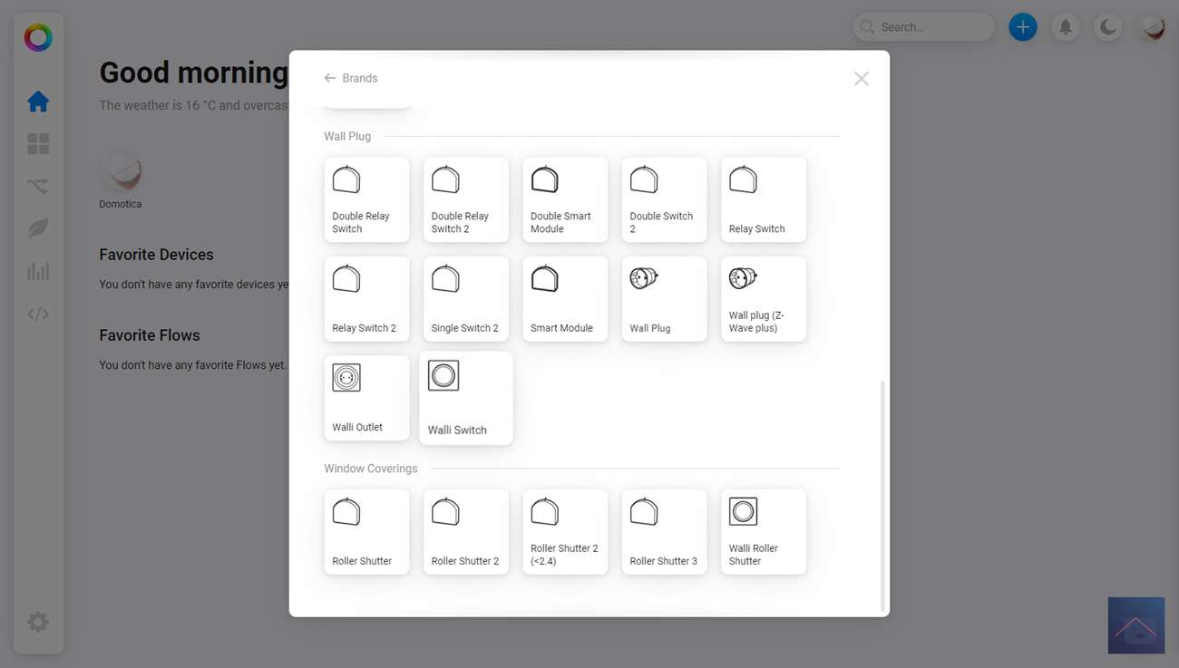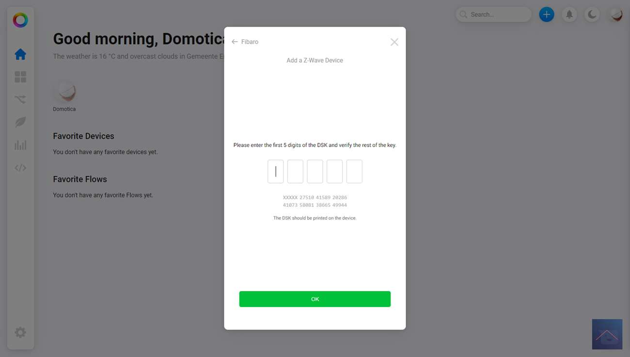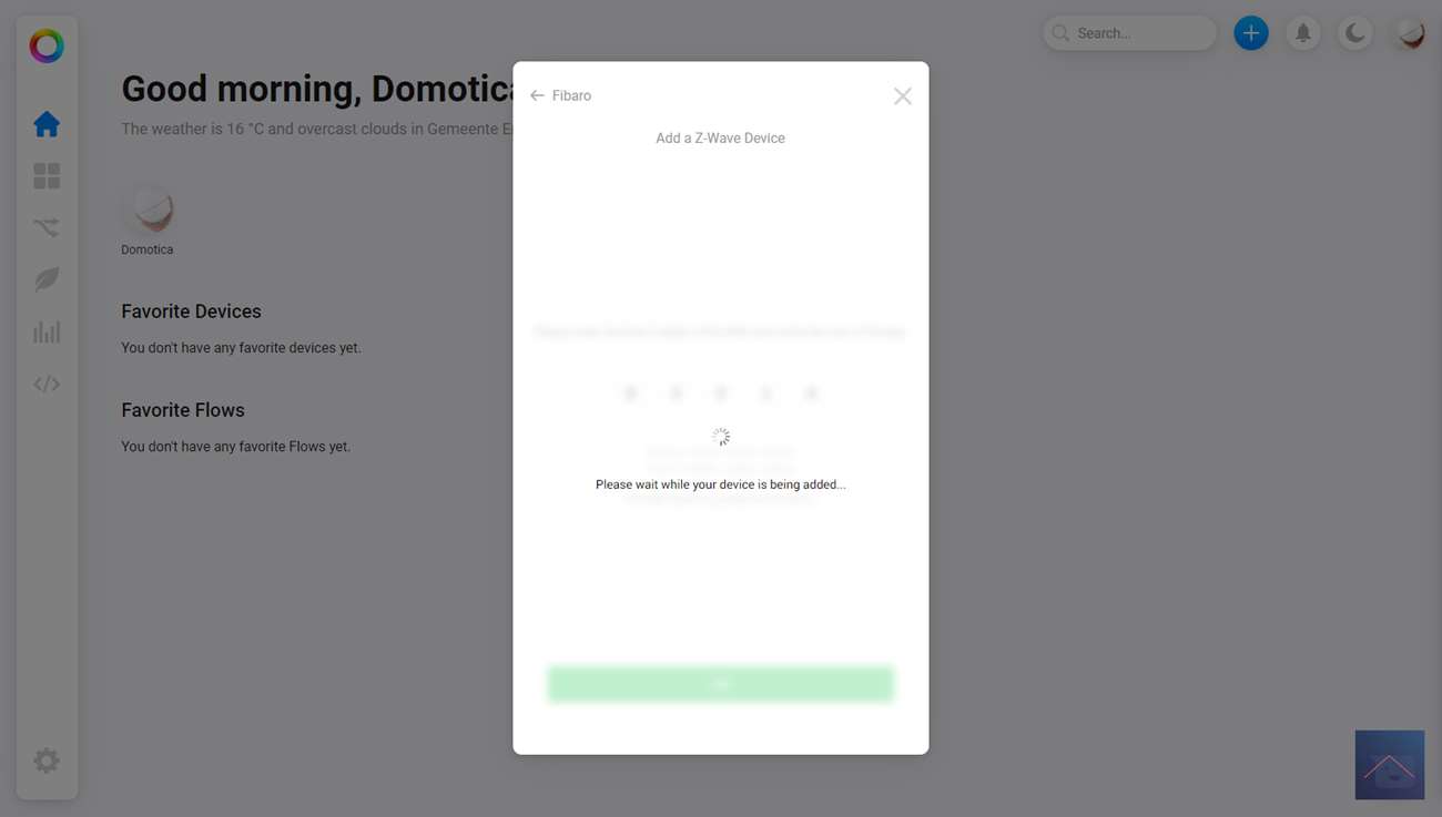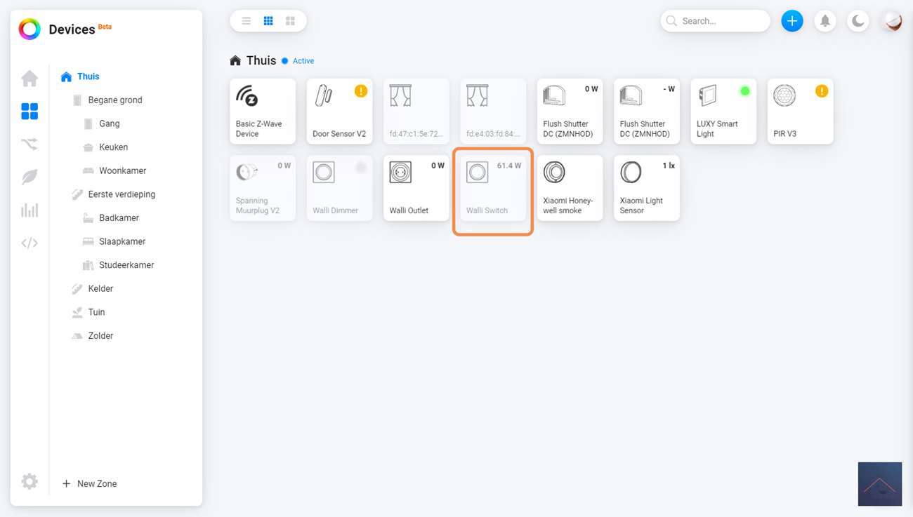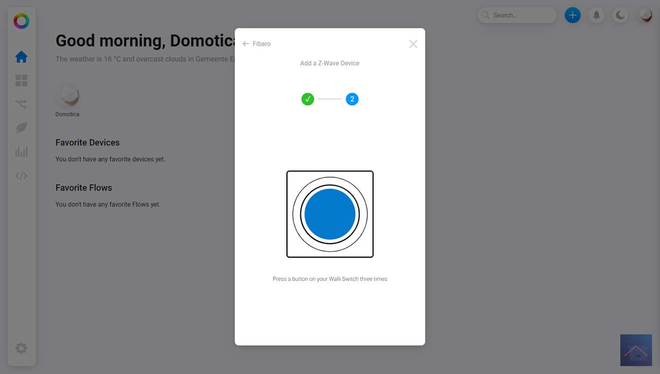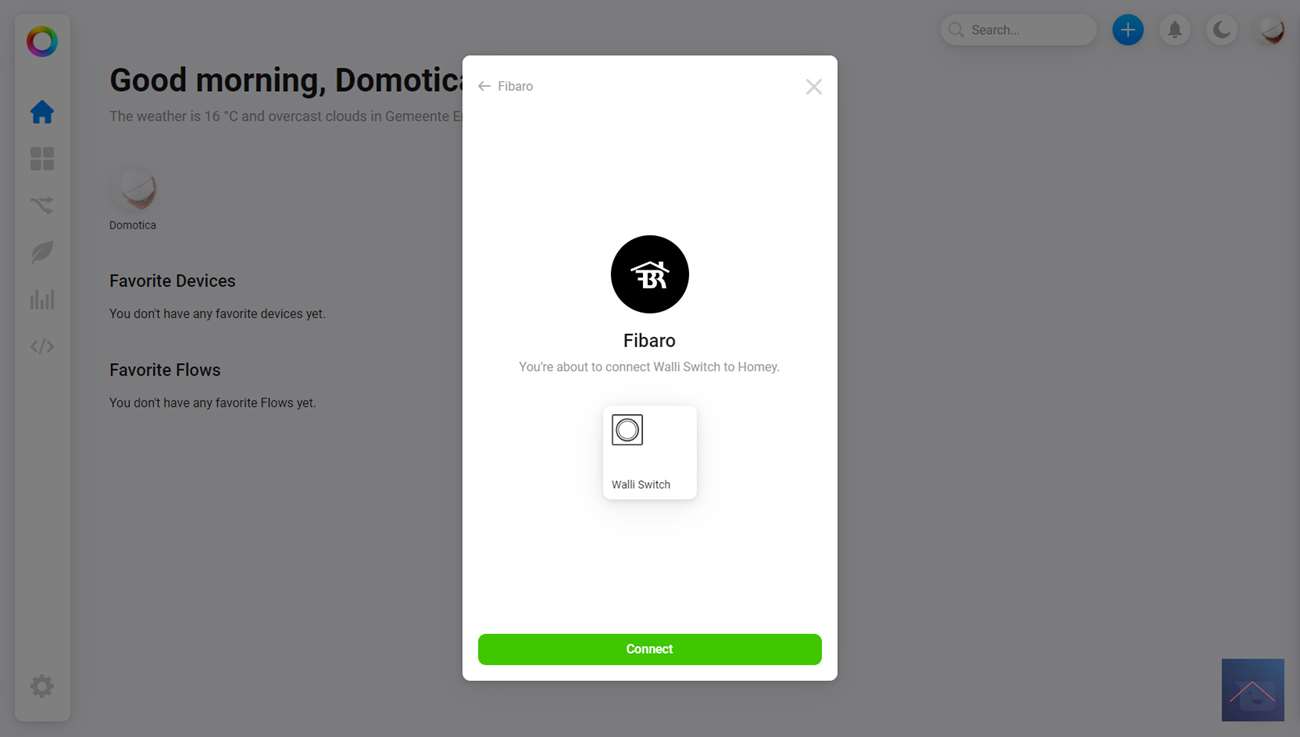 Om hem te installeren gaan we naar my.homey.app (of je gebruikt de APP) en klikken op de plus rechtsboven. We zoeken vervolgens op Fibaro en installeren de APP (als we deze nog niet hebben). Hierna selecteren we de Walli switch en wordt gevraagd om 3x op de knoppen van de Walli te drukken. Als ik dit gedaan heb zie ik de LED geel knipperen en rood worden. Vervolgens druk ik nogmaals 3x op de knop en wordt er om een SDK code gevraagd. Deze staat op de zijkant van de doos. Ik zie weer een gele knipperen maar nu wordt de LED ring paars en ik zie hem toegevoegd aan de Homey.