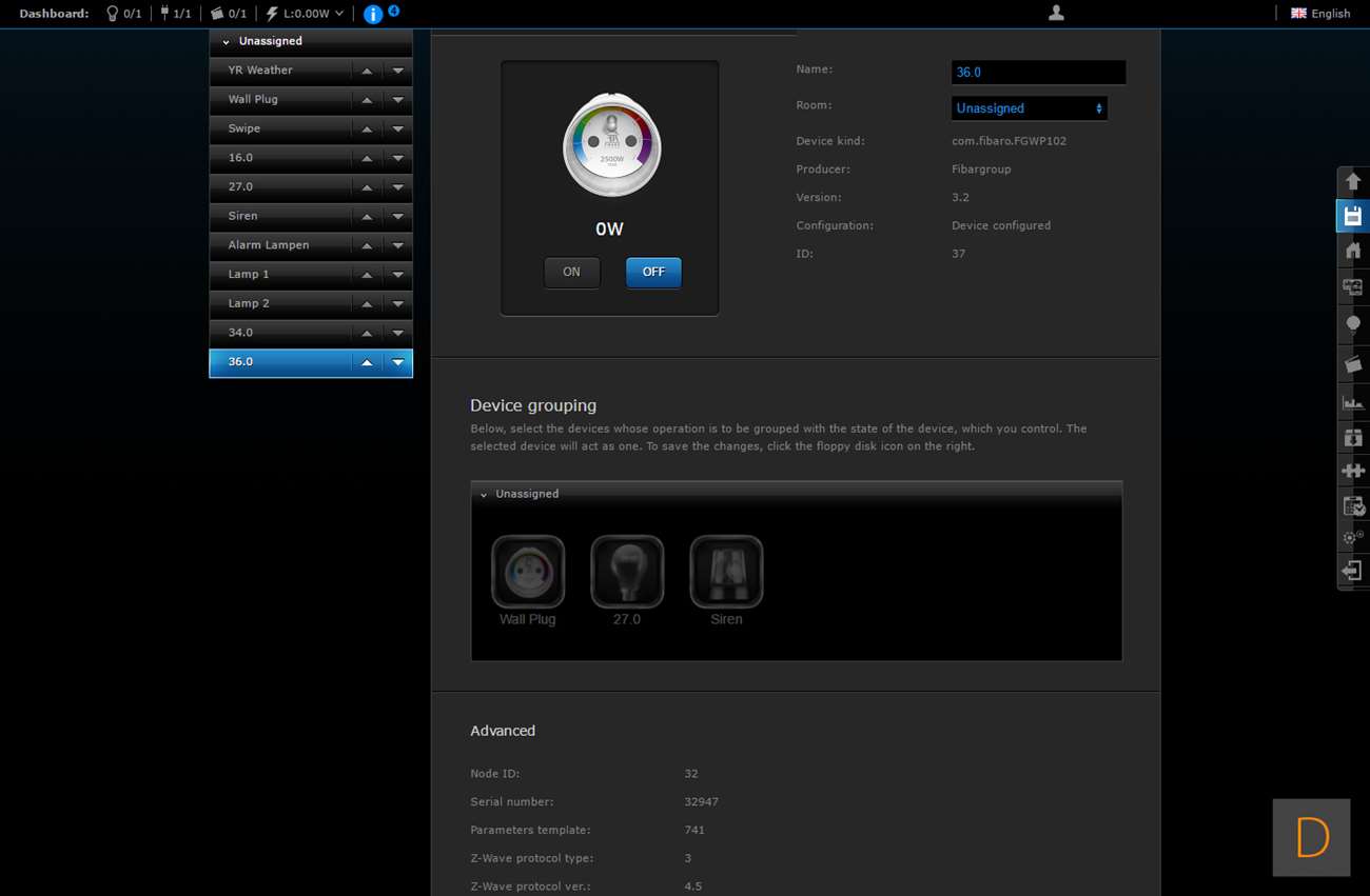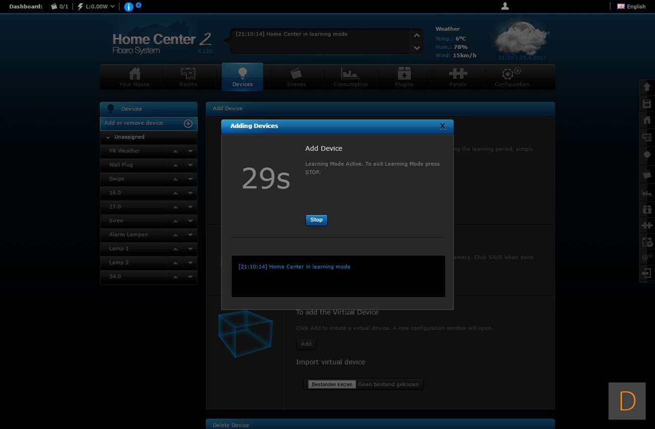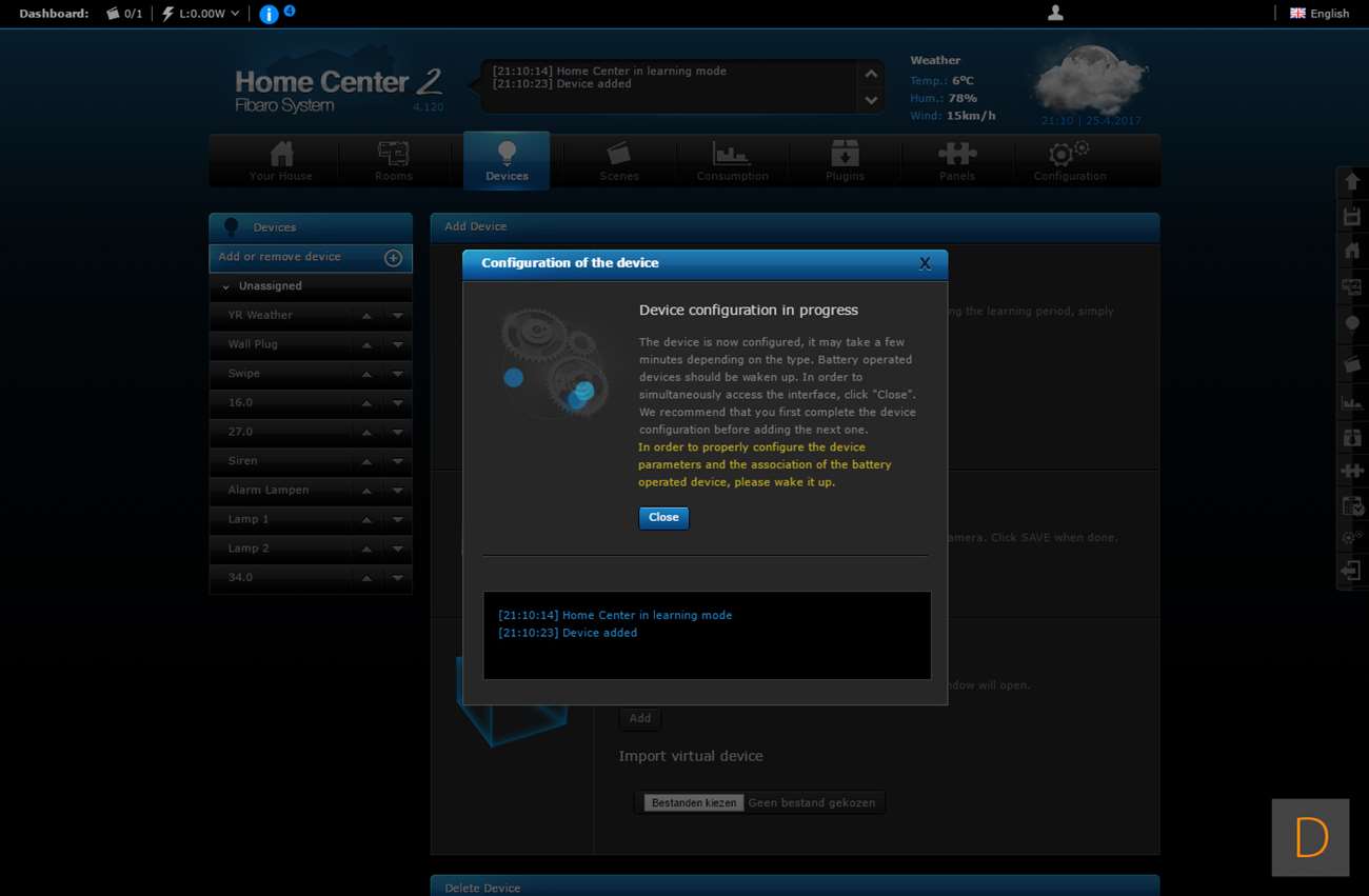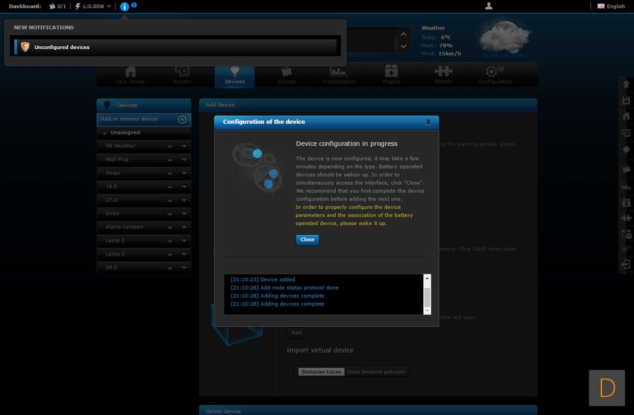 Het toevoegen van deze Wall Plug moet natuurlijk perfect werken via de HC2, het is tenslotte hun eigen product. We gaan zien of dit ook het geval is. Het toevoegen gaat door in te loggen en naar het "devices" gedeelte te gaan. Vervolgens klik je op "add or remove device", en hierna op "add". Het aftellen zal dan beginnen. Vervolgens is het een kwestie van de Wall Plug in het stopcontact te stoppen of 3 keer op het knopje aan de bovenkant te klikken. Hij werd hierna netjes gevonden en toegevoegd. Hij kwam wel met de melding dat er geen template beschikbaar is.