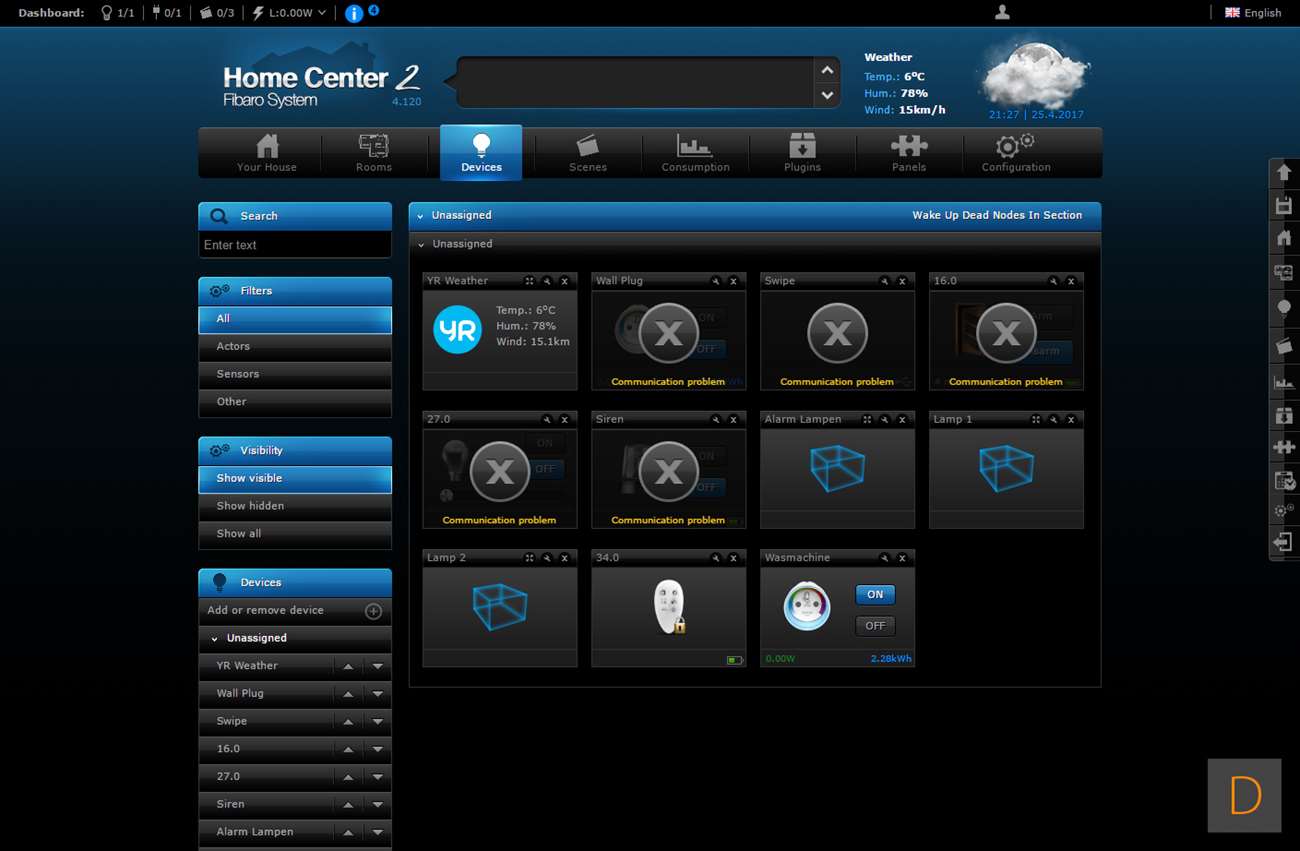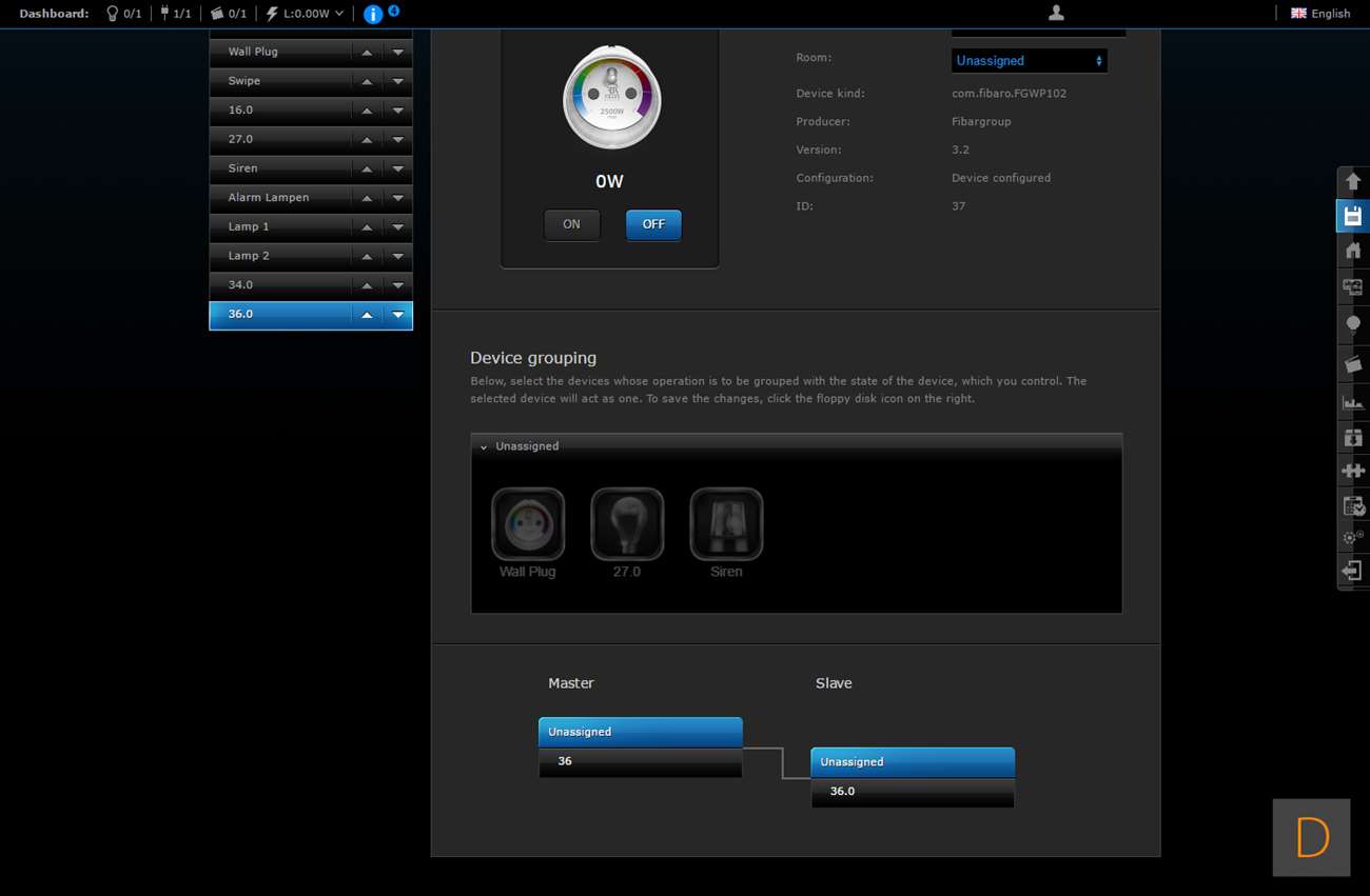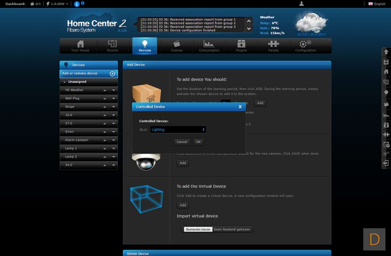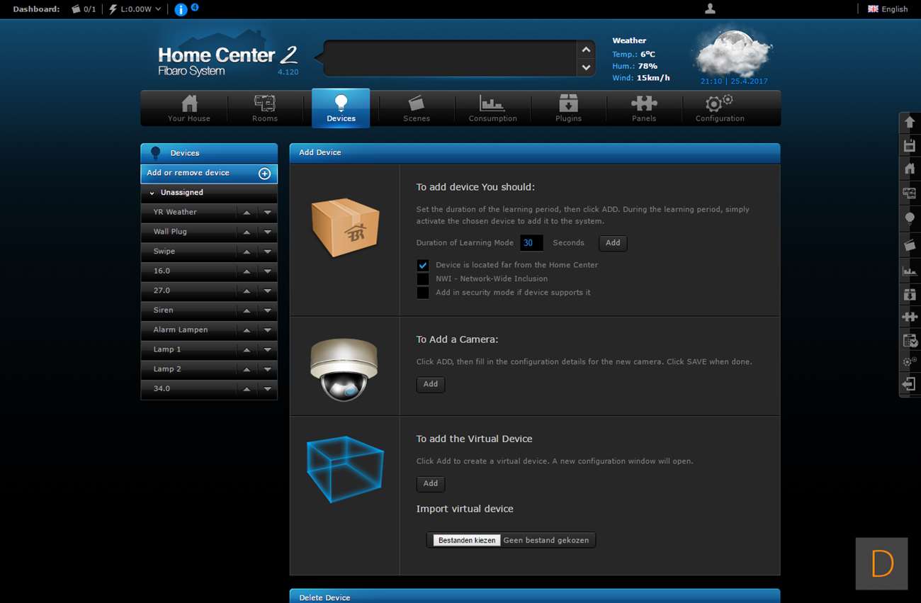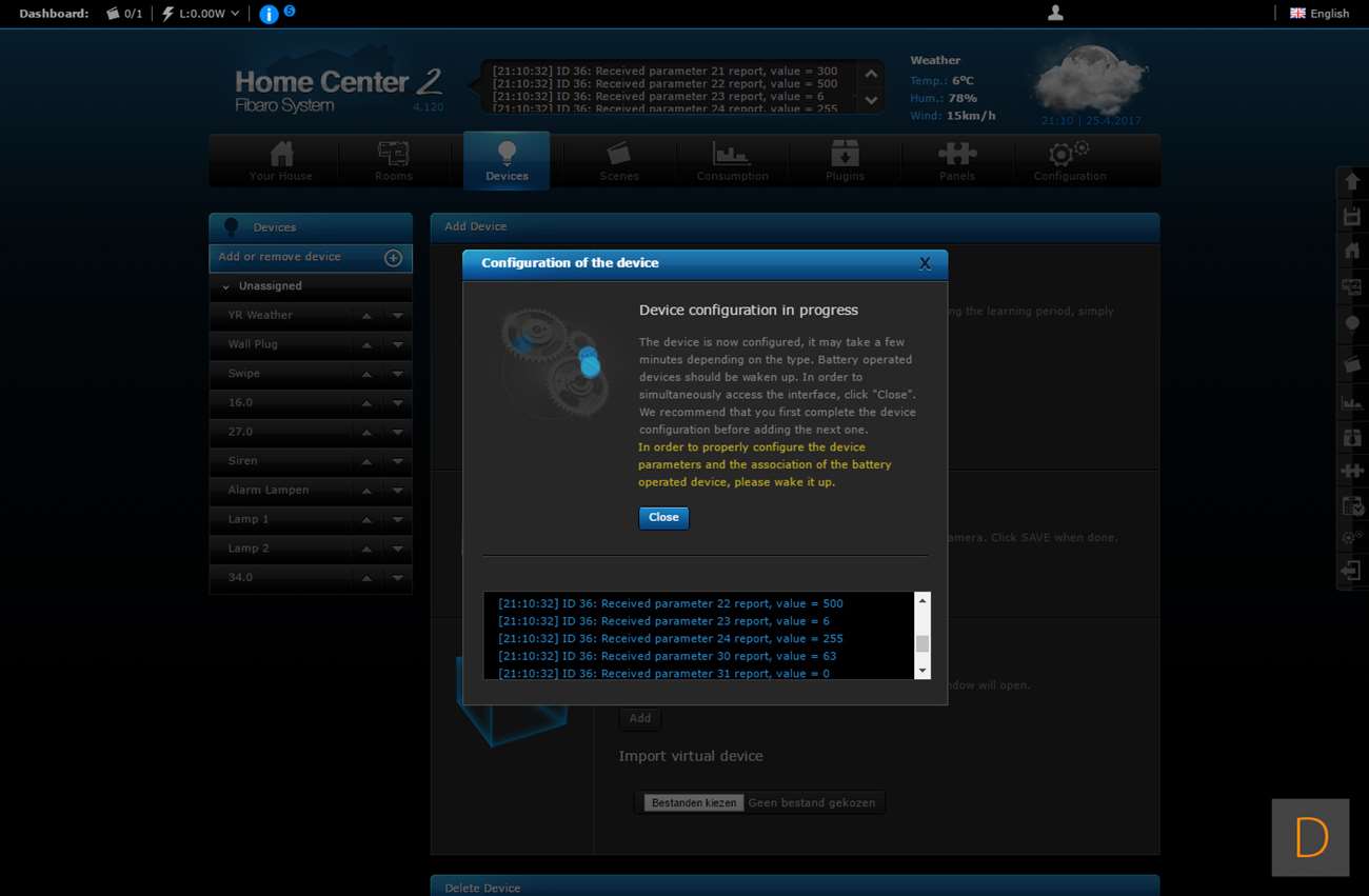 Het toevoegen van deze Wall Plug moet natuurlijk perfect werken via de HC2, het is tenslotte hun eigen product. We gaan zien of dit ook het geval is. Het toevoegen gaat door in te loggen en naar het "devices" gedeelte te gaan. Vervolgens klik je op "add or remove device", en hierna op "add". Het aftellen zal dan beginnen. Vervolgens is het een kwestie van de Wall Plug in het stopcontact te stoppen of 3 keer op het knopje aan de bovenkant te klikken. Hij werd hierna netjes gevonden en toegevoegd. Hij kwam wel met de melding dat er geen template beschikbaar is.