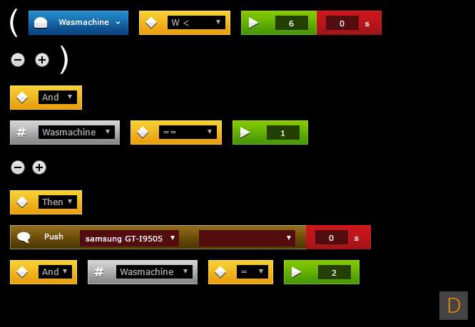 De eerste scene controleert of het gebruik hoger dan 6 W is. Dan gaat de wasmachine namelijk het programma draaien. Ik zet een variabele om dit vast te leggen. Hiermee voorkom je dat de regel onnodig start. Vervolgens kijk ik of het verbruik lager is dan 6 W (hij is dan klaar) en zet ik de variabele weer naar 2, zodat de regel weer opnieuw kan starten als ik weer een wasje draai. Als laatste stuur ik een notificatie naar mijn telefoon.