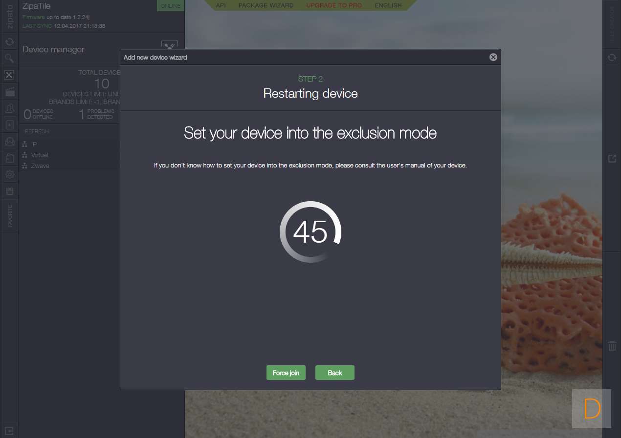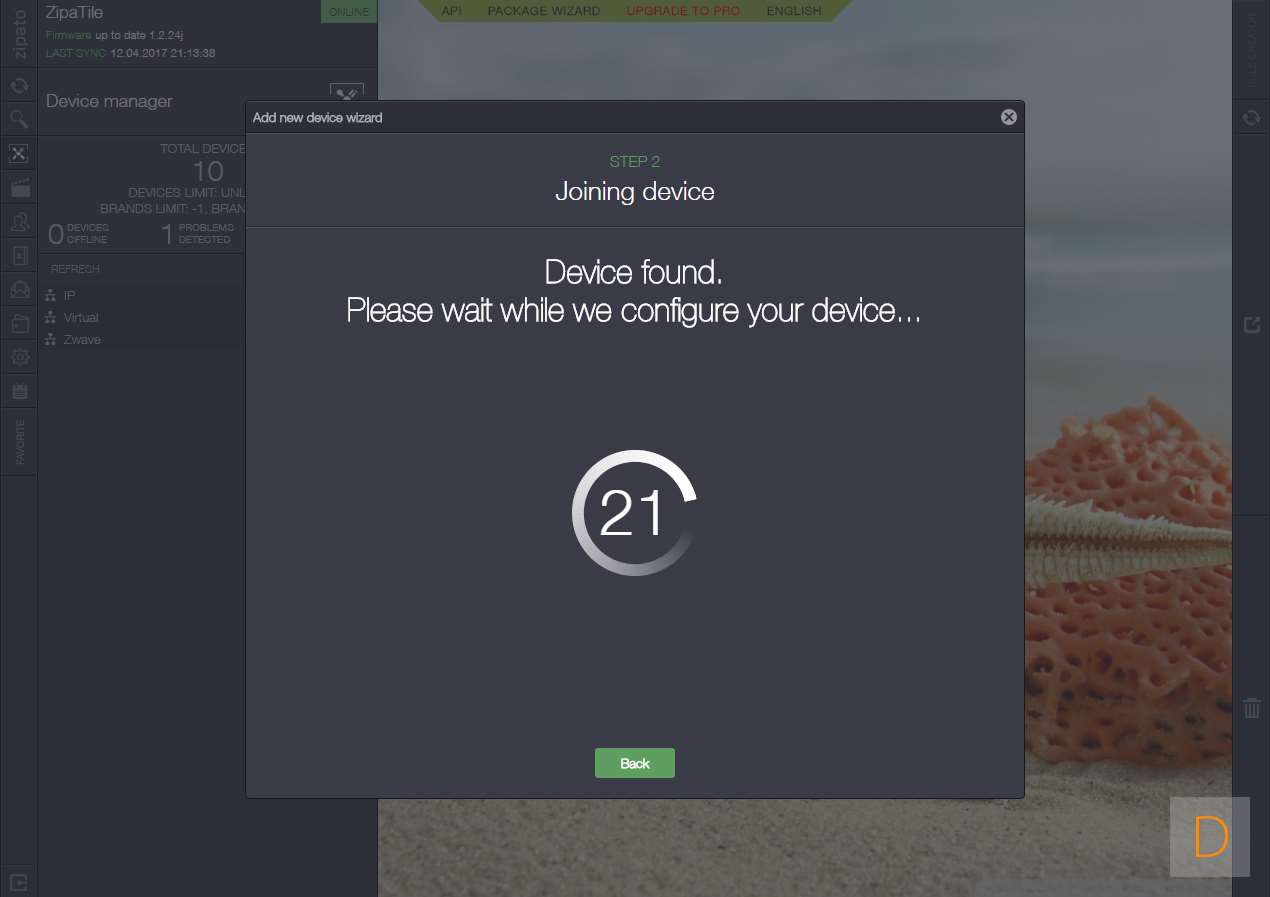Het toevoegen van de Fibaro Wall Plug aan de ZipaTile gaat door in te loggen en naar het apparaten gedeelte te gaan. Hierna klik je op "add device" en klik je op Z-wave. Hierna is het een kwestie van hem in het stopcontact te stoppen, door de auto inclusion zal hij hierna gevonden en toegevoegd worden. De LED zal aan en uit gaan tijdens het toevoegen. Zorg altijd dat je dicht in de buurt bent van de controller.