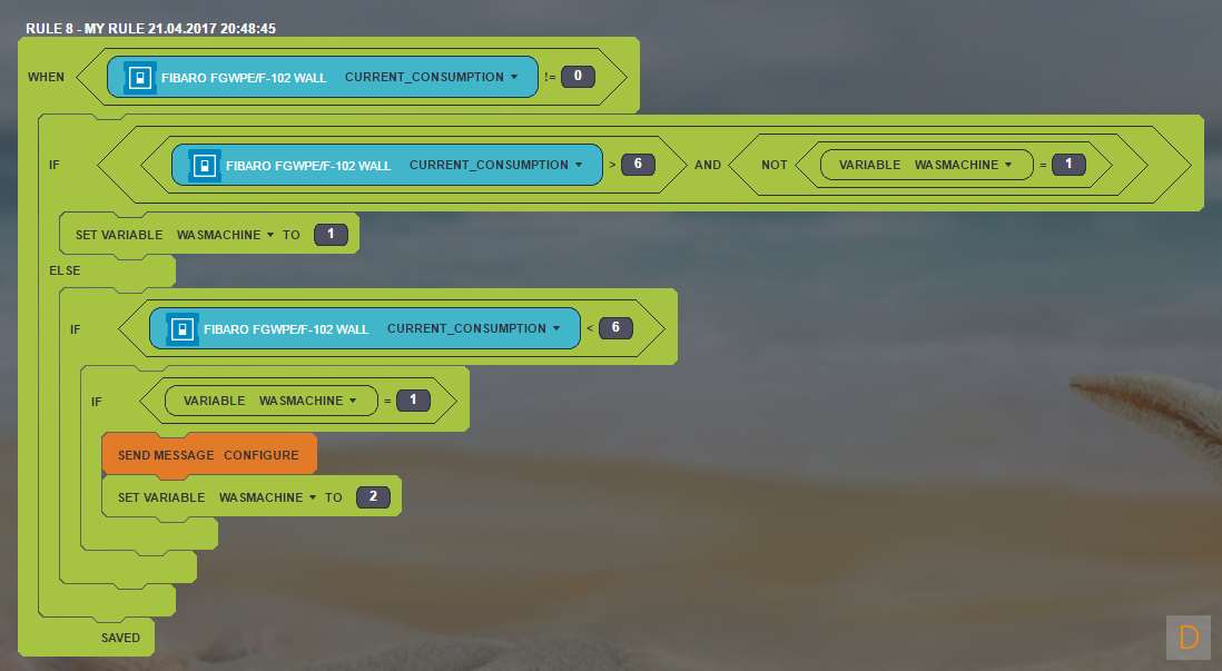 Deze regel controleert of het gebruik hoger dan 6 W is. Dan gaat de wasmachine namelijk het programma draaien. Ik zet een variabele om dit vast te leggen. Hiermee voorkom dat de regel onnodig start. Vervolgens kijk ik of het verbruik lager is dan 6 W (hij is dan klaar) en zet ik de variabele weer naar 2, zodat de regel weer opnieuw kan starten als ik weer een wasje draai. Als laatste stuur ik een notificatie naar mijn telefoon.