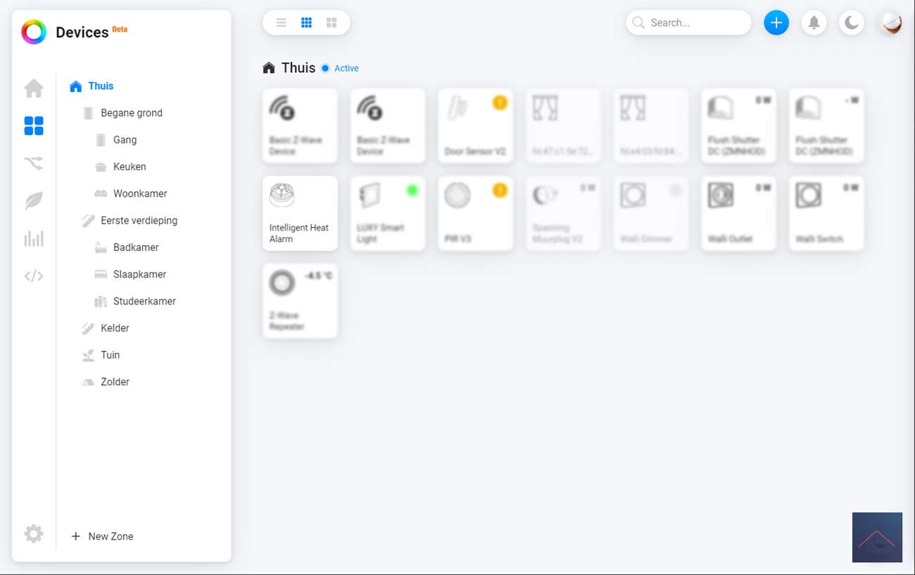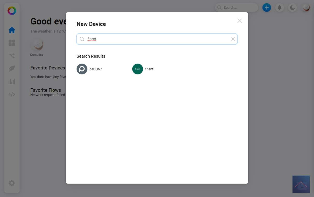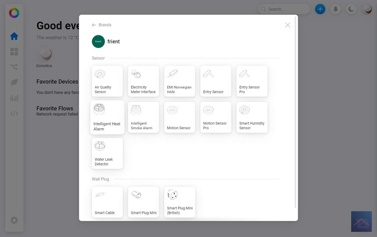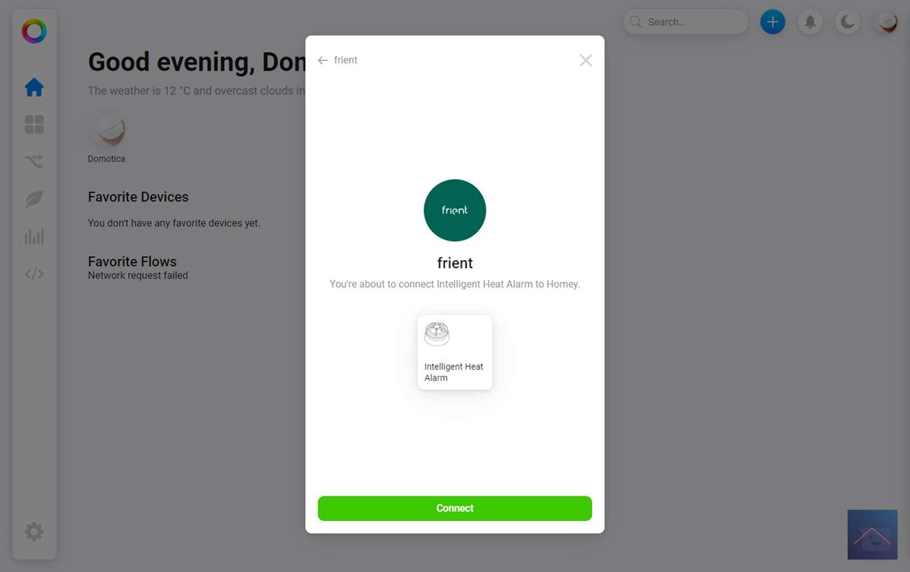 We starten door in te loggen op de webinterface en op het plusje te klikken aan de bovenkant. Vervolgens zoeken we op "Frient" en selecteren het heat alarm.