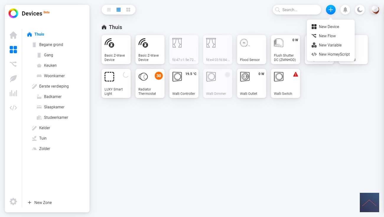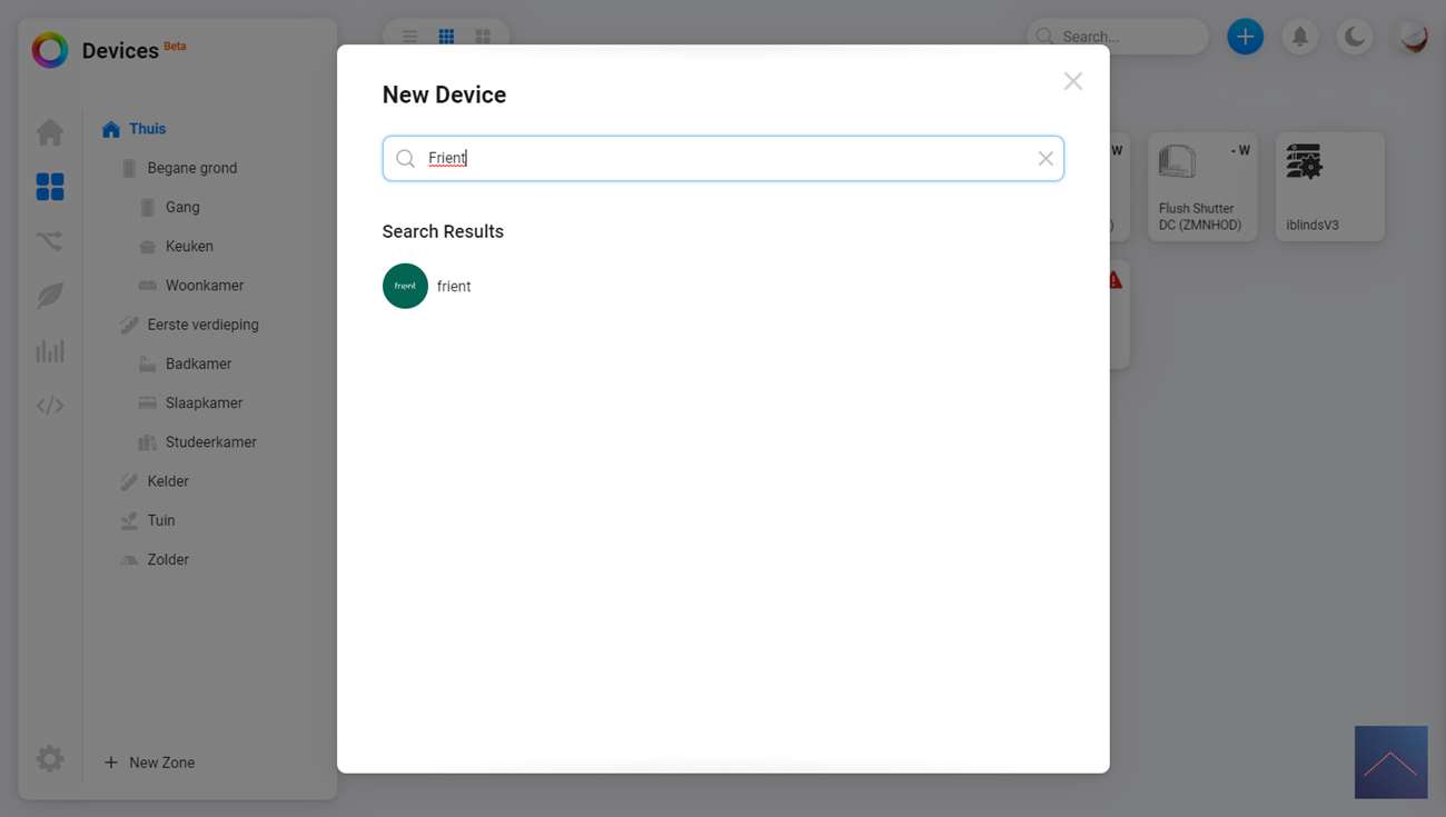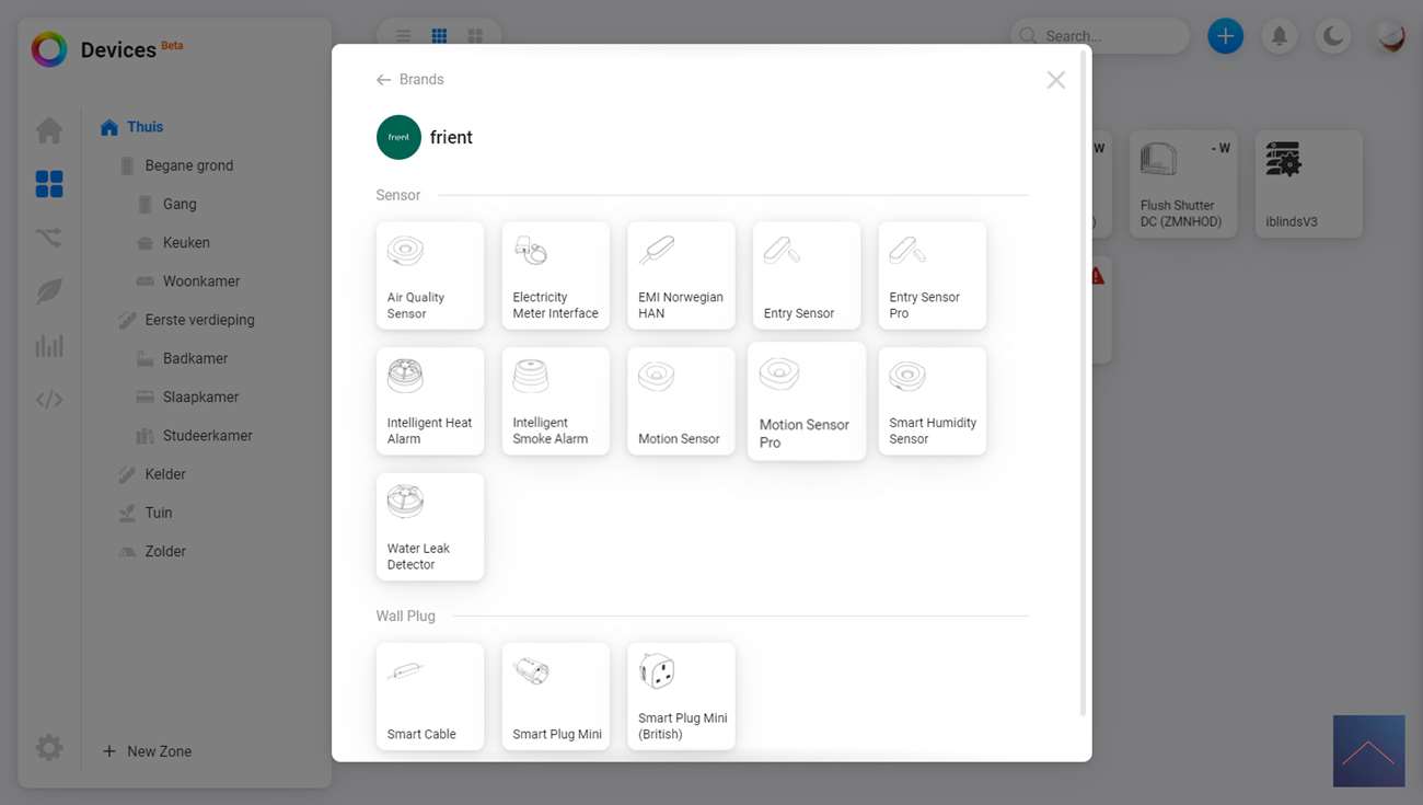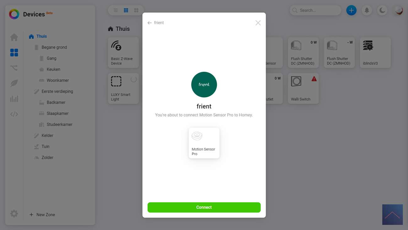 We gaan deze motionsensor natuurlijk ook testen met de Homey. De eerste stap is om hem te voorzien van stroom, hij zal hierna 15 min. lang in de leerstand worden gezet. Nu loggen we in op de Homey via het web-dashboard en gaan naar onze apparaten. We drukken vervolgens op het plusje en zoeken naar Frient, en selecteren de Motion Sensor Pro.
