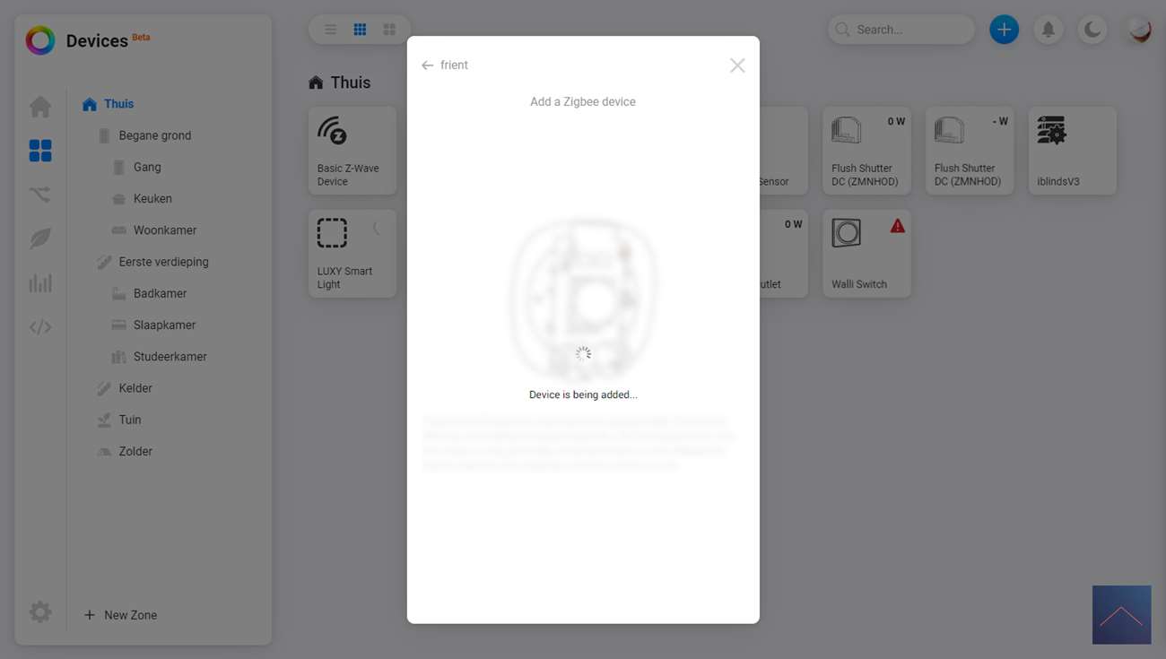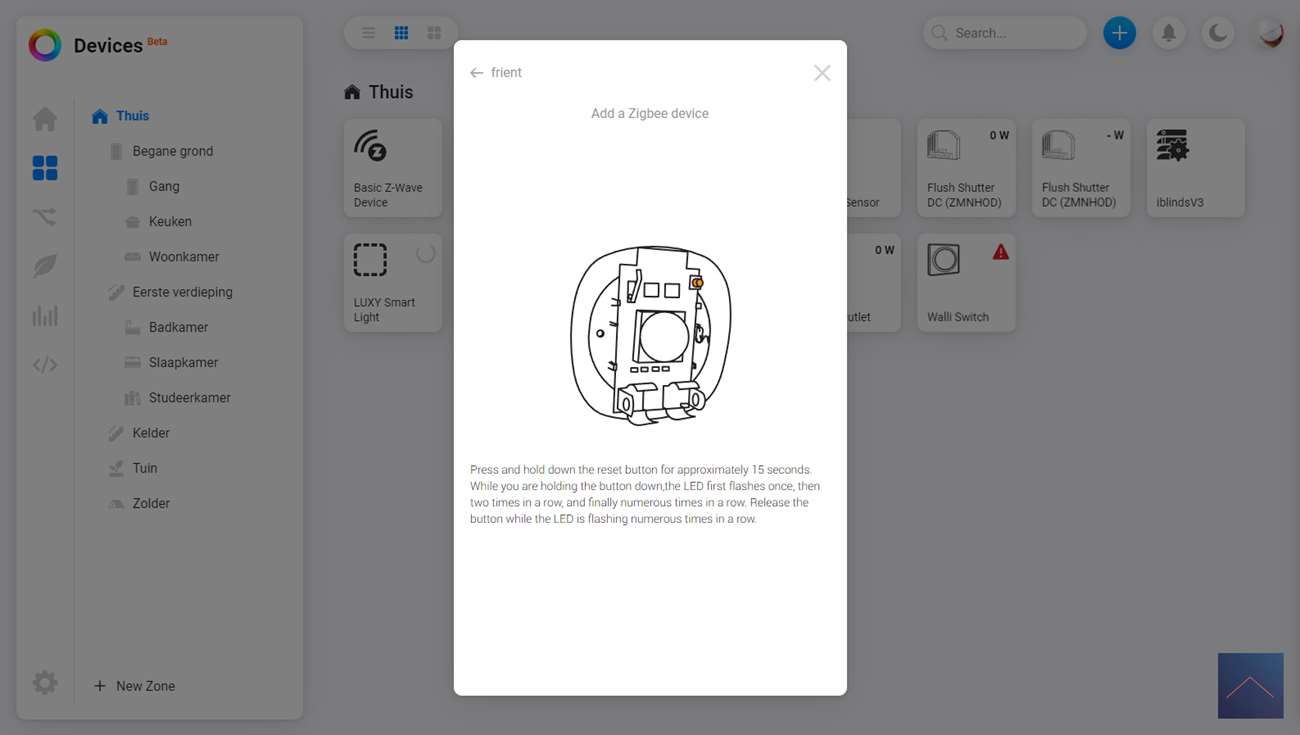 Er wordt gevraagd om het knopje 15 seconden vast te houden aan de binnenkant. In ons geval is dit niet nodig omdat deze sensor nog nergens is toegevoegd. Dit klopt ook want na een paar seconden zien we dat hij gevonden is.