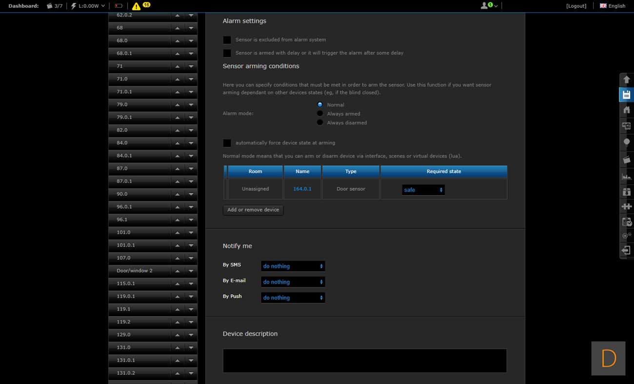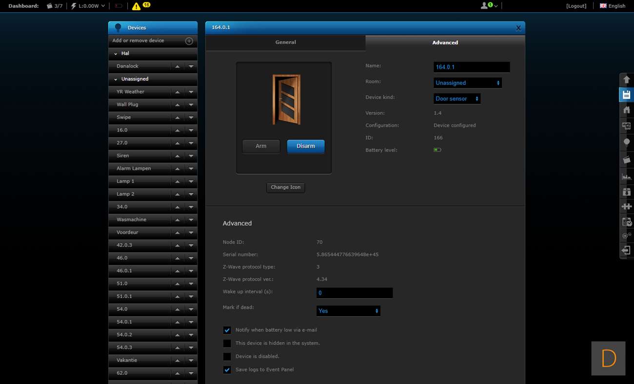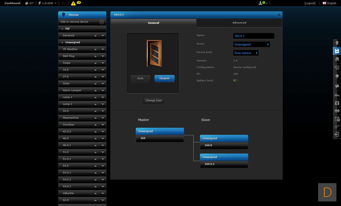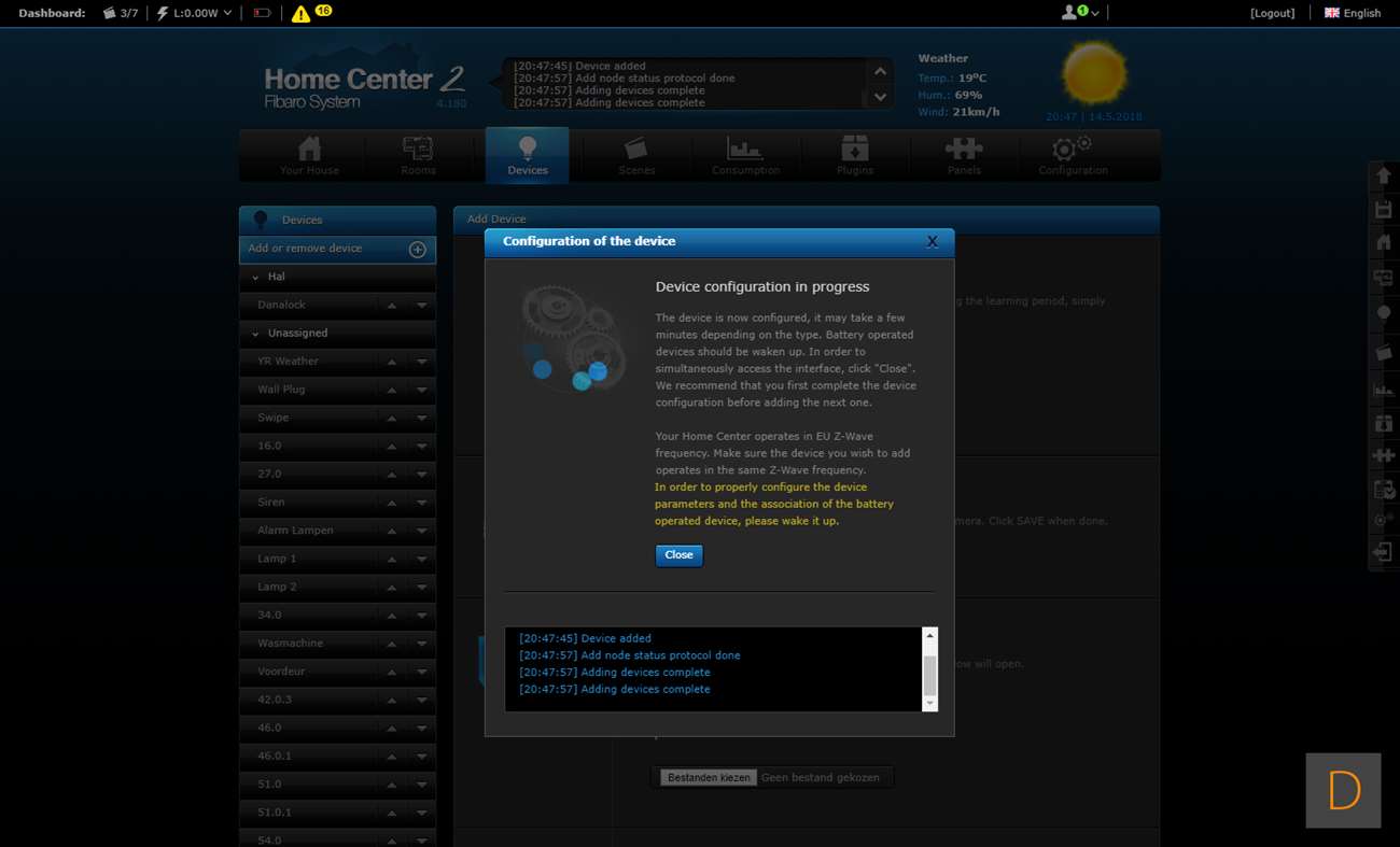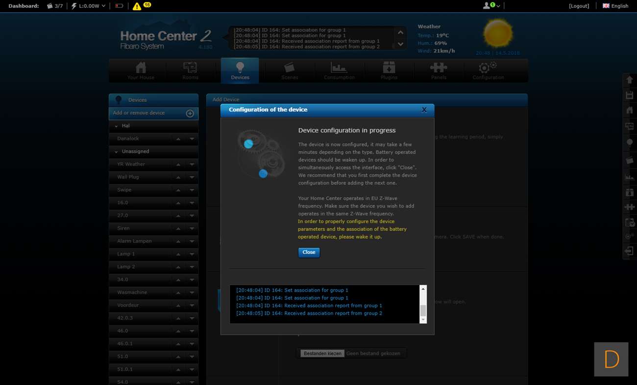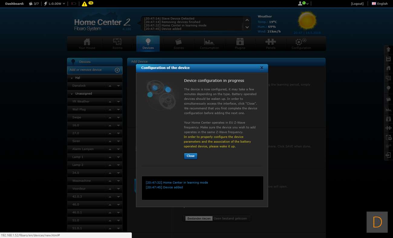 De 3de controller welke wij de sensor op gaan testen is de Fibaro HC2. Om het toevoegen te starten loggen we in en gaan we naar het "Device" gedeelte, vervolgens klikken we op "Add or remove device". Hierna is het een kwestie om op de "Add" knop te klikken het toevoegen zal starten. Om het toevoegen te starten verwijder je de achterkant en plaats je 2 AAA batterijen. Er zijn 2 methodes om hem toe te voegen: beveiligd en niet beveiligd. Wij kiezen voor de eerste optie. Om dit voor elkaar te krijgen hou je de toevoegen knop 3 sec. lang ingedrukt. Het LEDje aan de voorkant zal gaan knipperen (5 sec) en vervolgens 3 sec aanblijven om aan te geven dat het toevoegen is gelukt.