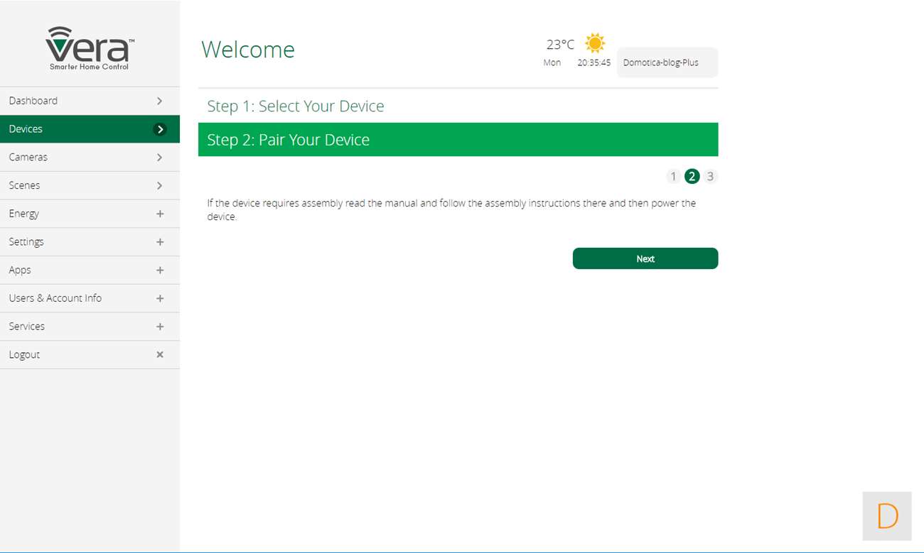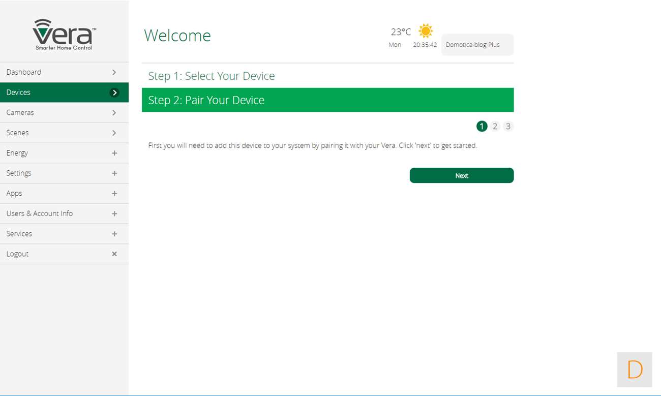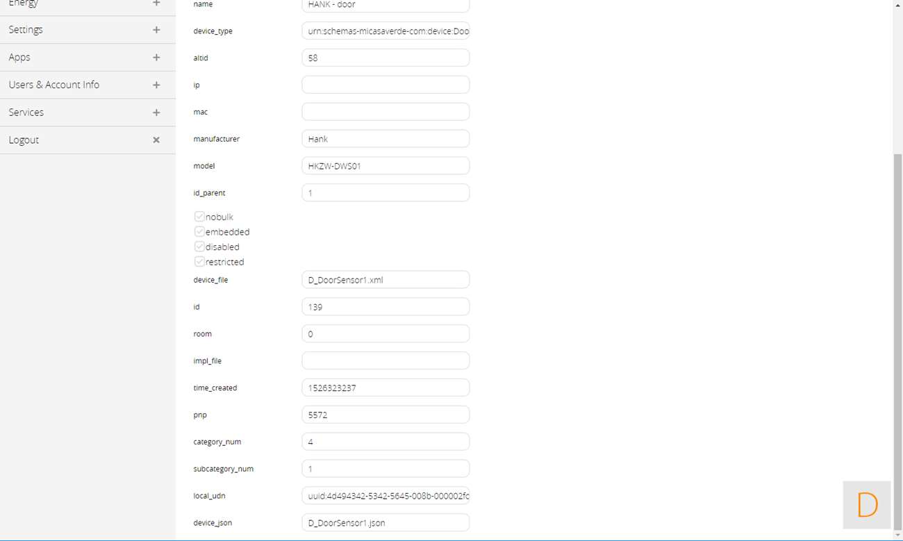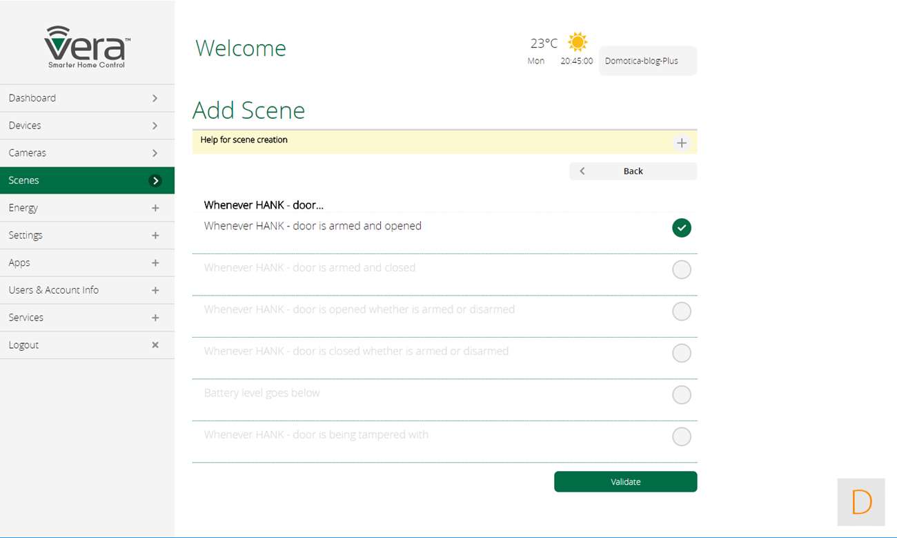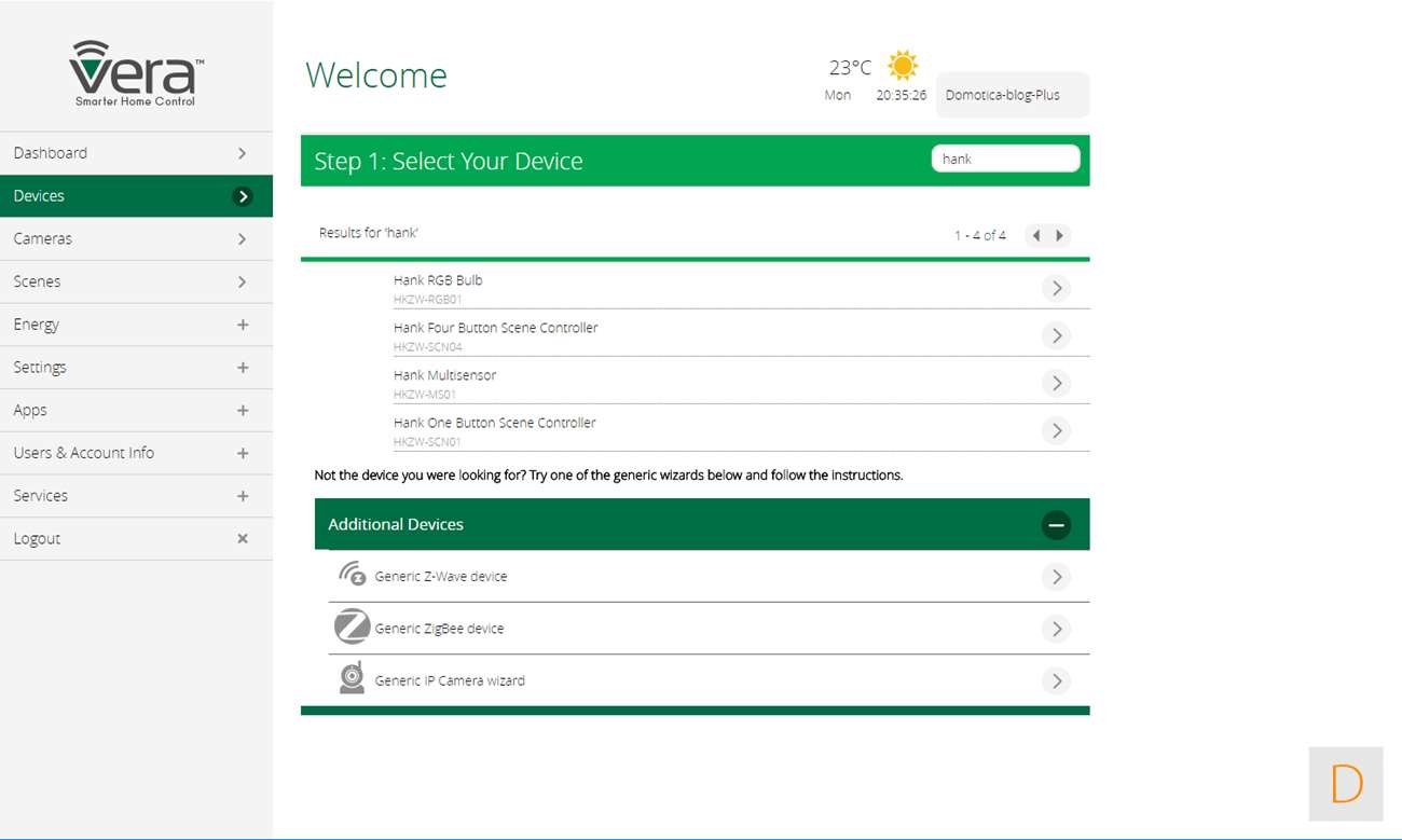 Het toevoegen van deze sensor kun je starten door in te loggen op de Vera en naar de devices te gaan. Vervolgens klik ik op "add device" en zoek ik je HANK op. Helaas zie ik hem niet in het lijstje staan, dus probeer ik hem toe te voegen als generic sensor. Om het toevoegen te starten verwijder je de achterkant en plaats je 2 AAA batterijen. Er zijn 2 methodes om hem toe te voegen: beveiligd en niet beveiligd. Wij kiezen voor de eerste optie. Om dit voor elkaar te krijgen hou je de toevoegen knop 3 sec. lang ingedrukt. Het LEDje aan de voorkant zal gaan knipperen (5 sec) en vervolgens 3 sec aanblijven om aan te geven dat het toevoegen is gelukt. De sensor werd netjes toegevoegd en alles werkt zoals het hoort. Ik zie de sensor en batterij status.
