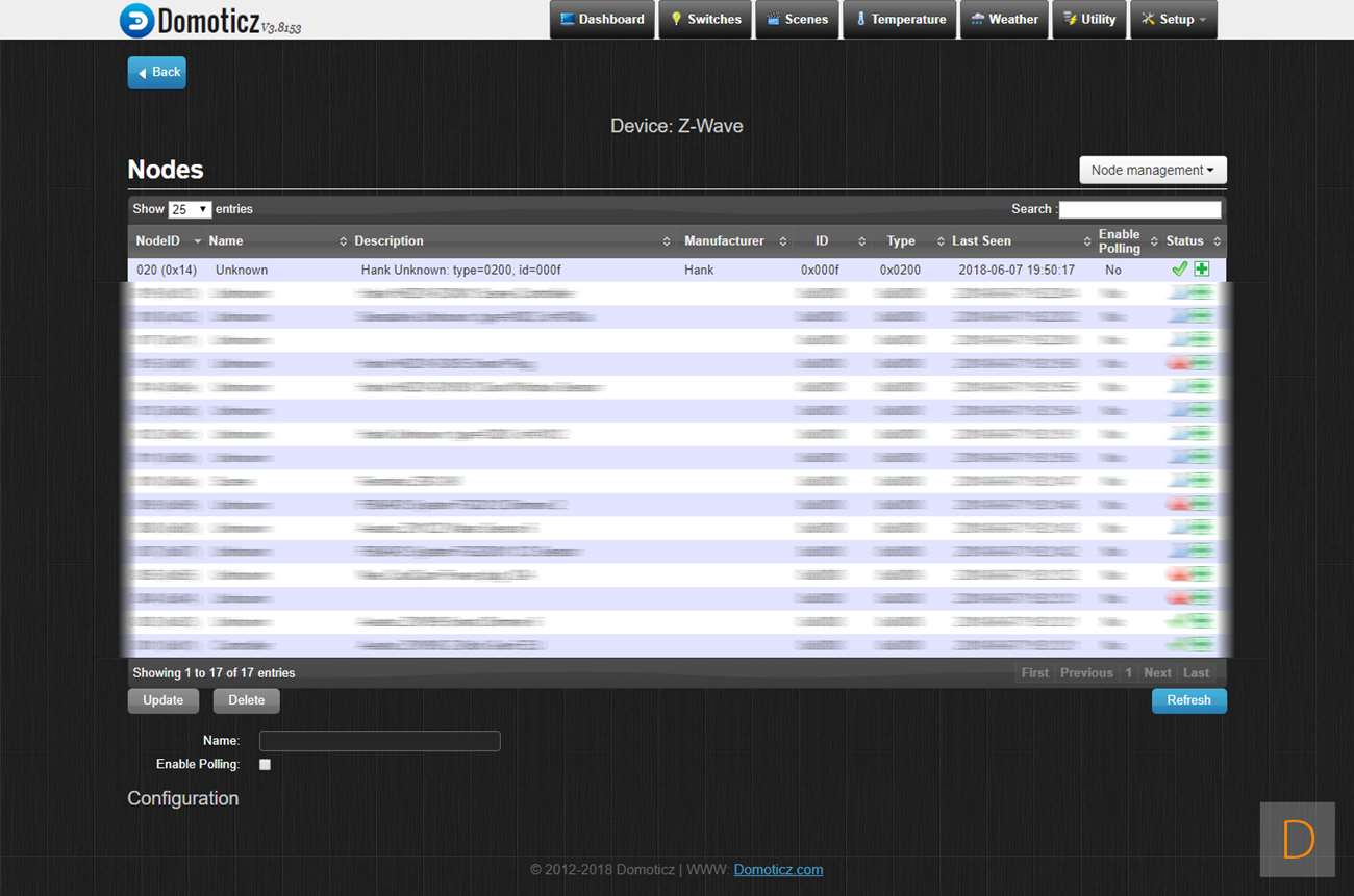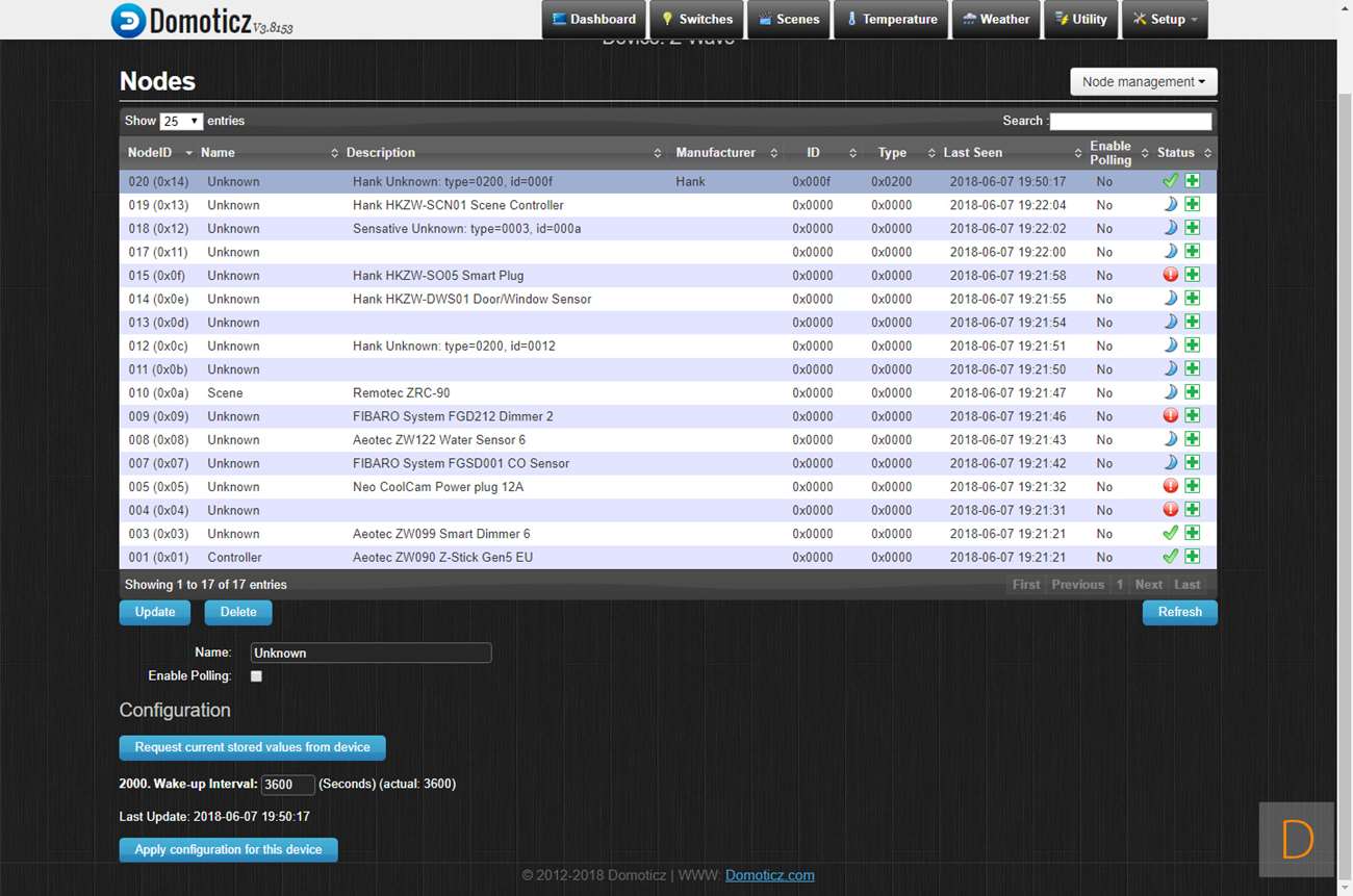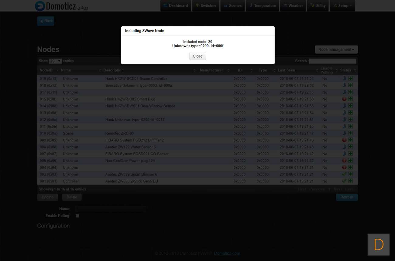 Als laatste controller is Domoticz aan de beurt. Je kunt het toevoegen starten door naar het menu item "setup" en daarna naar "hardware" te gaan. Vervolgens klik je op setup van de Aeon Labs controller en ga je naar include node secure (aan de rechterkant). Hierna verwijder je het lipje bij de batterij en druk je 3x op de button boven de batterij. Het LEDje zal oranje knipperen om aan te geven dat het toevoegen gelukt is. Zorg dat je dichtbij de controller blijft.