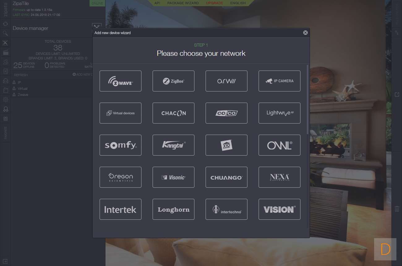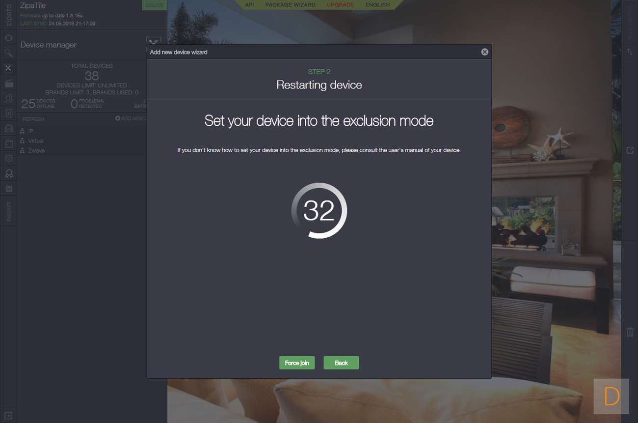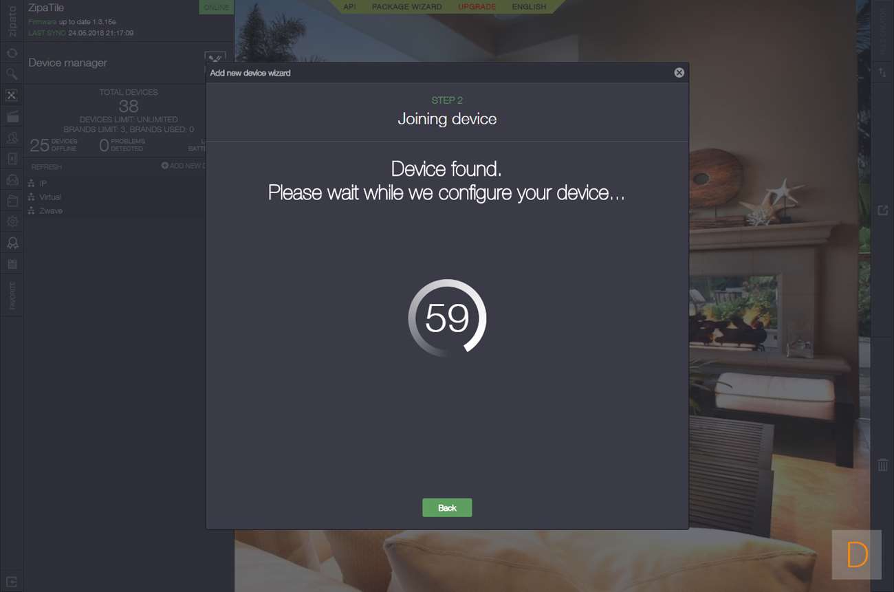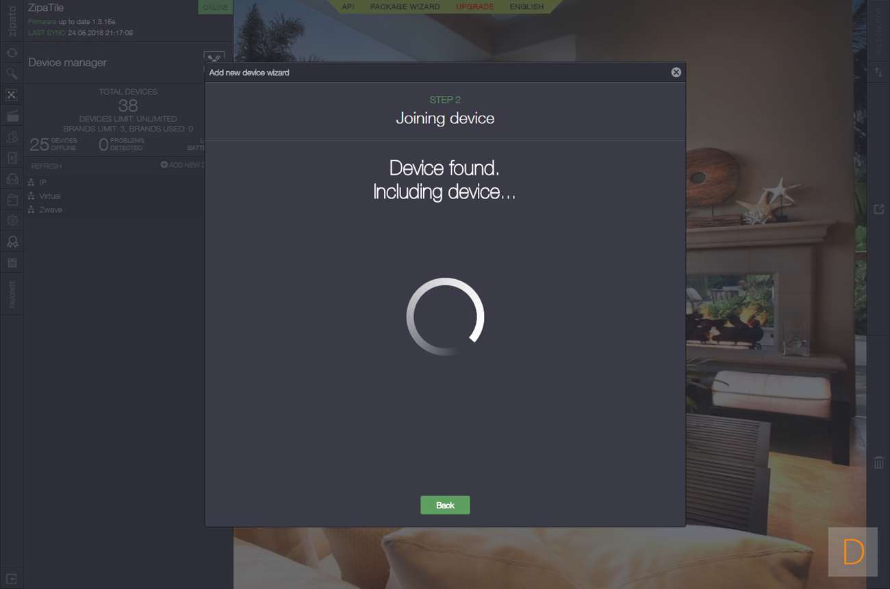 Om het toevoegen te starten op de ZipaTile log ik in op de controller en ga ik naar de device manager. Hierna klik ik op "add new device" en selecteer ik Z-Wave. De volgende stap is: de voorkant van de sensor los draaien en het lipje verwijderen bij de batterij. Druk vervolgens 3x op de button boven de batterij. Het LEDje zal oranje knipperen om aan te geven dat het toevoegen gelukt is. Zorg dat je de sensor dichtbij de controller houdt.
