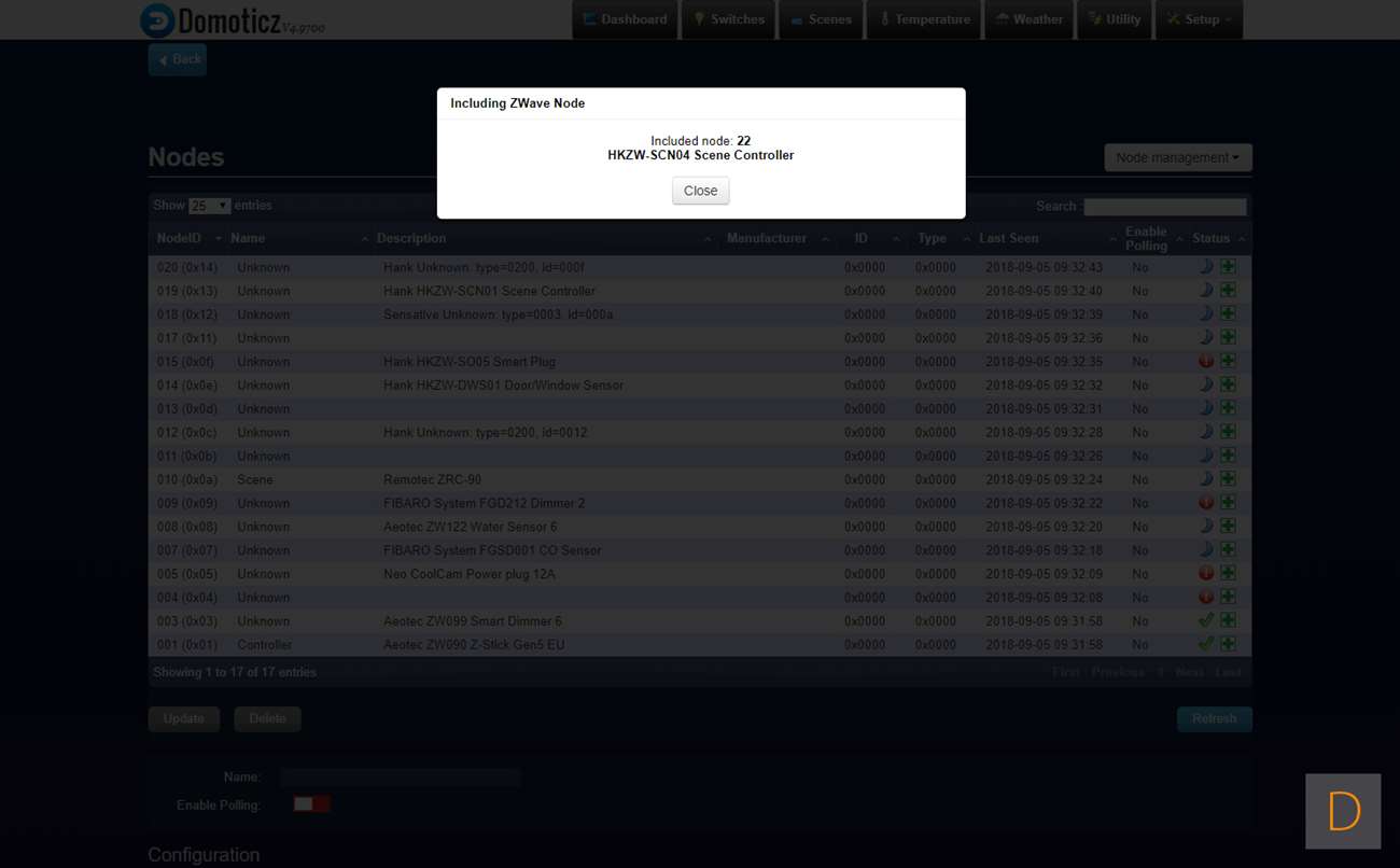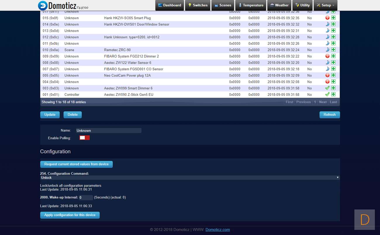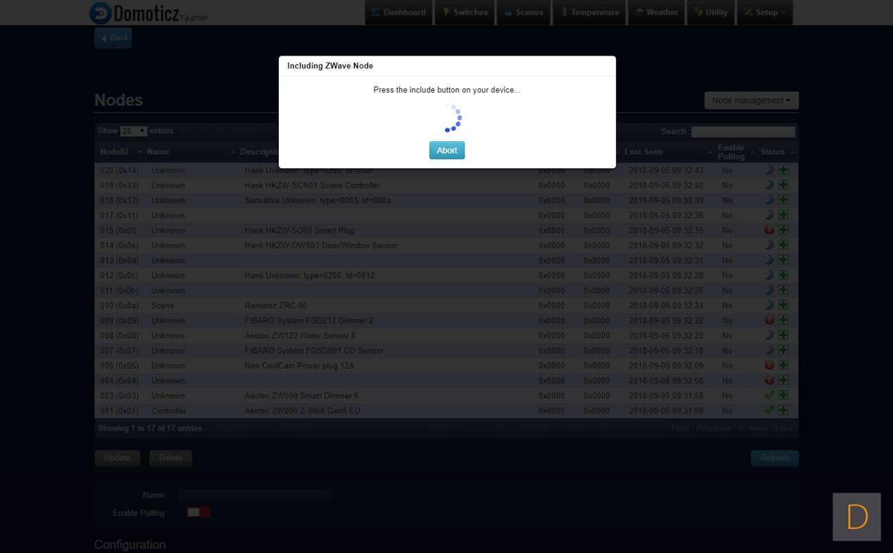 Als laatste controller is Domoticz aan de beurt. Je kunt het toevoegen starten door naar het menu item "setup" en daarna naar "hardware" te gaan. Vervolgens klik je op setup van de Aeon Labs controller en ga je naar include node secure (aan de rechterkant). Hierna verwijder je het lipje bij de batterij en druk je 3x op de button. Het LEDje aan de voorkant zal blauw knipperen om hierna 5 sec. lang aan te blijven om aan te geven dat het toevoegen gelukt is. Zorg dat je dichtbij de controller blijft.