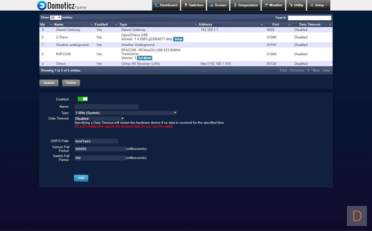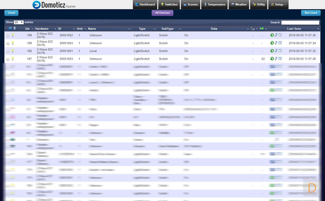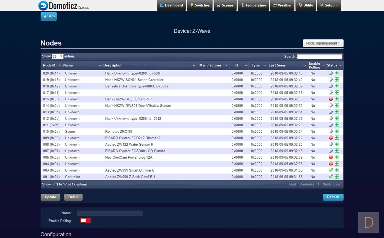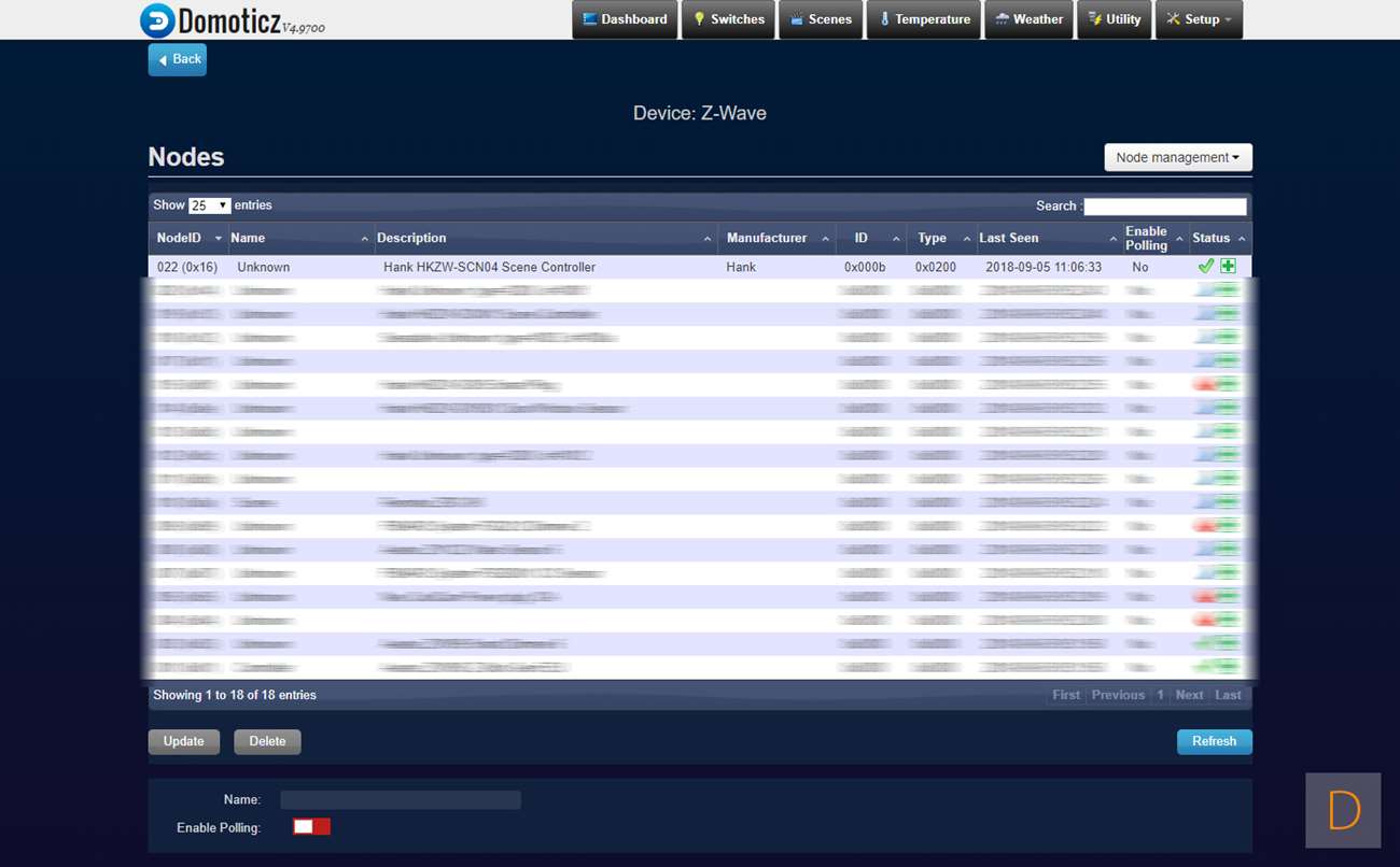 Als laatste controller is Domoticz aan de beurt. Je kunt het toevoegen starten door naar het menu item "setup" en daarna naar "hardware" te gaan. Vervolgens klik je op setup van de Aeon Labs controller en ga je naar include node secure (aan de rechterkant). Hierna verwijder je het lipje bij de batterij en druk je 3x op de button. Het LEDje aan de voorkant zal blauw knipperen om hierna 5 sec. lang aan te blijven om aan te geven dat het toevoegen gelukt is. Zorg dat je dichtbij de controller blijft.