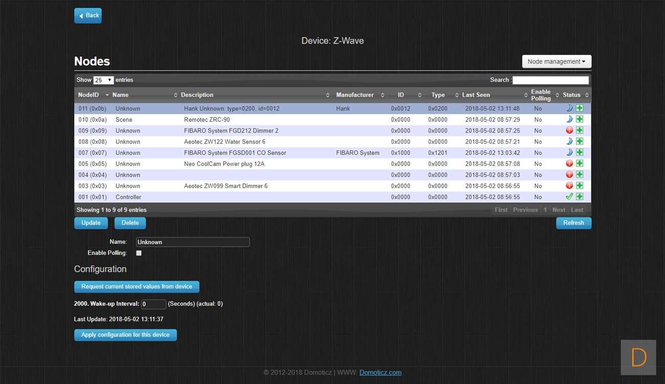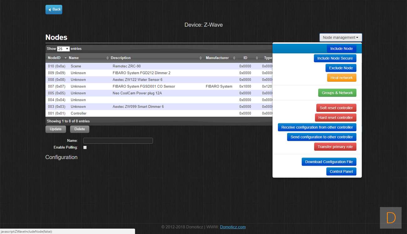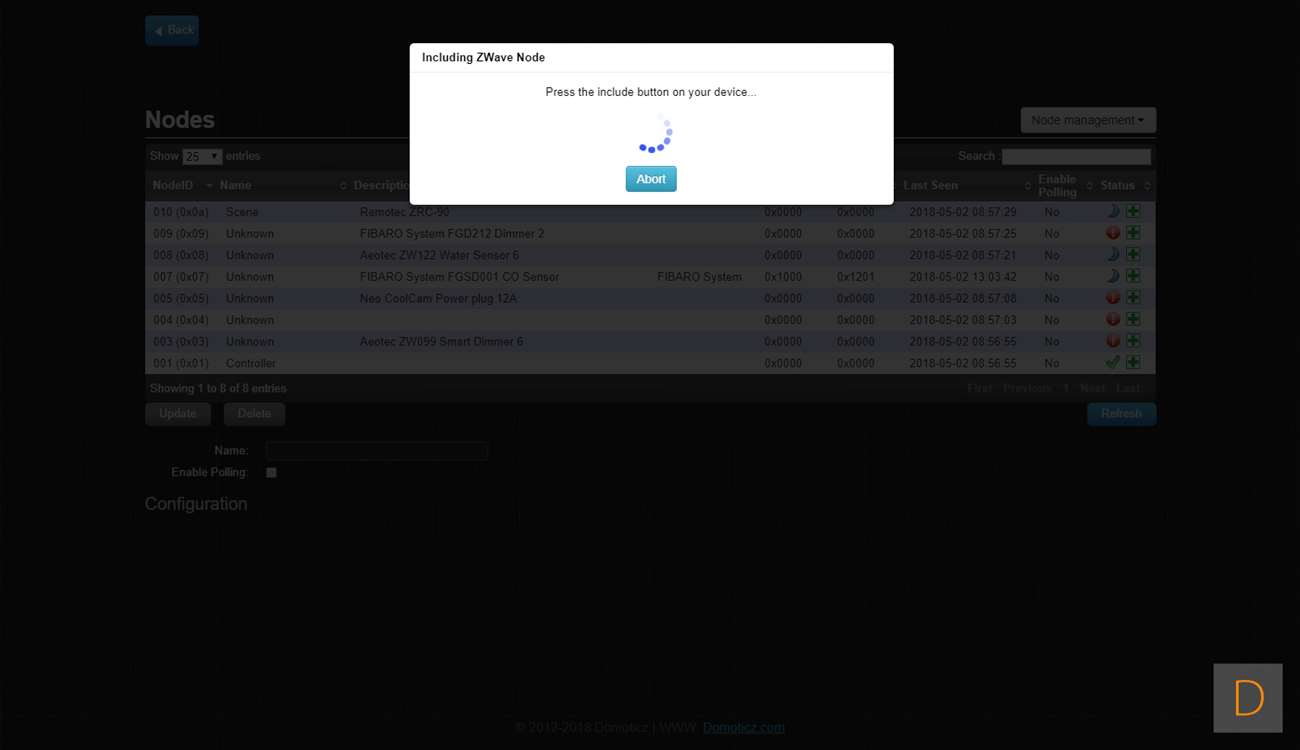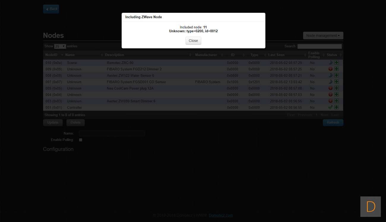 Je kunt de Motion Sensor toevoegen door naar Setup en hardware te gaan. Ik voeg hem via de Aeon Labs Z-Wave USB stick toe: dus klik ik daar op setup. Vervolgens ga ik naar rechterkant en klik in het menu op "include node". Hierna open je de sensor door deze open te draaien, vervolgens verwijder je het lipje bij de batterij. Om het toevoegen te starten druk je 3x op het knopje onder de batterij. De LED zal gaan knipperen om aan te geven dat hij aan het toevoegen is. Hij werd gevonden door Domoticz maar helaas als onbekend apparaat. Ik zie wel bij de device manager de juist nodes staan, dus alles lijkt wel goed toegevoegd. Helaas lukt het niet om bewegingen te registeren. Verder testen heeft dus geen zin.