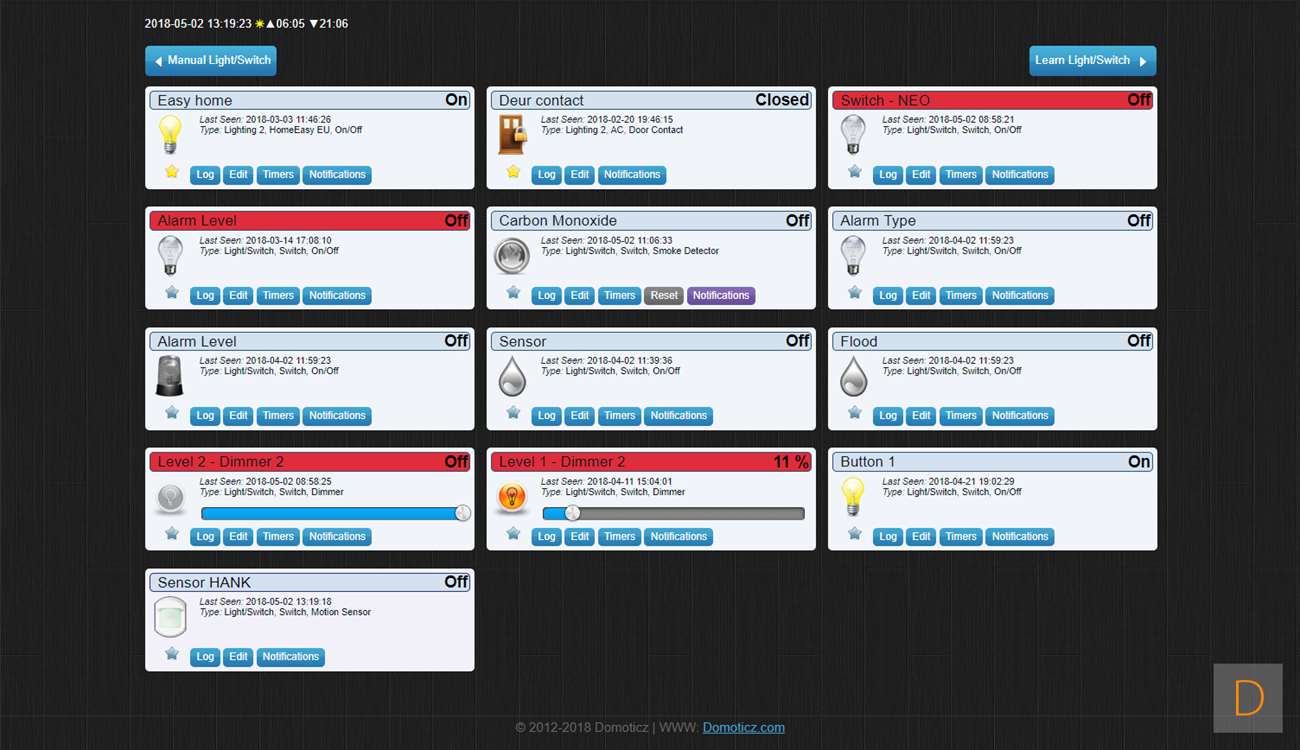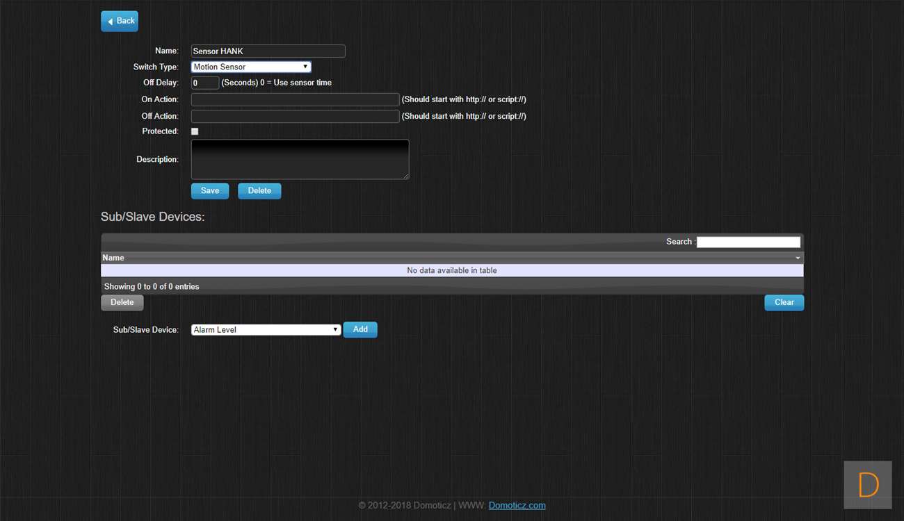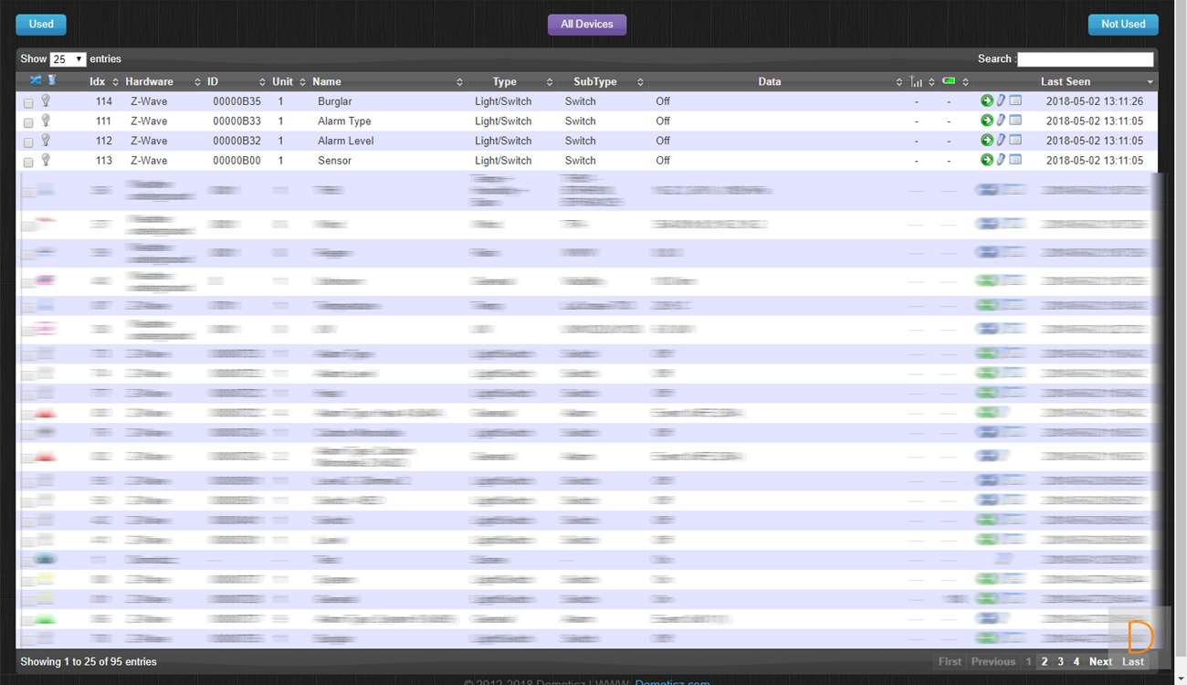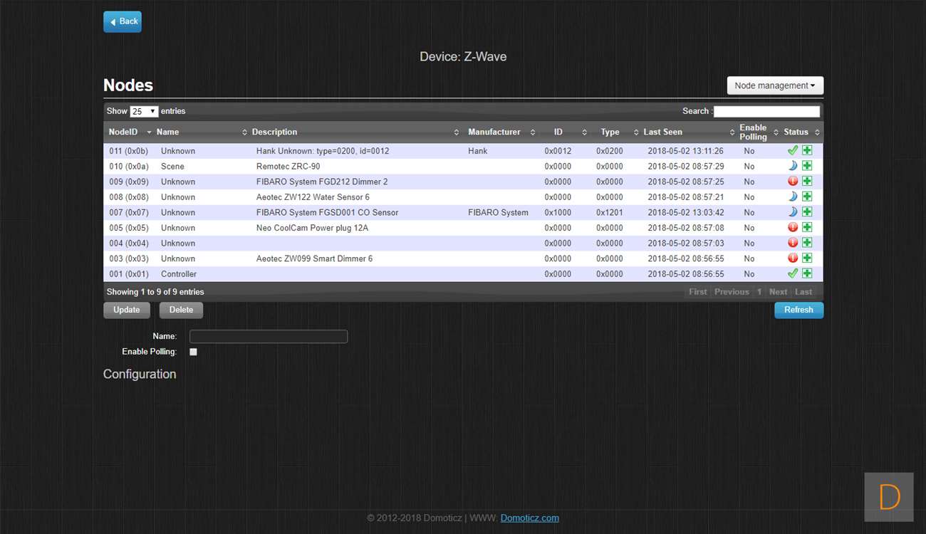 Je kunt de Motion Sensor toevoegen door naar Setup en hardware te gaan. Ik voeg hem via de Aeon Labs Z-Wave USB stick toe: dus klik ik daar op setup. Vervolgens ga ik naar rechterkant en klik in het menu op "include node". Hierna open je de sensor door deze open te draaien, vervolgens verwijder je het lipje bij de batterij. Om het toevoegen te starten druk je 3x op het knopje onder de batterij. De LED zal gaan knipperen om aan te geven dat hij aan het toevoegen is. Hij werd gevonden door Domoticz maar helaas als onbekend apparaat. Ik zie wel bij de device manager de juist nodes staan, dus alles lijkt wel goed toegevoegd. Helaas lukt het niet om bewegingen te registeren. Verder testen heeft dus geen zin.