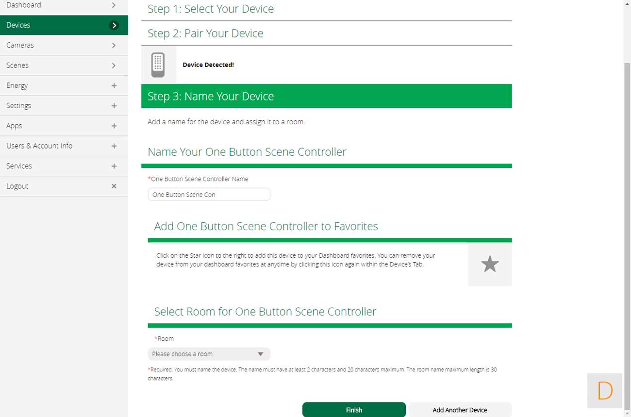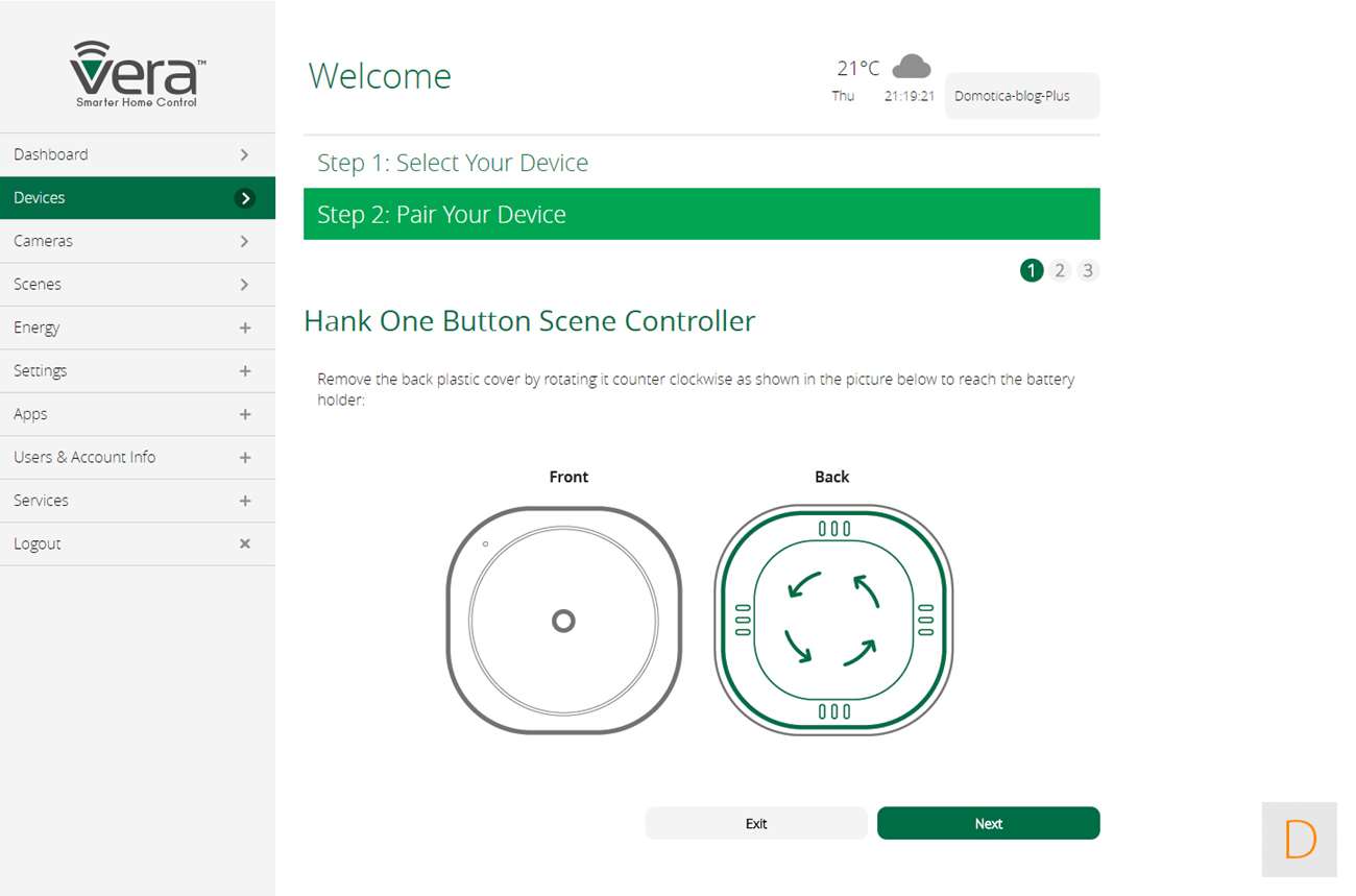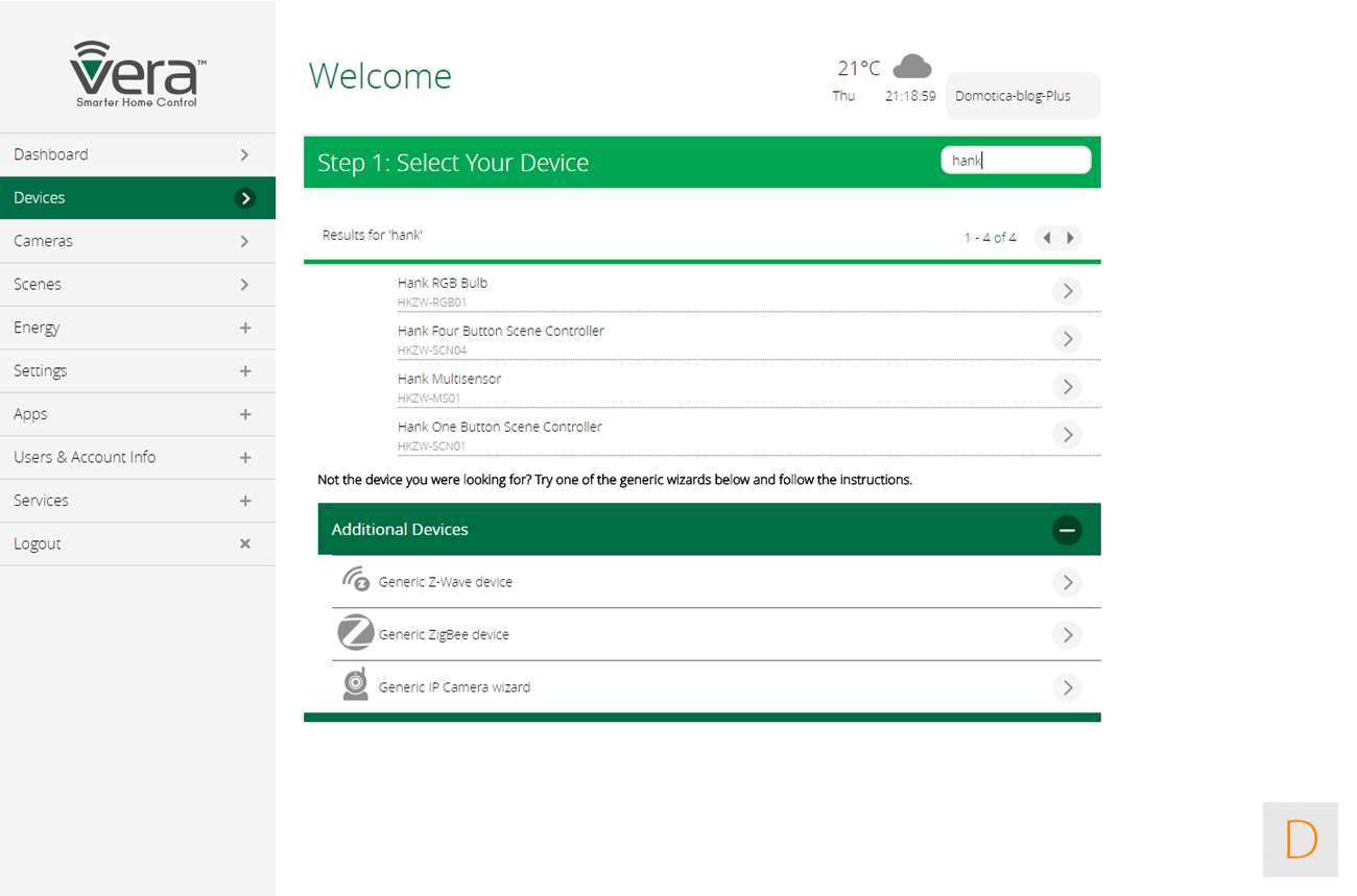 Om de button toe te voegen log je in en ga je naar het device gedeelte. Vervolgens klik je op "add device" en zoek je de HANK op. Voor de verandering zie ik het juiste apparaat er tussen staan. Na het starten van de leer modus verwijder ik de achterkant van de sensor om de batterij te plaatsen. Ik druk hierna 3x op de button. Het LEDje aan de voorkant zal blauw knipperen om hierna 5 sec. lang aan te blijven om aan te geven dat het toevoegen gelukt is. Zorg dat je dichtbij de controller blijft.