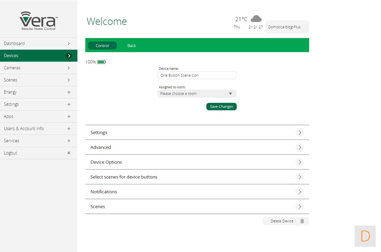 Om te zorgen dat een knop reageert op een klik, gaat iets anders dan bij de andere controllers. Om dit te regelen maak je eerst een scene met wat je aan wilt zetten. Vervolgens ga je naar configuratie van de button en selecteer je daar de scene.