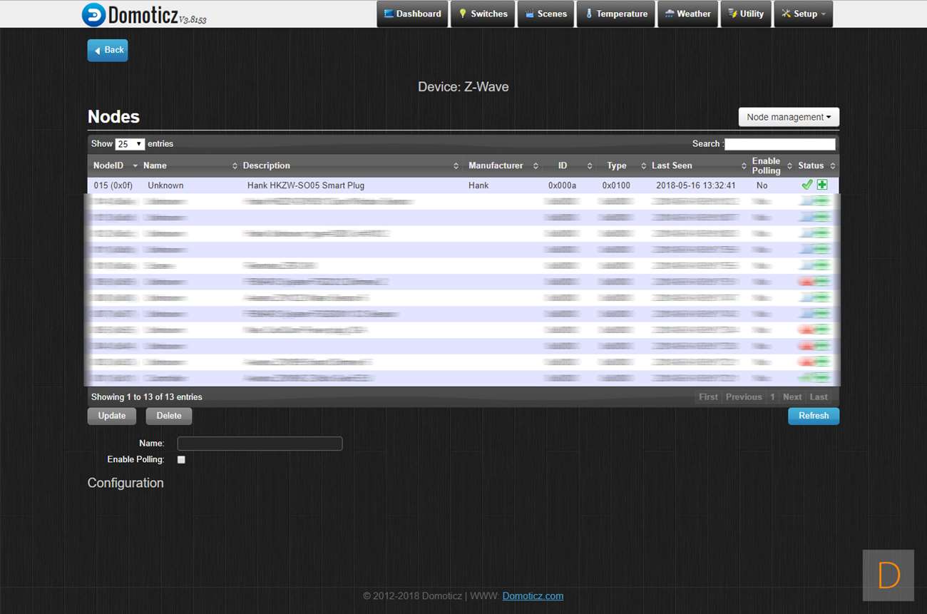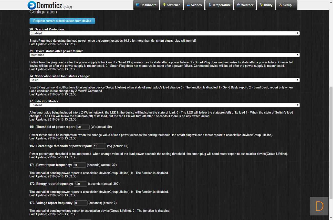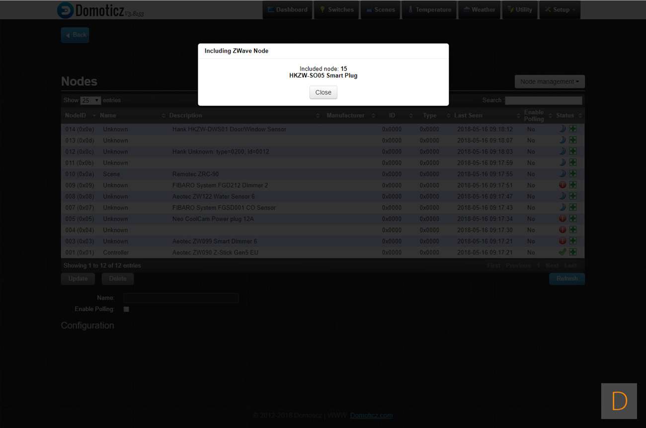 Zoals gewoonlijk is de Domoticz als laatste aan de beurt. Om het toevoegen te starten ga je naar het menu item Setup en hierna naar Hardware vervolgens klik je op Setup. Aan de rechterkant vind je een menuutje waar je klikt op "include node secure". Om hem beveiligd toe te voegen hou je de knop aan de voorkant van de plug 3 seconden lang ingedrukt. De LED ring zal 3x groen gaan knipperen om aan te geven dat hij toevoegen is gelukt. Hij werd toegevoegd maar ik zie niet alle eindpunten juist staan. Op deze manier zal hij nooit gaat gaan werken. Ik probeer als laatste poging hem op de niet beveiligde manier toe te voegen. Dit kun je starten door de knop aan de voorkant 3x snel achter elkaar in te drukken. Hij werd weer gevonden en nu zie ik wel de juist eindpunten.