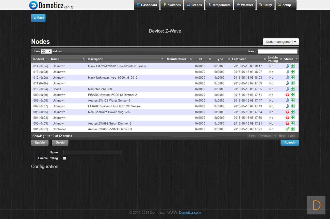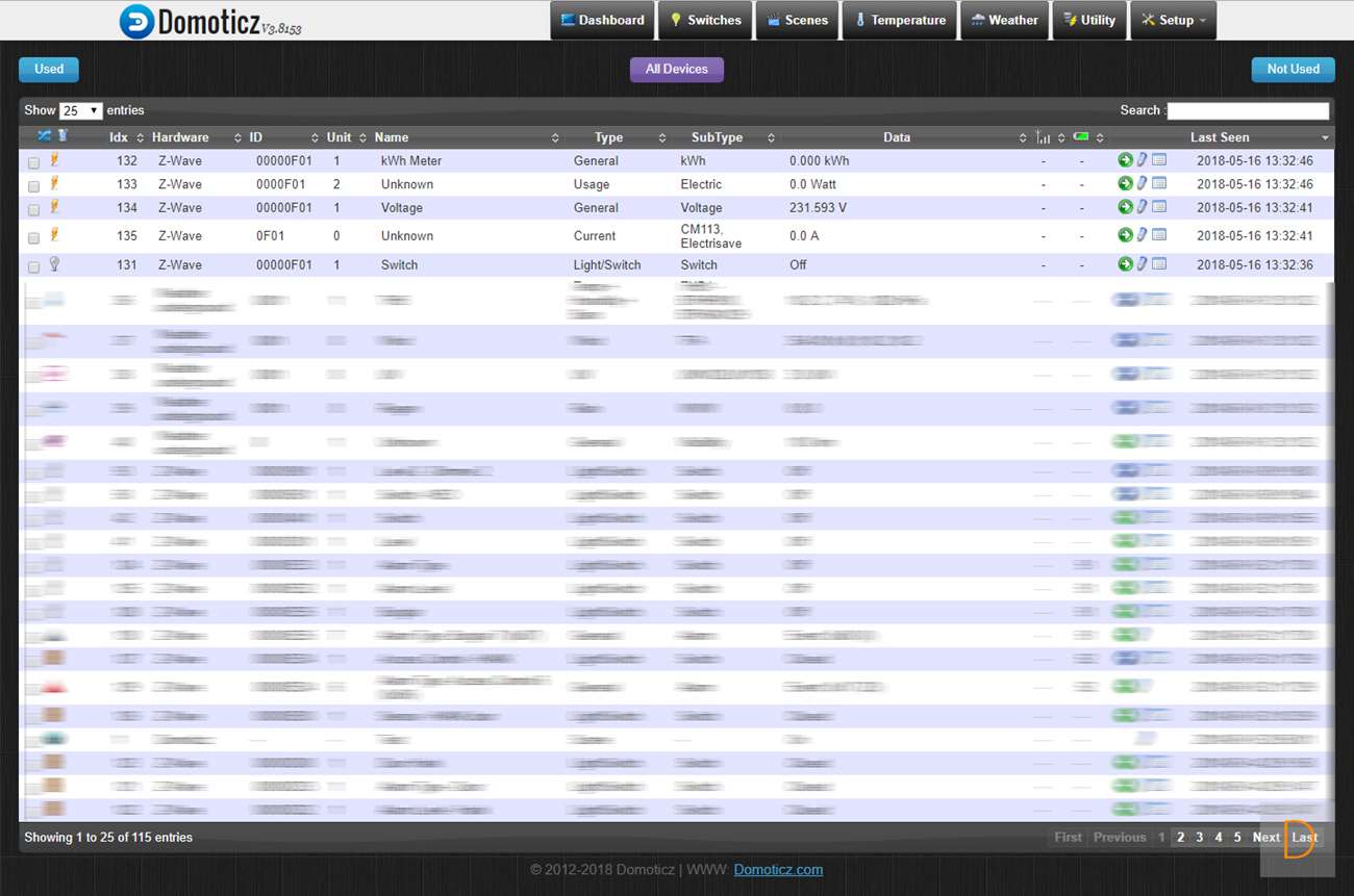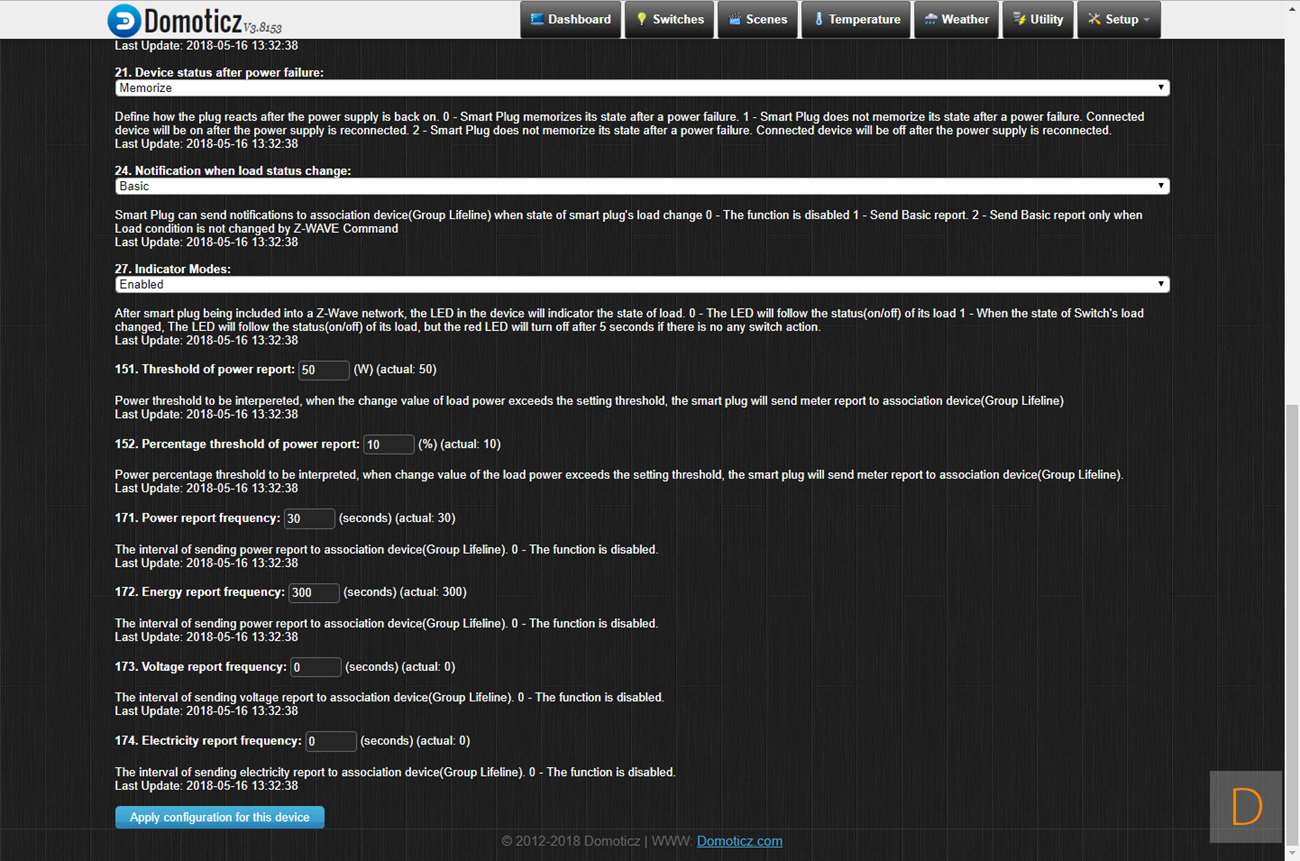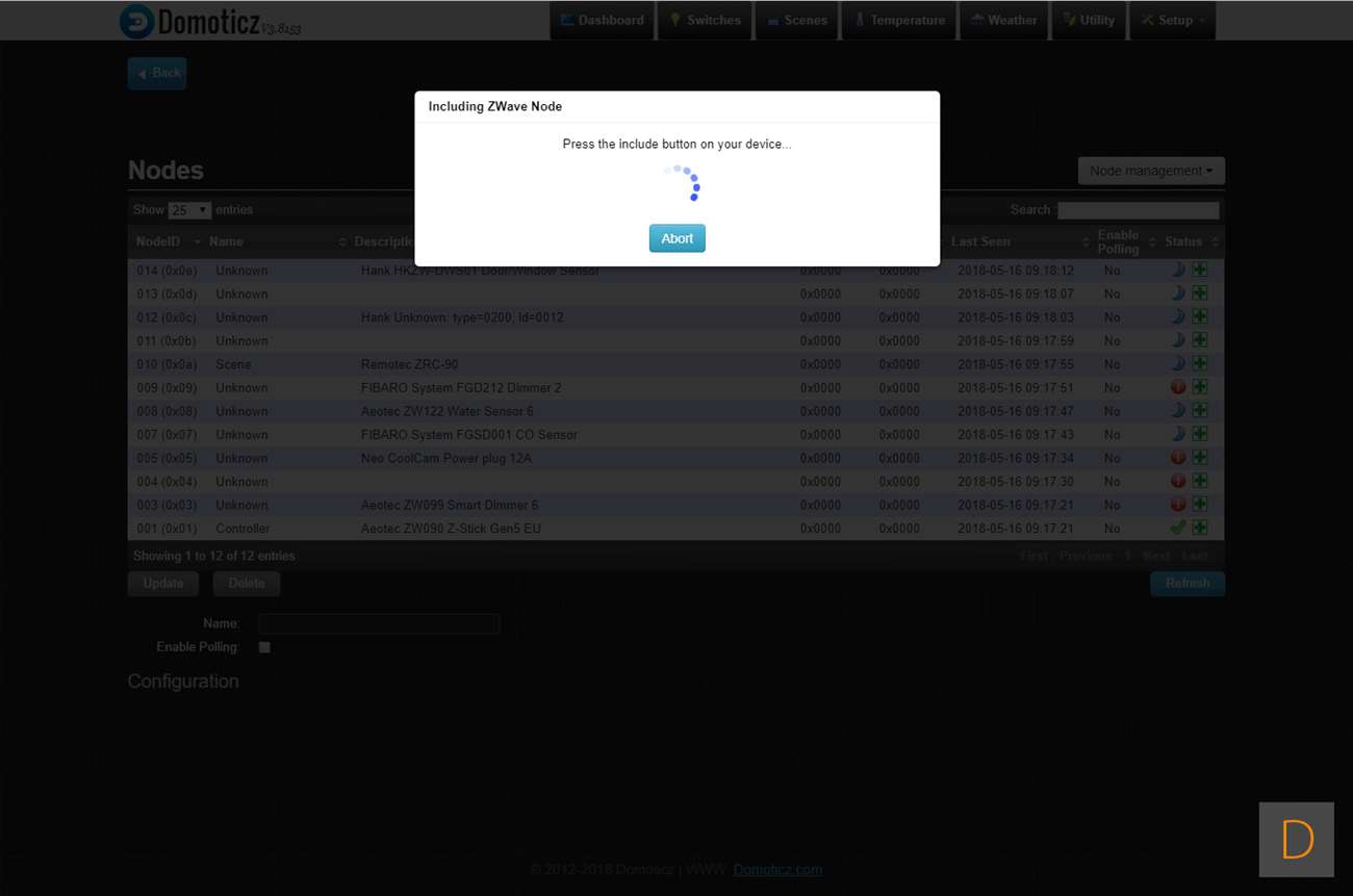 Zoals gewoonlijk is de Domoticz als laatste aan de beurt. Om het toevoegen te starten ga je naar het menu item Setup en hierna naar Hardware vervolgens klik je op Setup. Aan de rechterkant vind je een menuutje waar je klikt op "include node secure". Om hem beveiligd toe te voegen hou je de knop aan de voorkant van de plug 3 seconden lang ingedrukt. De LED ring zal 3x groen gaan knipperen om aan te geven dat hij toevoegen is gelukt. Hij werd toegevoegd maar ik zie niet alle eindpunten juist staan. Op deze manier zal hij nooit gaat gaan werken. Ik probeer als laatste poging hem op de niet beveiligde manier toe te voegen. Dit kun je starten door de knop aan de voorkant 3x snel achter elkaar in te drukken. Hij werd weer gevonden en nu zie ik wel de juist eindpunten.