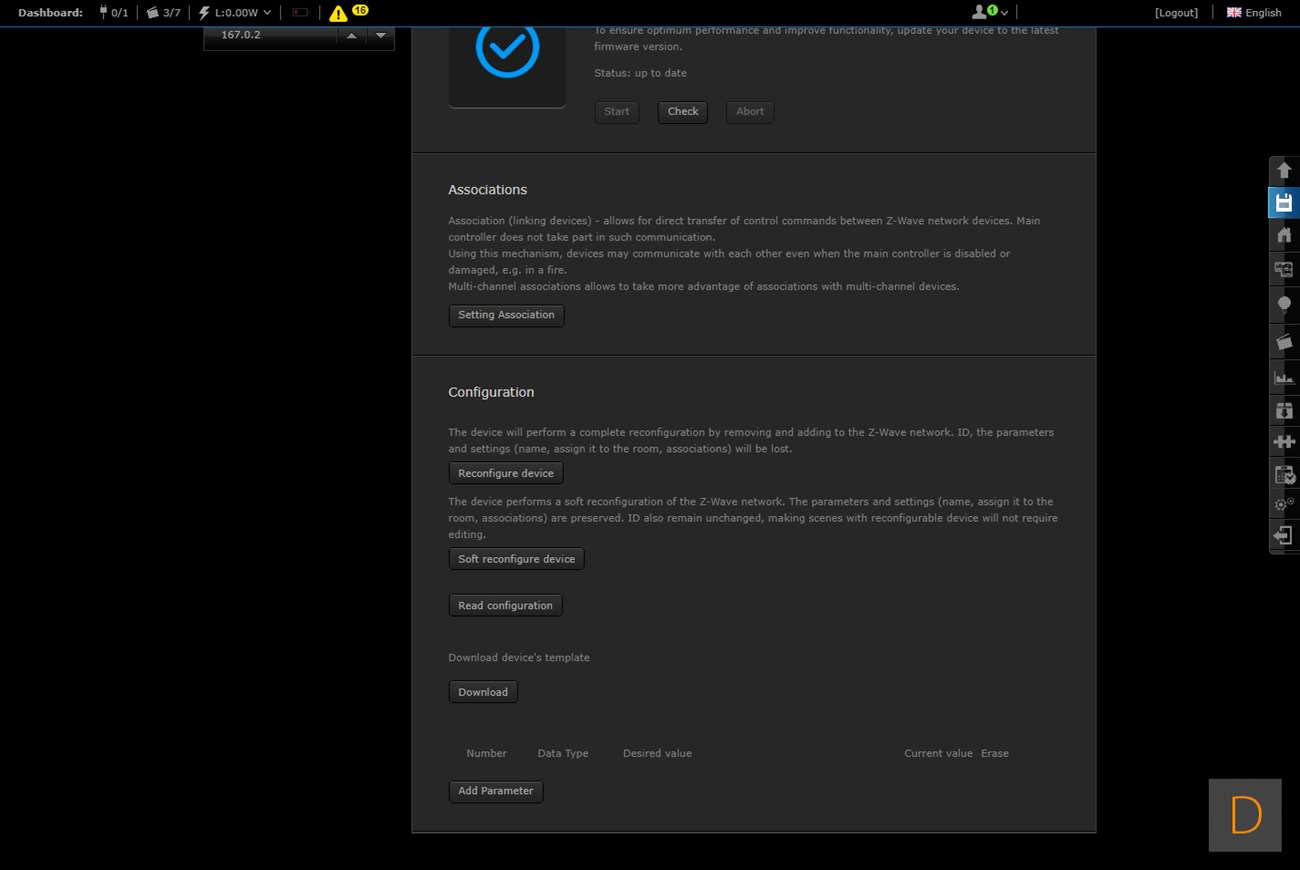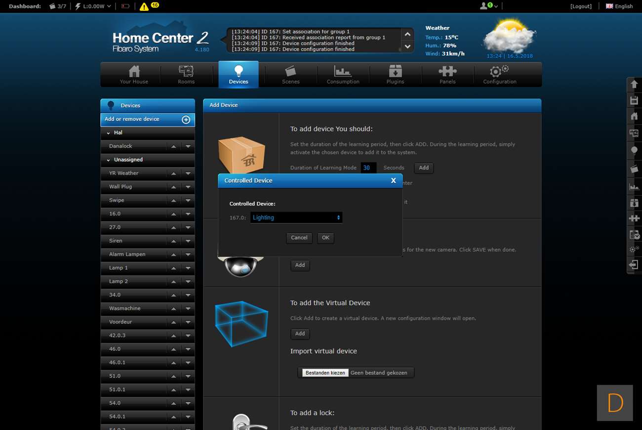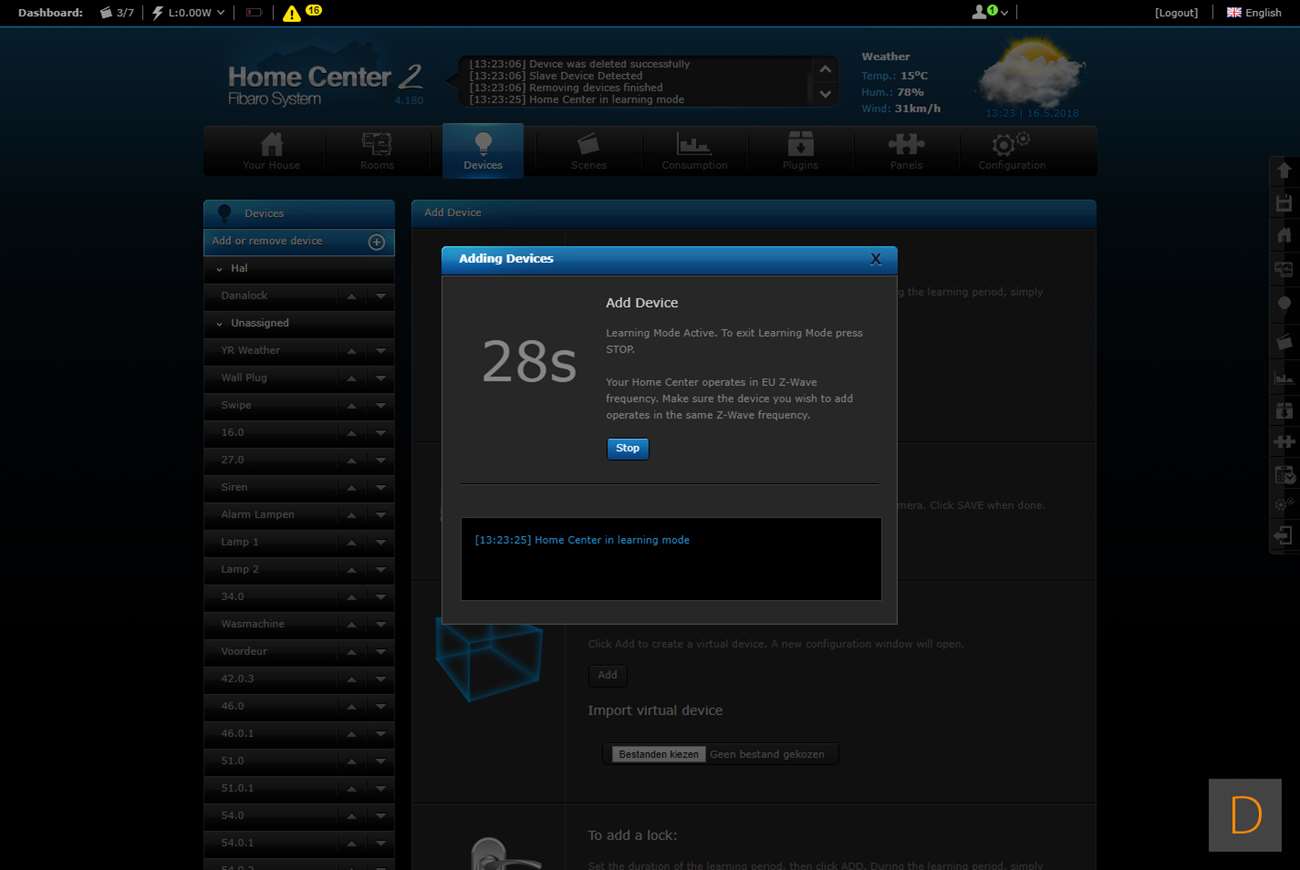 Om deze tussenstekker toe te voegen aan de HC2 log ik als eerste in. Vervolgens ga ik naar de "devices" en klik op "add new device" om hierna op "add" te klikken. Om hem beveiligd toe te voegen zet je een vinkje bij "add in secure ..." Vervolgens hou je de knop aan de voorkant van de plug 3 seconden lang ingedrukt. De LED ring zal 3x groen gaan knipperen om aan te geven dat het toevoegen is gelukt.