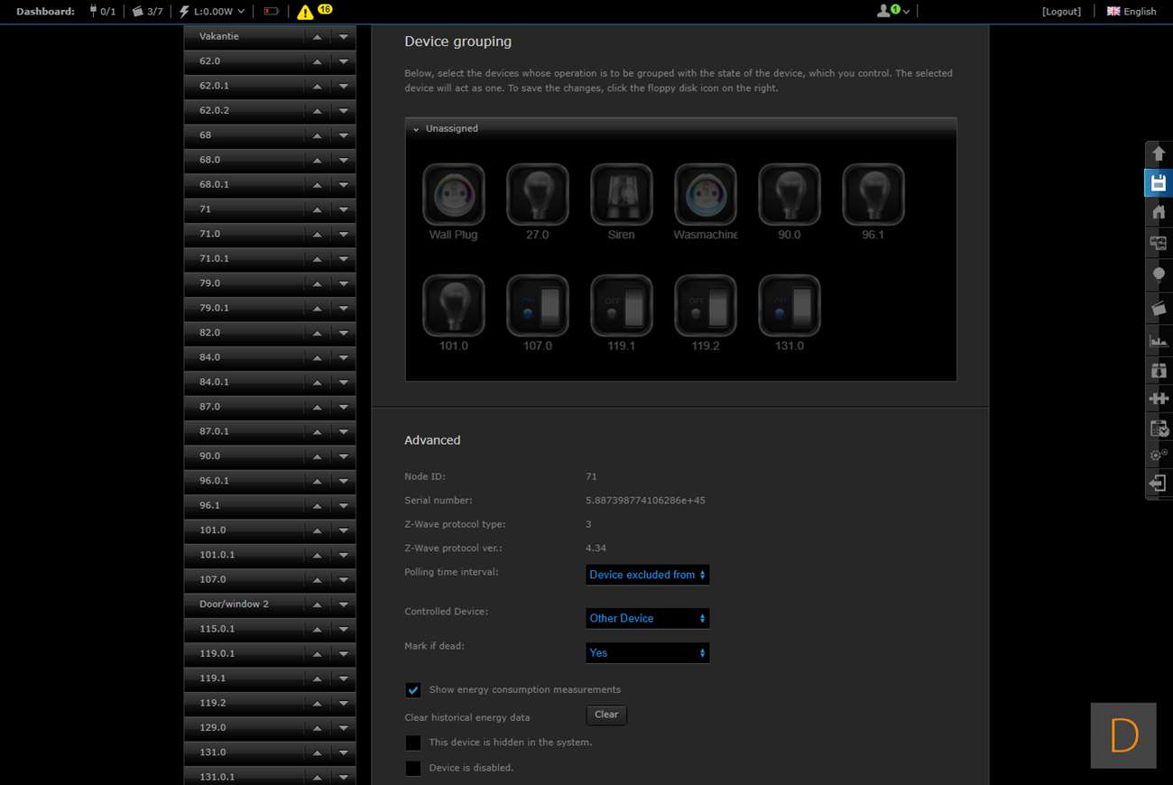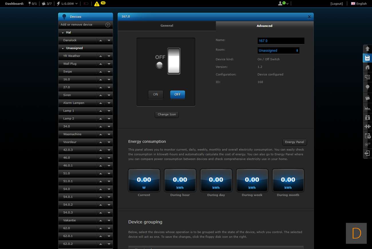 Hij werd toegevoegd en ik zie de aan- en uitschakelaar, het huidige verbruik (W), het totaal verbruik (kWh), het voltage (V) en het aantal stroom (A). Er zijn geen configuratie mogelijkheden aanwezig. Deze moet je dus handmatig toevoegen.