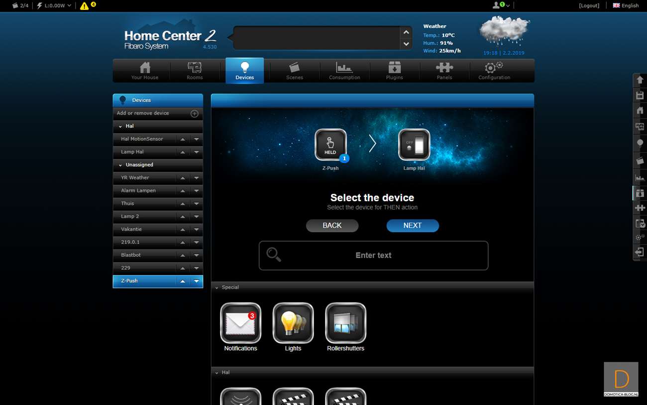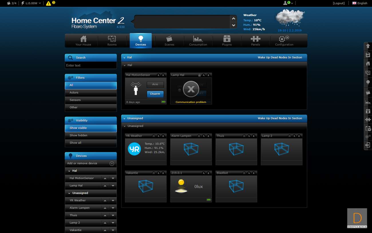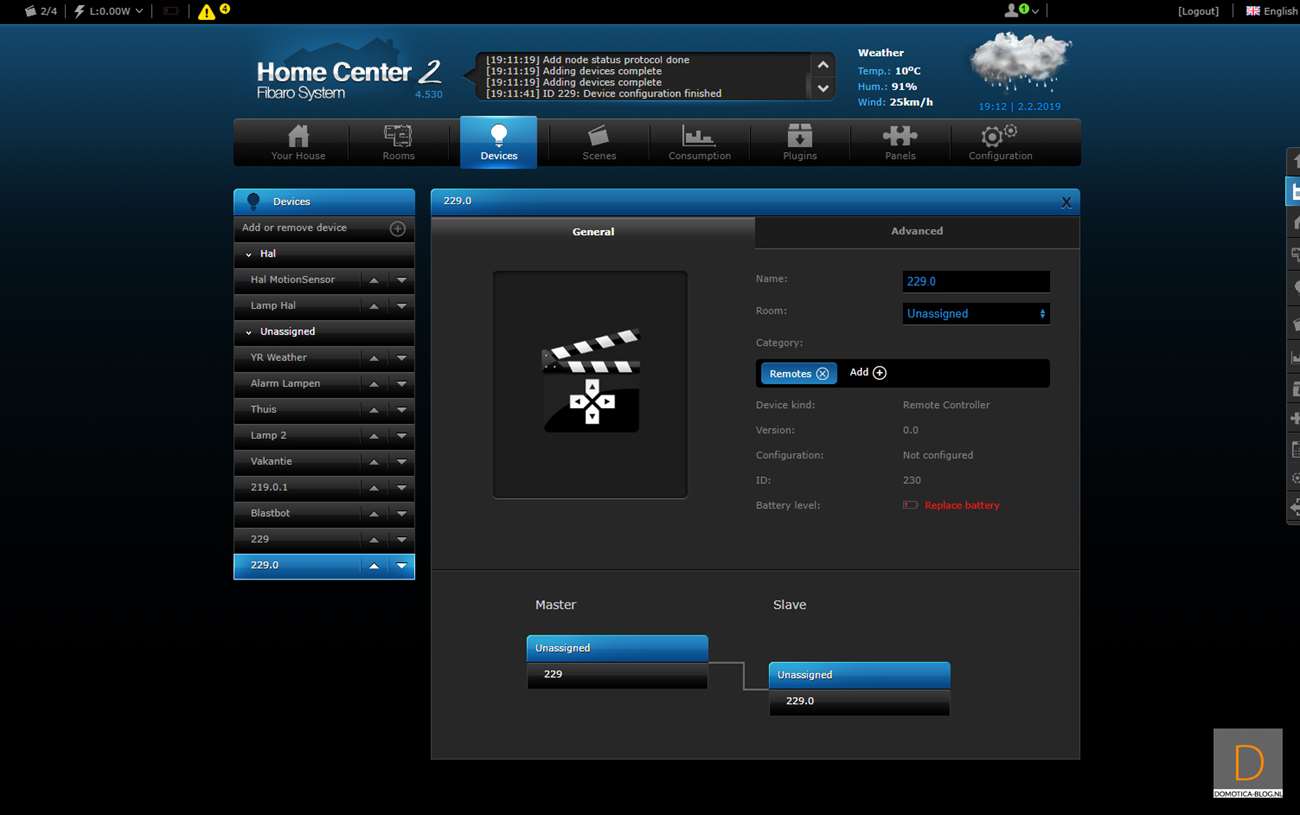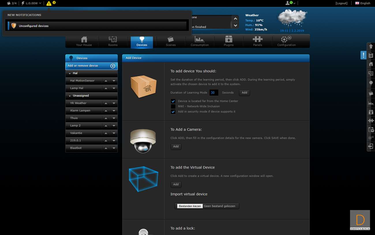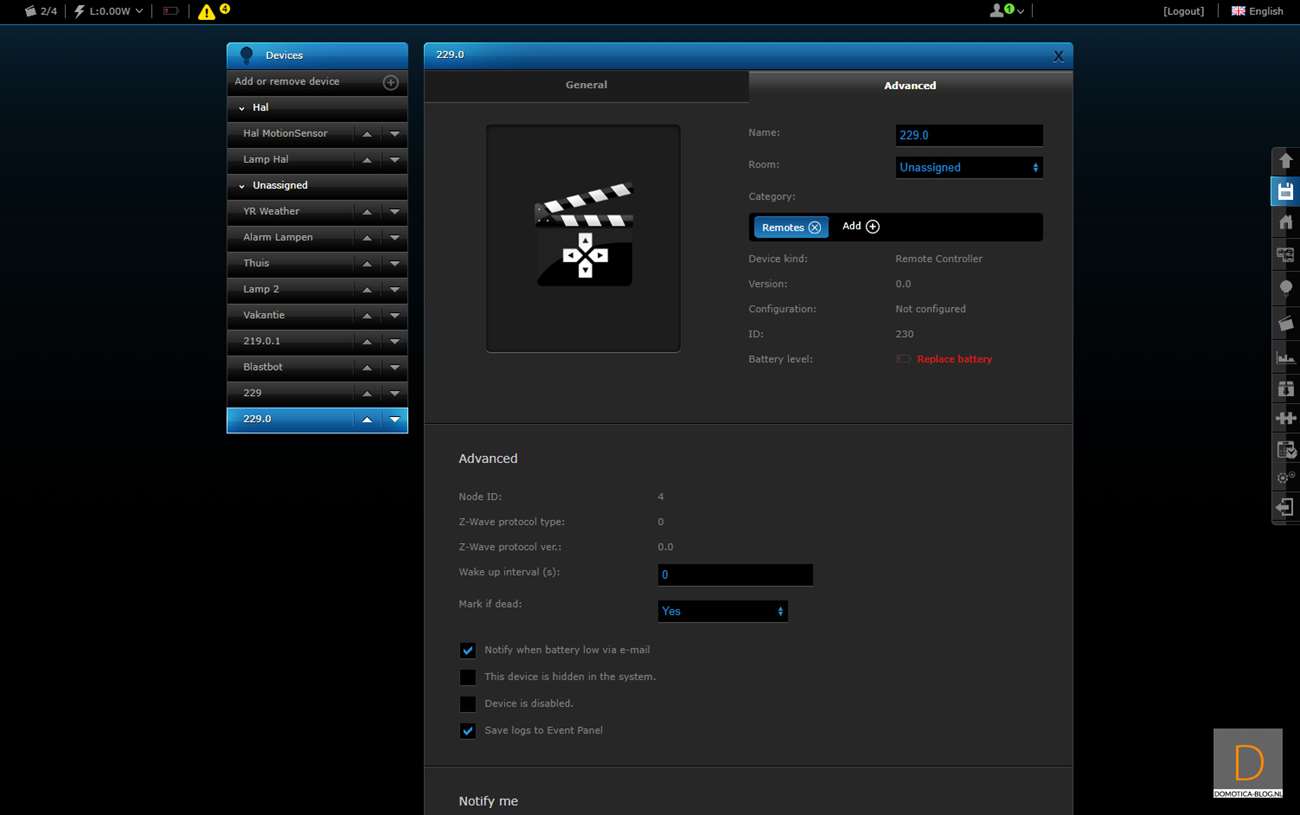 Hij werd hierna toegevoegd aan de HC2. Het valt mij op dat er gemeld wordt dat er nog geen template beschikbaar is. Ondanks dit, zie ik netjes op het dashboard de knop verschijnen. Ik zie tevens het batterijniveau.