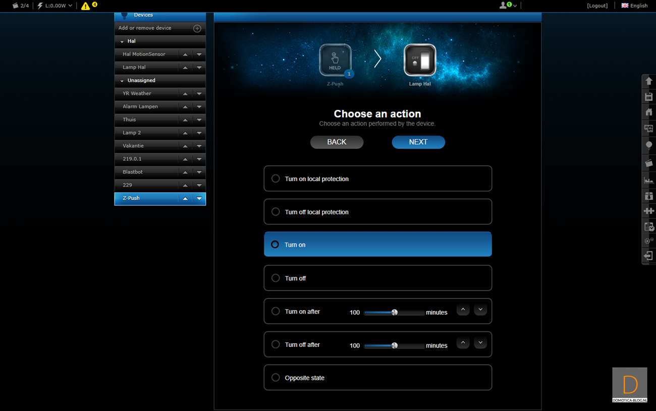 Je kunt natuurlijk verschillende scene's bedenken voor deze handige knop. Zou zo je bv kunnen regelen dat al je lampen aangaan en natuurlijk weer uit. Op de HC2 krijg je de mogelijkheid om een scene te starten door 1x lang ingedrukt te houden of de knop los te laten. In totaal dus 24 mogelijkheden.