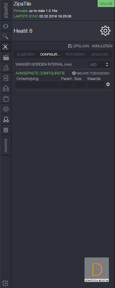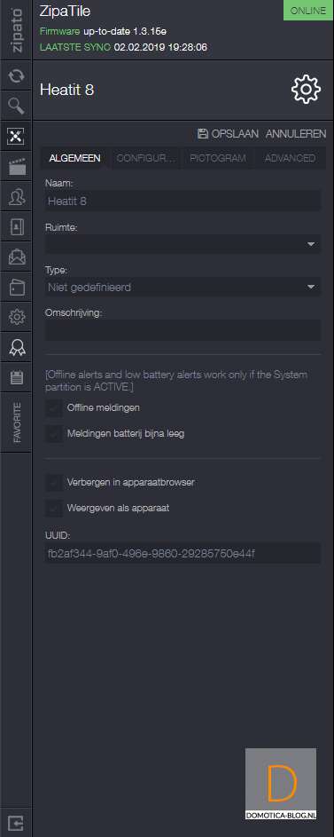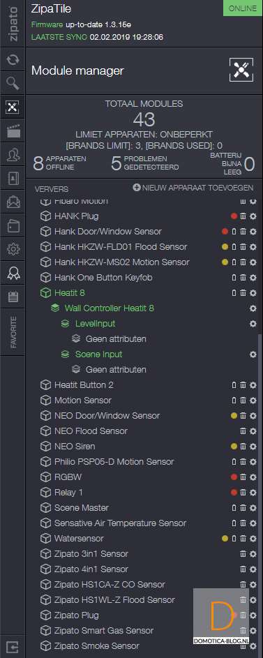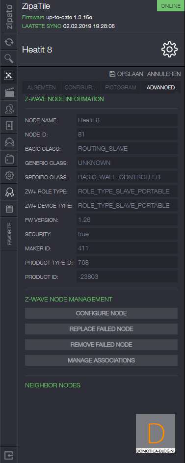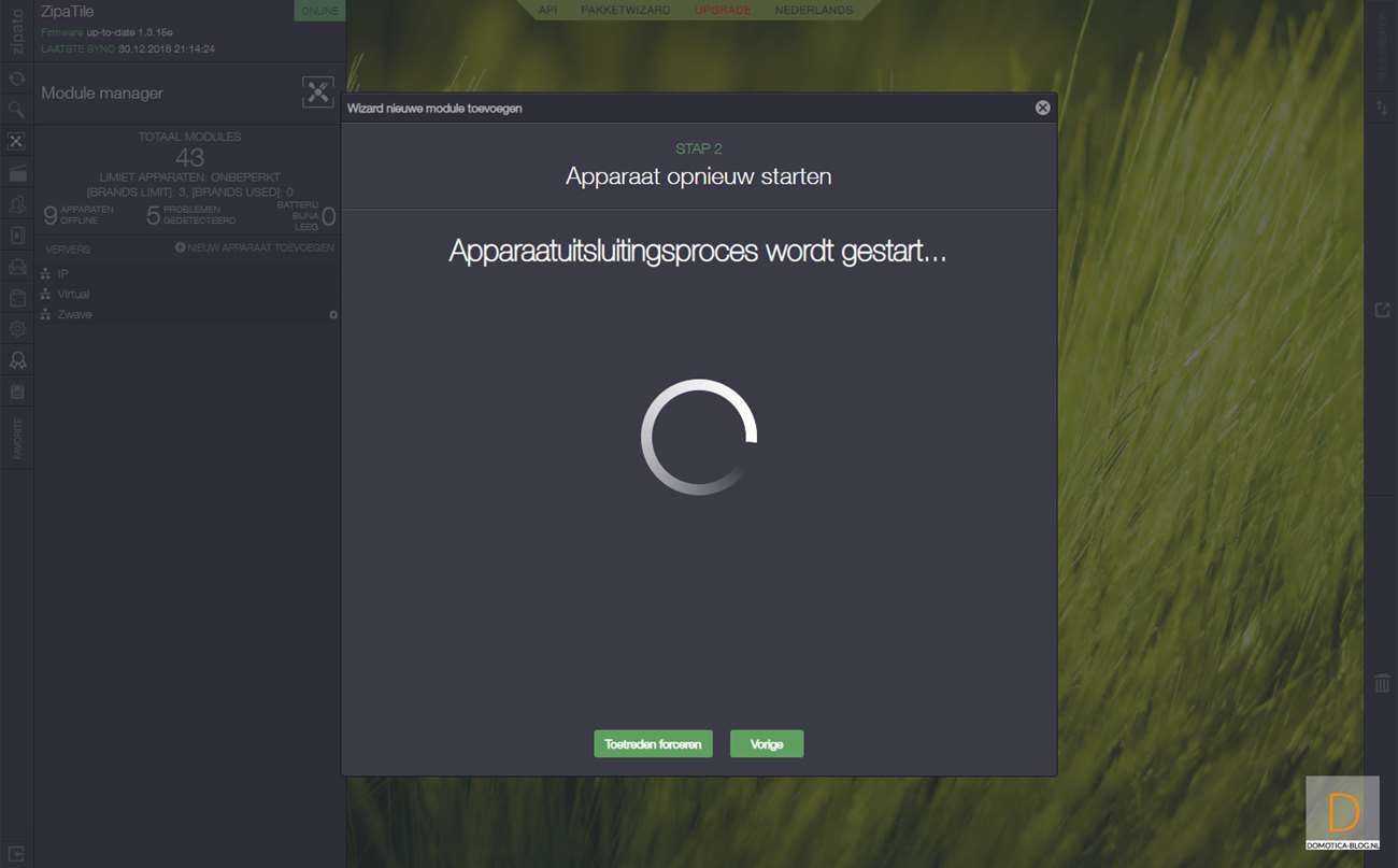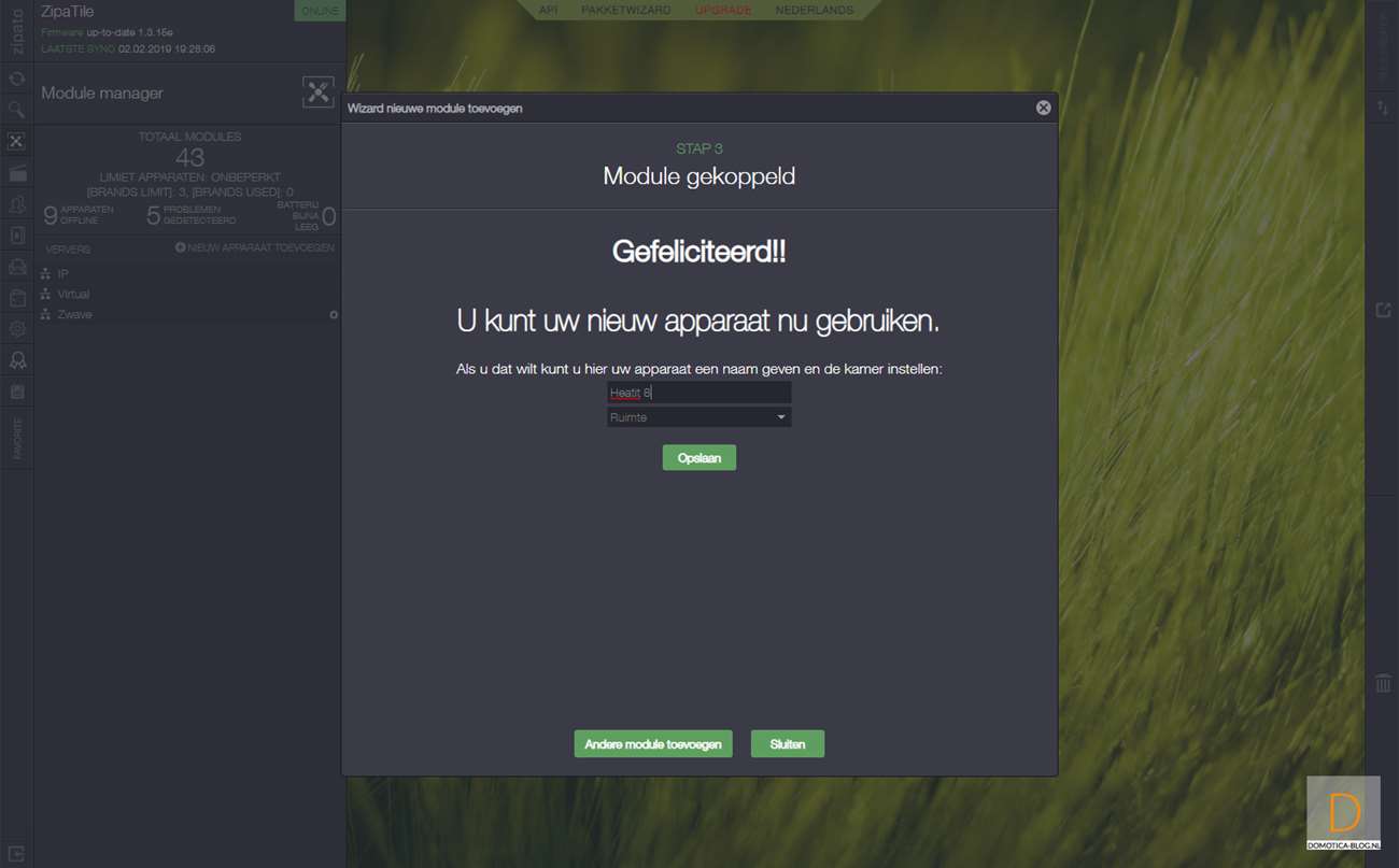 De volgende controller is ZipaTile. Als eerste log je in en ga je naar je apparaten. Vervolgens op de toevoegen knop te klikken en Z-Wave te selecteren. Hierna druk je 3 seconden beide knoppen (I)/(O) te gelijk in en het LEDje aan de voorkant zal oplichten. Als het toevoegen is gelukt zal de LED 6x gaan knipperen. Hij werd bij mij gevonden en toegevoegd en ik zie hem bij de configuratie tevoorschijn komen.