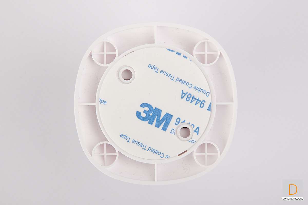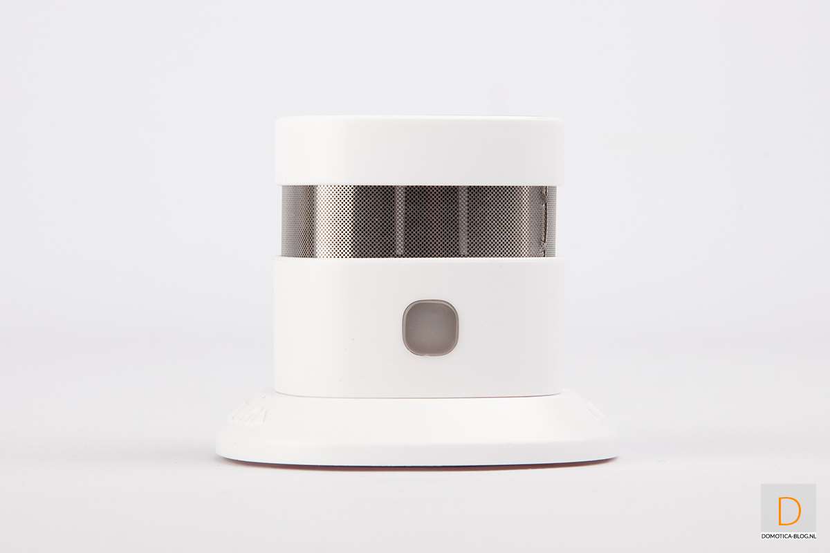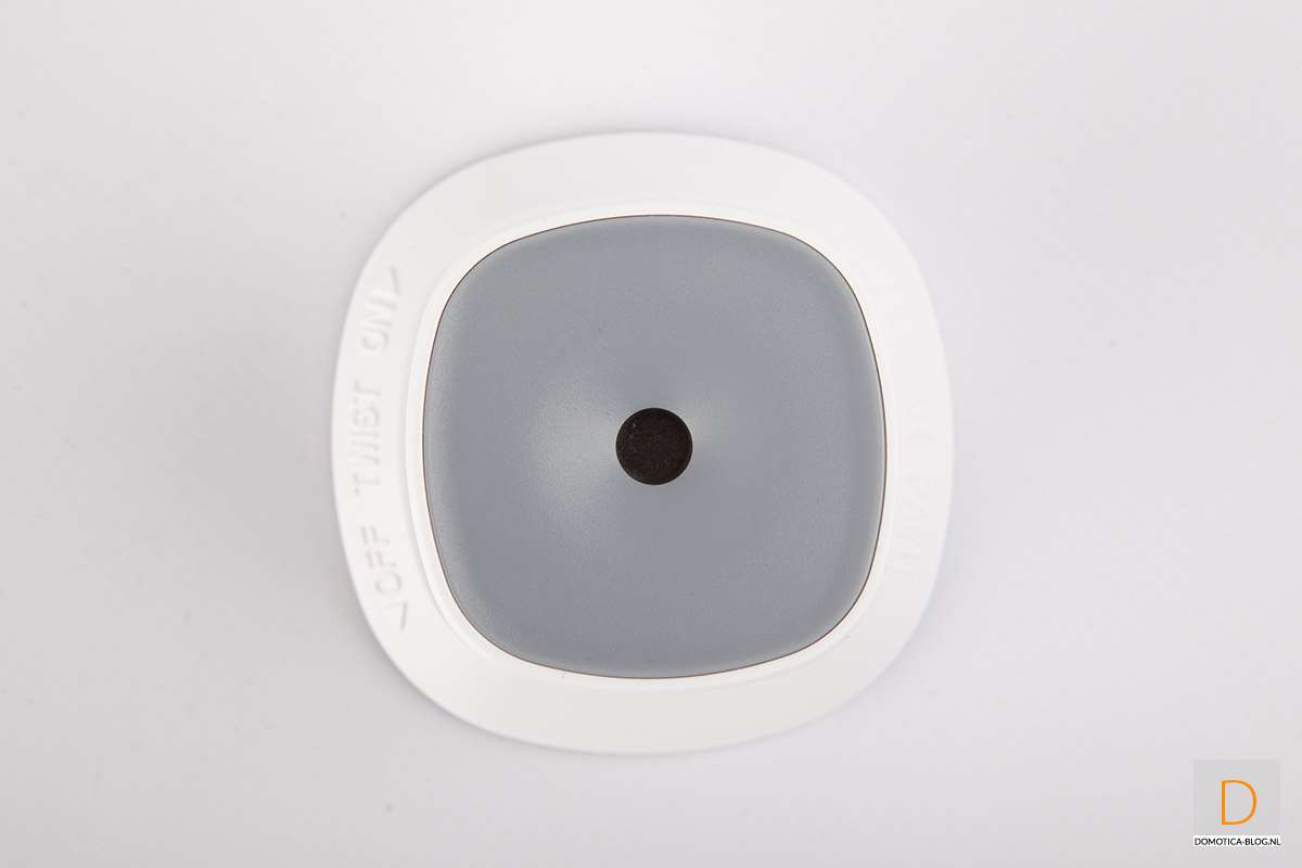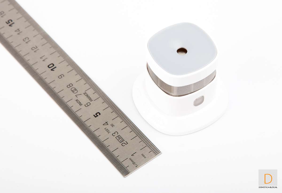 Hij is 60 x 60 x 49,2 mm groot wat hem compact maakt, zeker als je hem vergelijkt met bv een Nest Protect welke 134 x134 x 38,5 mm is. Hij heeft een gaatje aan de zijkant om hem toe te voegen aan de controller. Later hier meer over.