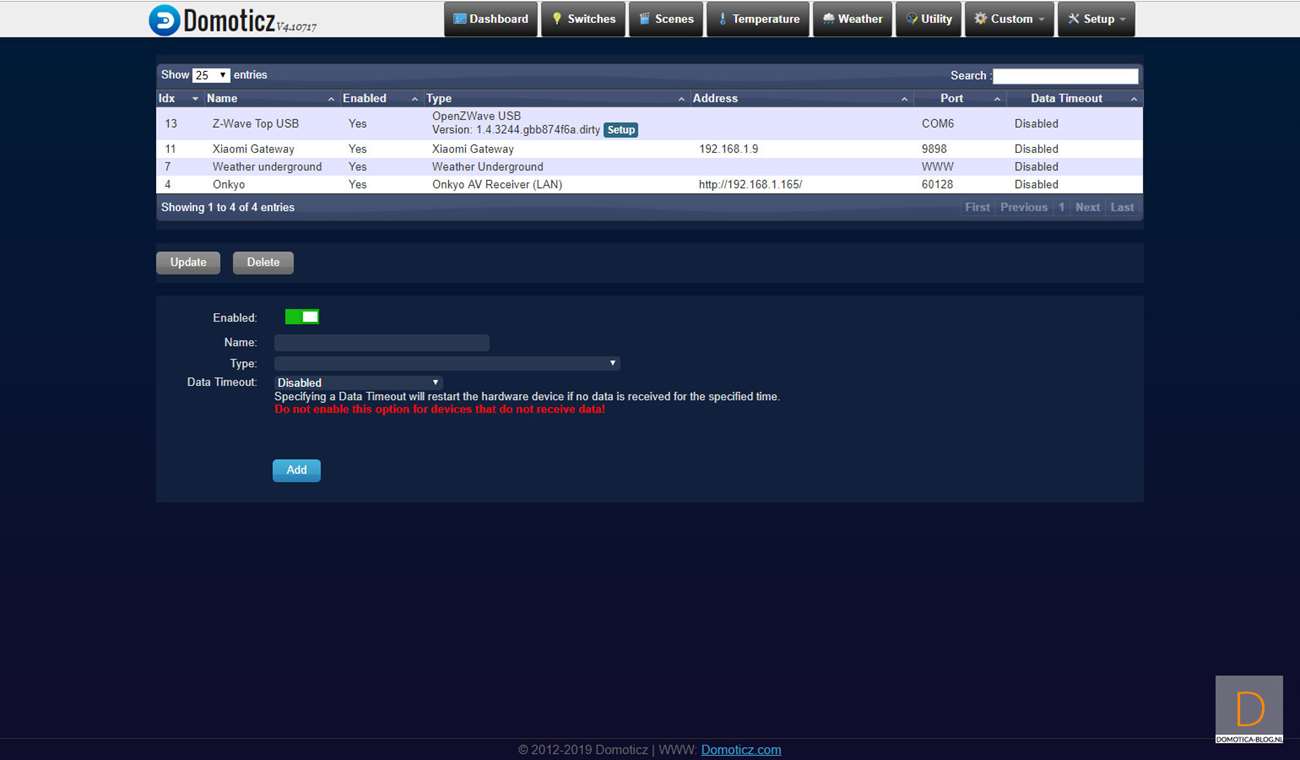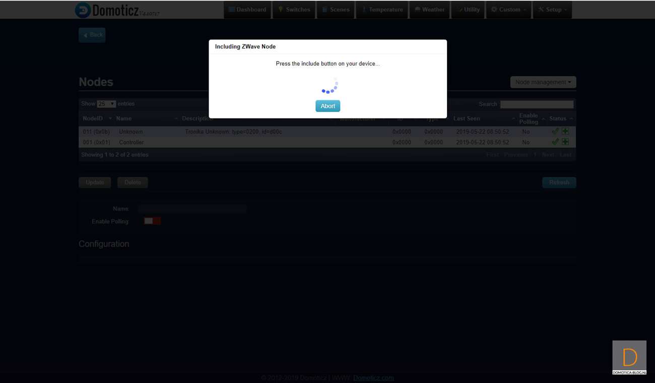 De volgende controller is Domoticz. Je kunt het toevoegen starten door naar het menu item "setup" en daarna naar "hardware" te gaan. Vervolgens klik je op setup van de Aeon Labs controller en ga je naar include node secure (aan de rechterkant).