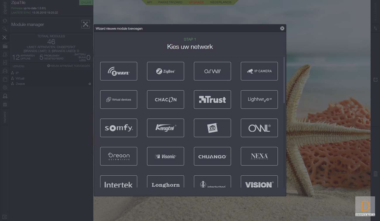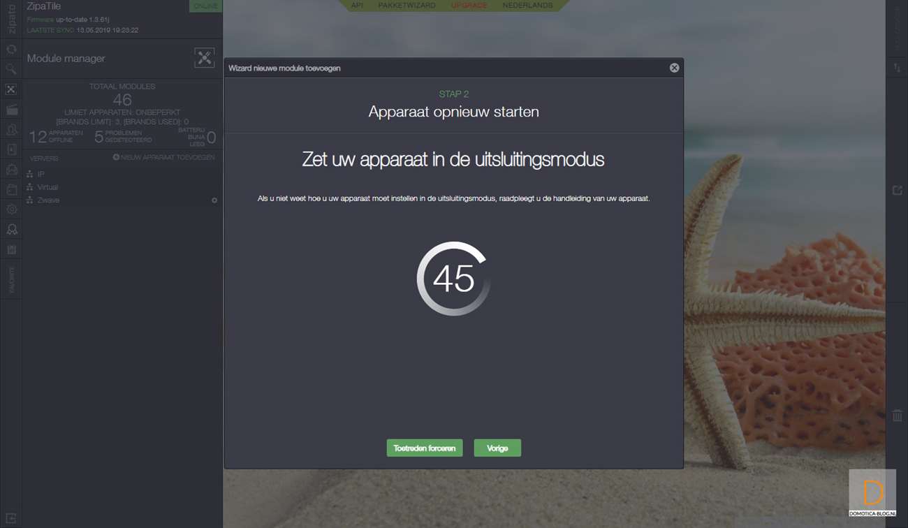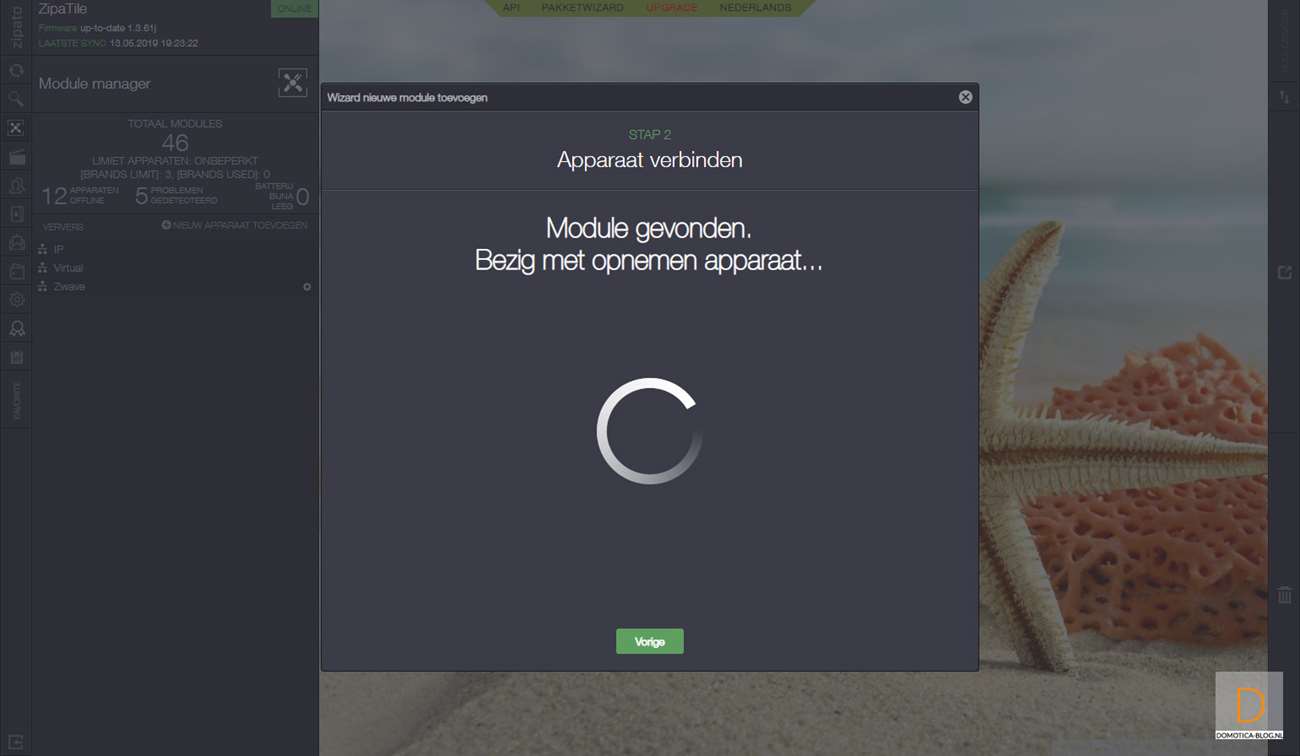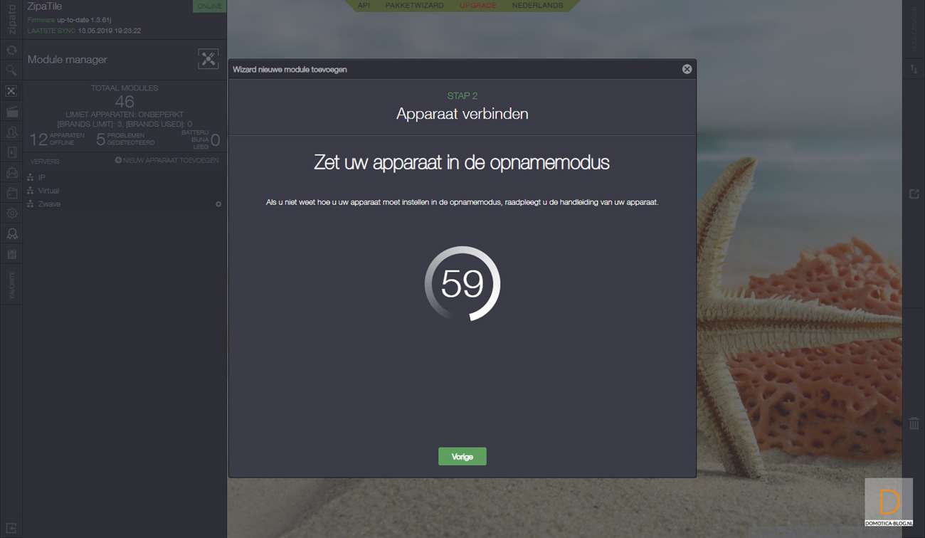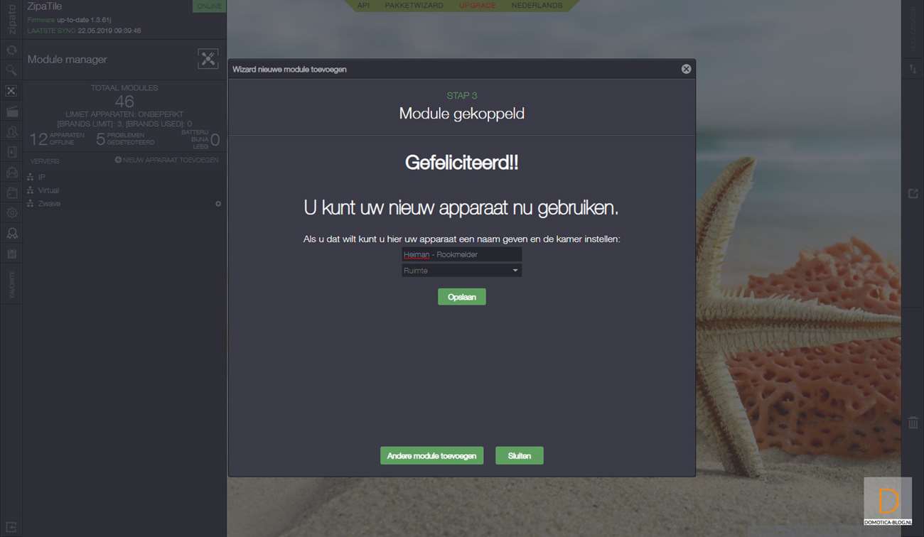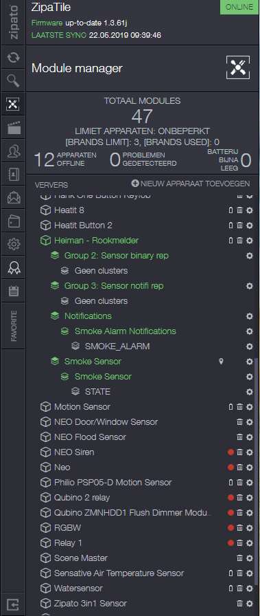 De volgende controller is ZipaTile. Als eerste log je in en ga je naar je apparaten. Vervolgens klik je op de "nieuwe apparaat toevoegen" knop en selecteer je Z-Wave. Druk hierna 3 keer binnen 1,5 seconde met bijgeleverde pinnetje in de zijkant van de rookmelder. Het LEDje aan de zijkant zal 3 keer oplichten. Hij werd bij mij gevonden en toegevoegd en ik zie hem bij de configuratie tevoorschijn komen. Als ik een test doe d.m.v. het knopje in de voorkant in te drukken zie ik een rookmelder binnenkomen en de rookmelder geeft een oorverdovend geluid.