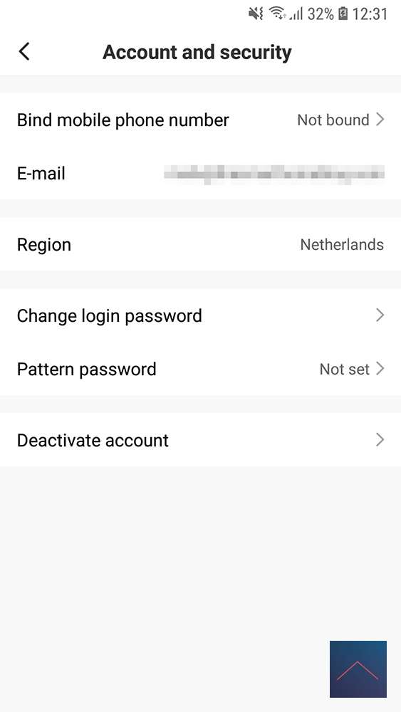 Bij “Account and security” kun je je mobiele nummer koppelen, je e-mailadres aanpassen, de regio selecteren, je wachtwoord aanpassen, een wachtwoord patroon aanmaken en je account deactiveren.