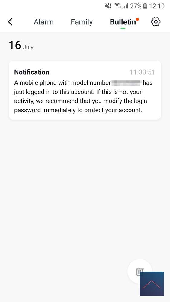 De volgende optie is “Message Center” in het account menu. Er zijn 3 soorten berichten: Alarm, Family en Bulletin. Als hier een nieuw bericht is dan kom er een rood bolletje rechts naast de naam te staan. Beveiligingstechnisch goed dat je in Bulletin te zien krijgt welke mobiel gebruikt maakt van je account.
