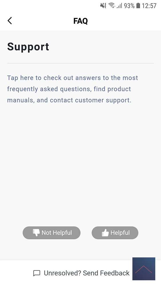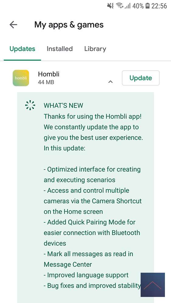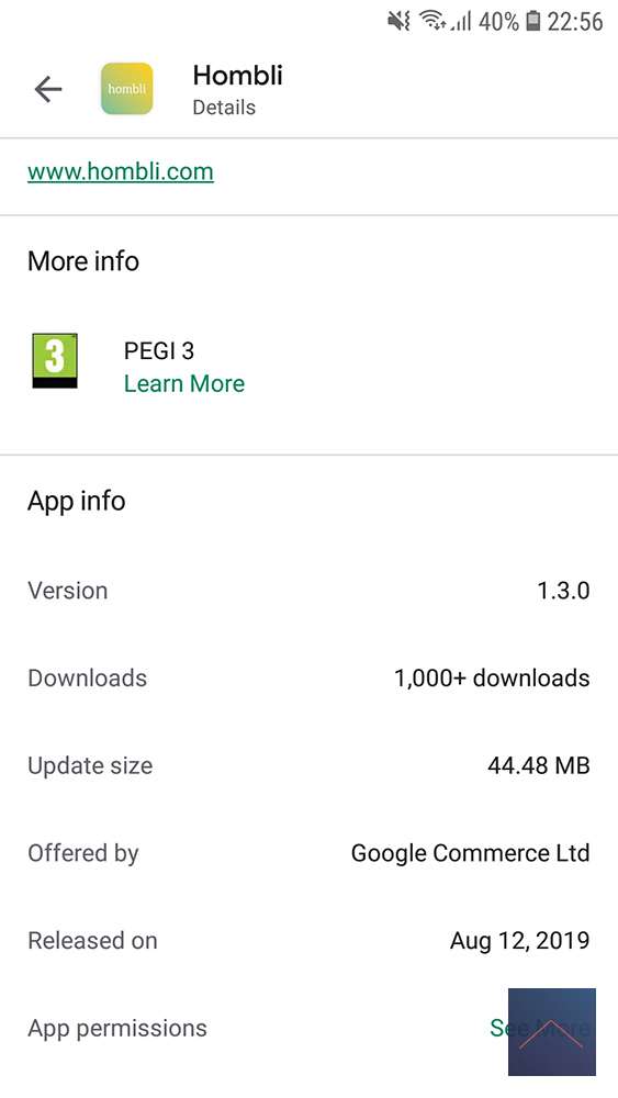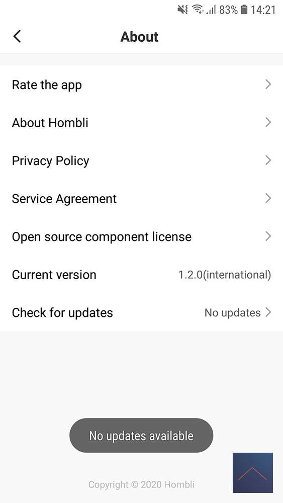 Bij “Current version” staat de versie van de App en bij “Check for updates” kun je kijken of je de laatste versie hebt. Hier staat dat ik versie 1.2.0 heb, ik selecteer "check" voor update en de app geeft aan dat er geen nieuwe versie is, maar als ik naar de Google Store ga zie ik dat ik de Hombli App kan updaten naar versie 1.3.0. Hier kwam ik pas achter nadat ik het grootste gedeelte van de review heb gemaakt, dus voor de goede orde is deze review gebaseerd op versie 1.2.0.