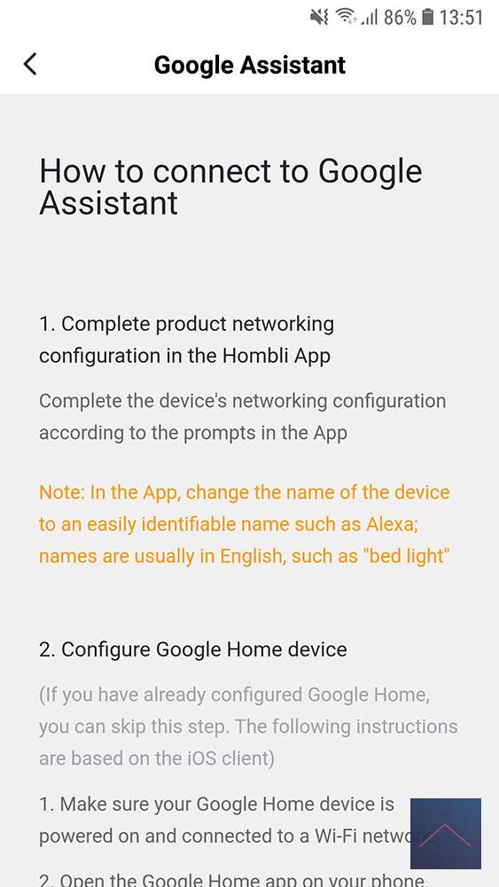 In het account menu “More services” kun je kiezen om Alexa of Google Assistant te koppelen. Ik selecteer hier Google Assistant en krijg eerst een foutmelding, ik selecteer retry en kom nu op een pagina waarbij een uitleg wordt gegeven hoe ik Hombli via de Google Assistant kan toevoegen.