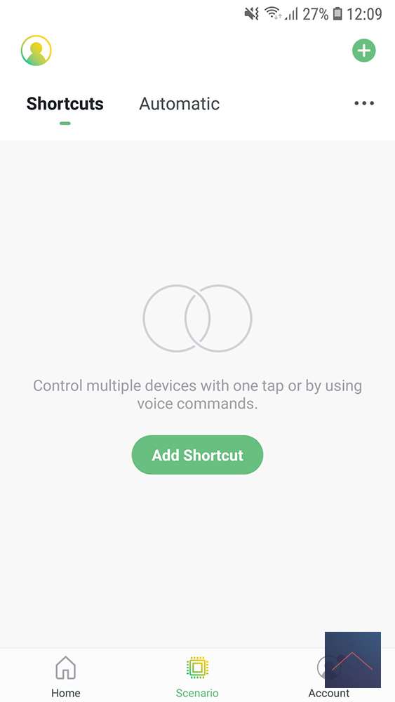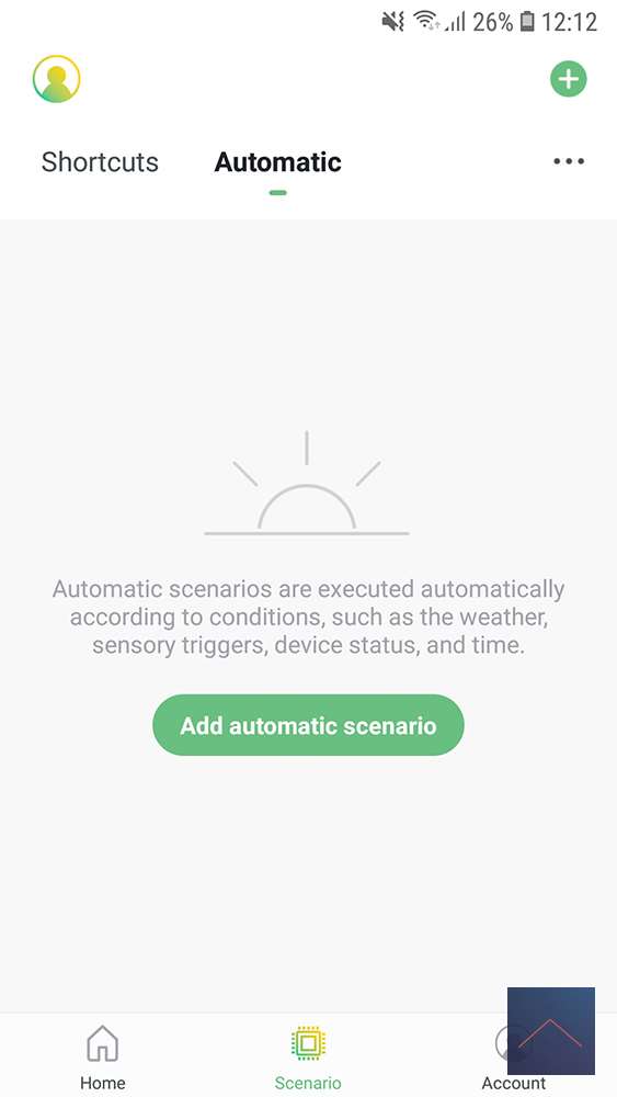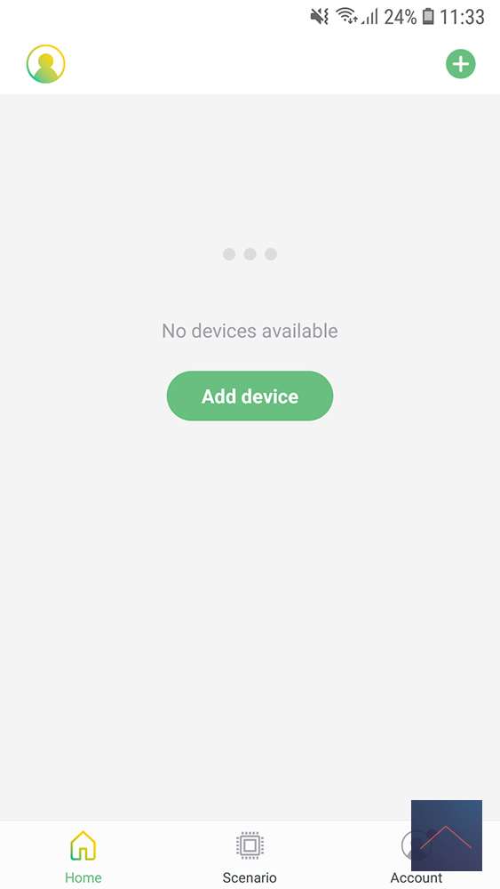 Er zijn 3 tabbladen onderin je scherm: Home, Scenario en Account. In het hoofdscherm kun je meteen een product toevoegen door “Add device” te selecteren midden op je scherm of op de plus te klikken rechts boven in het scherm.