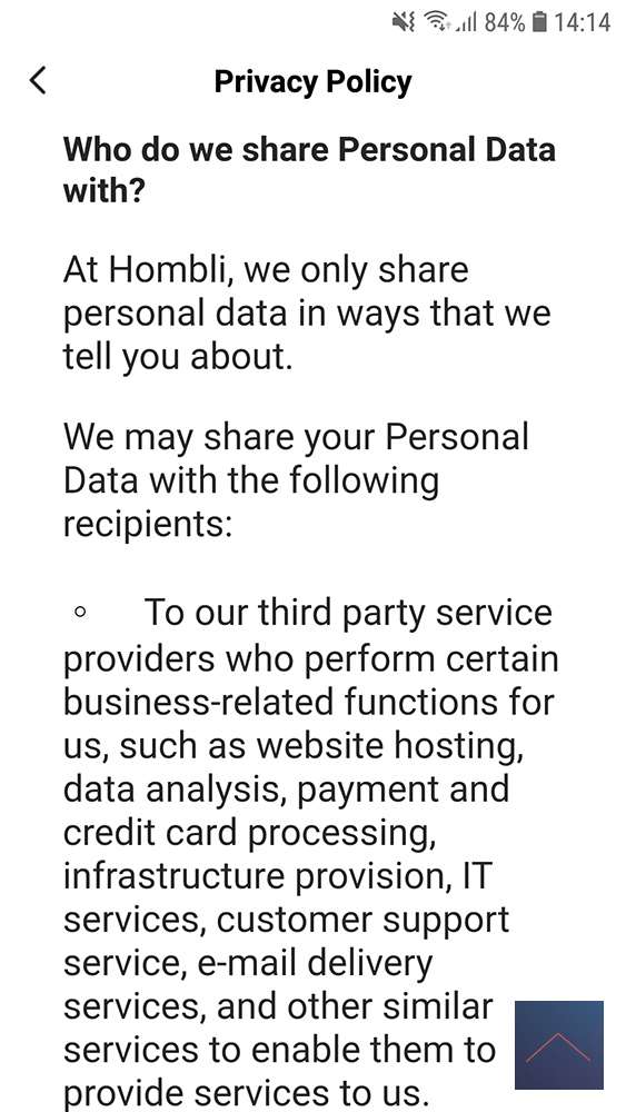 Terug in het Settings menu krijg je bij “About” een mogelijkheid om een rating aan de APP te geven in de store. About Hombli geeft je een overzicht van informatie over Hombli.