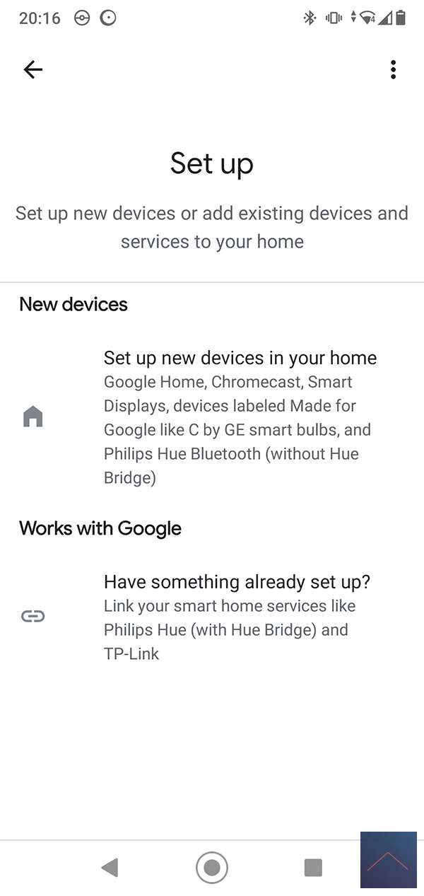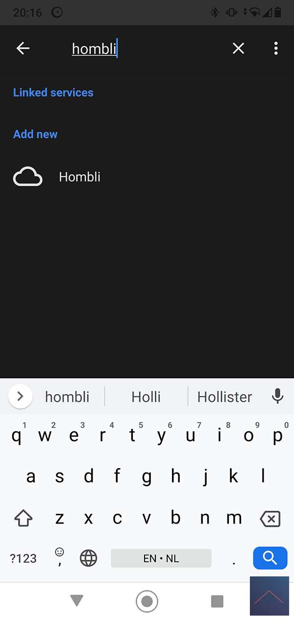 Om de Hombli te koppelen starten we de Google Home APP op en klikken op het plusje rechtsboven. Vervolgens klikken we op "set up device" en hierna op "have someting already setup". Hierna moet je inloggen met je Hombli account en toestemming geven.