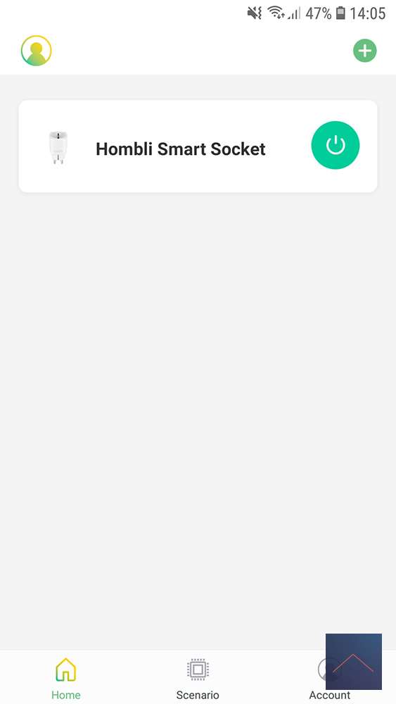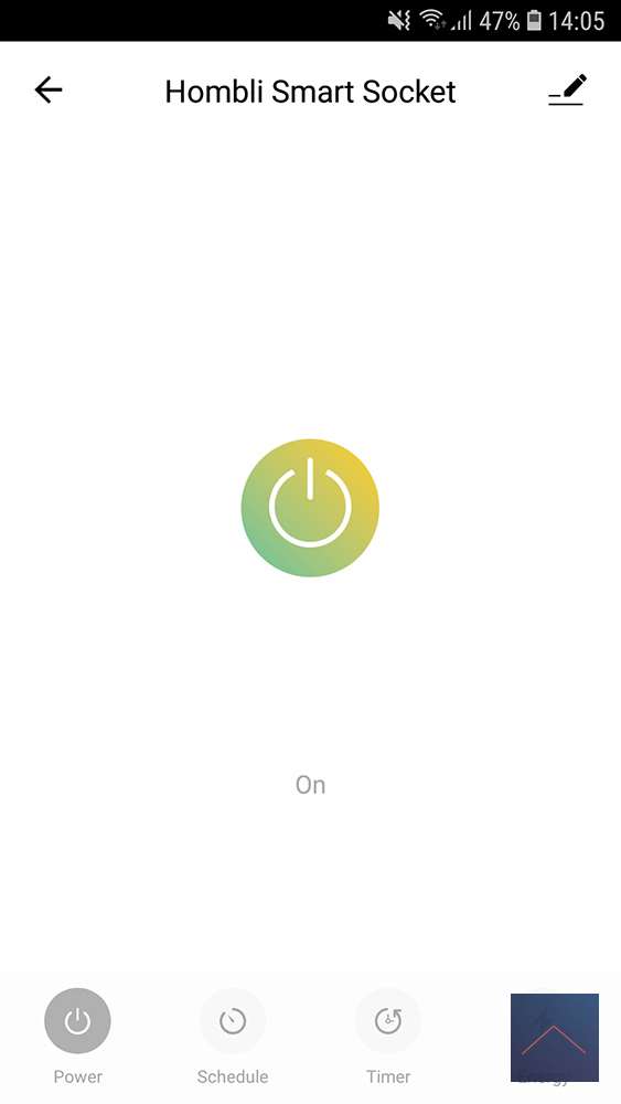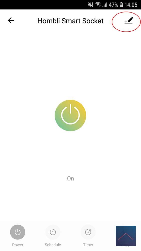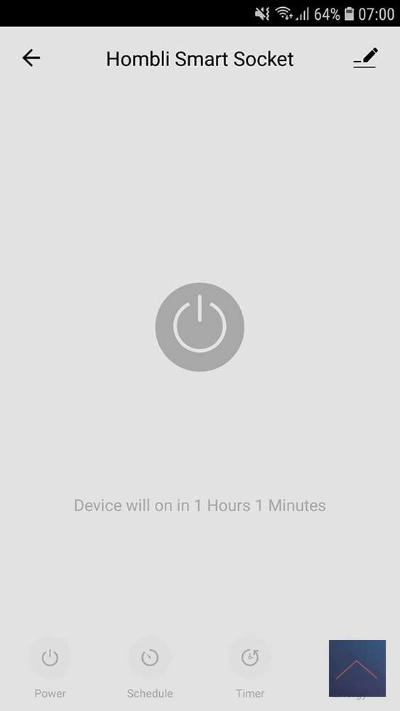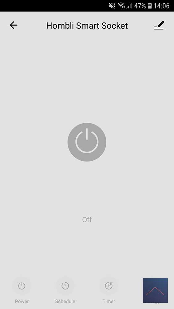 Nu de plug geinstalleerd is zullen we alle mogelijkheden in de APP laten zien. In het hoofdscherm zien we de device “Hombli Smart Socket” met daarnaast een aan- en uit knop waarmee we het geheel kunnen bedienen. Als we op de naam klikken komen we in het hoofdscherm van de Smart Socket en daar staat in het midden een grote aan en uit knop, deze kun je ook gebruiken om de stroom toevoer aan en uit te zetten.