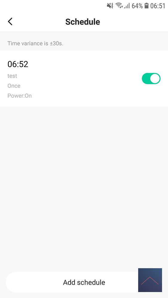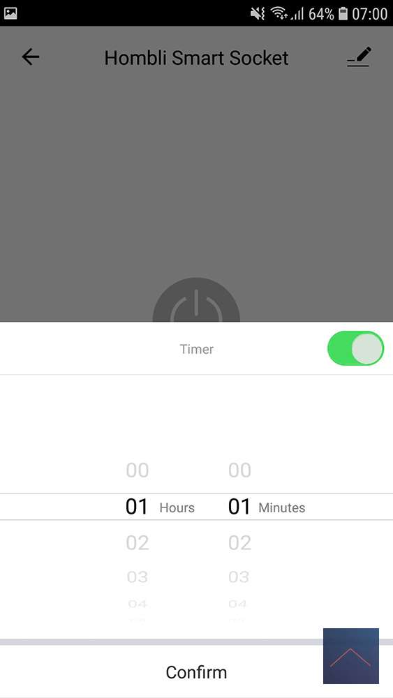 De Timer is te gebruiken om de socket over een bepaalde tijd aan of uit te zetten, het aan- of uitzetten hangt af van de stand waarin de socket zich op dat moment begeeft. Dus als de socket uit staat zal de Timer de socket aanzetten en andersom. Je selecteert de uren en minuten met een maximale tijd van 23 uur en 59 minuten. Voor de test heb ik de timer op 10 minuten gezet en daar tussendoor de schedule de socket een keer aan en een keer uit laten zetten, helaas was de timer niet meer op het hoofdscherm te zien en ging de socket niet aan na 10 minuten. Houd er dus rekening mee dat als je schedule in de tijd van de timer je socket aan of uit zet, je timer komt te vervallen.