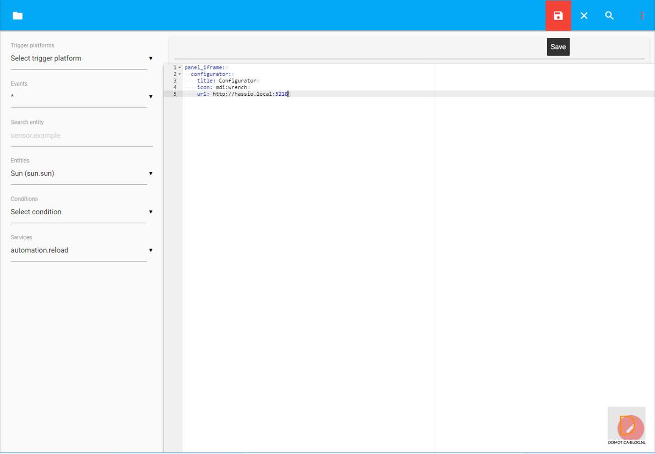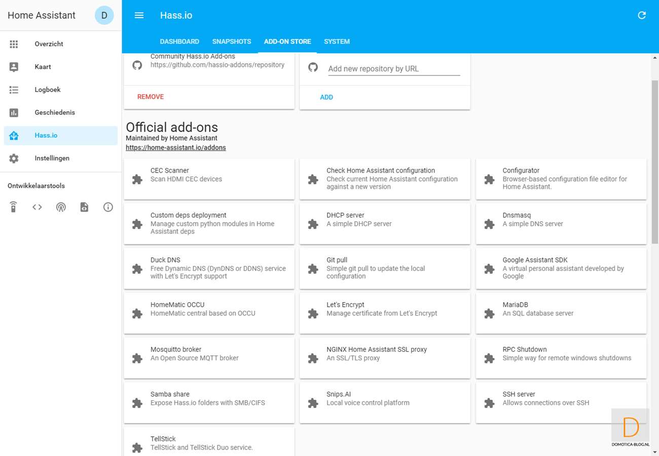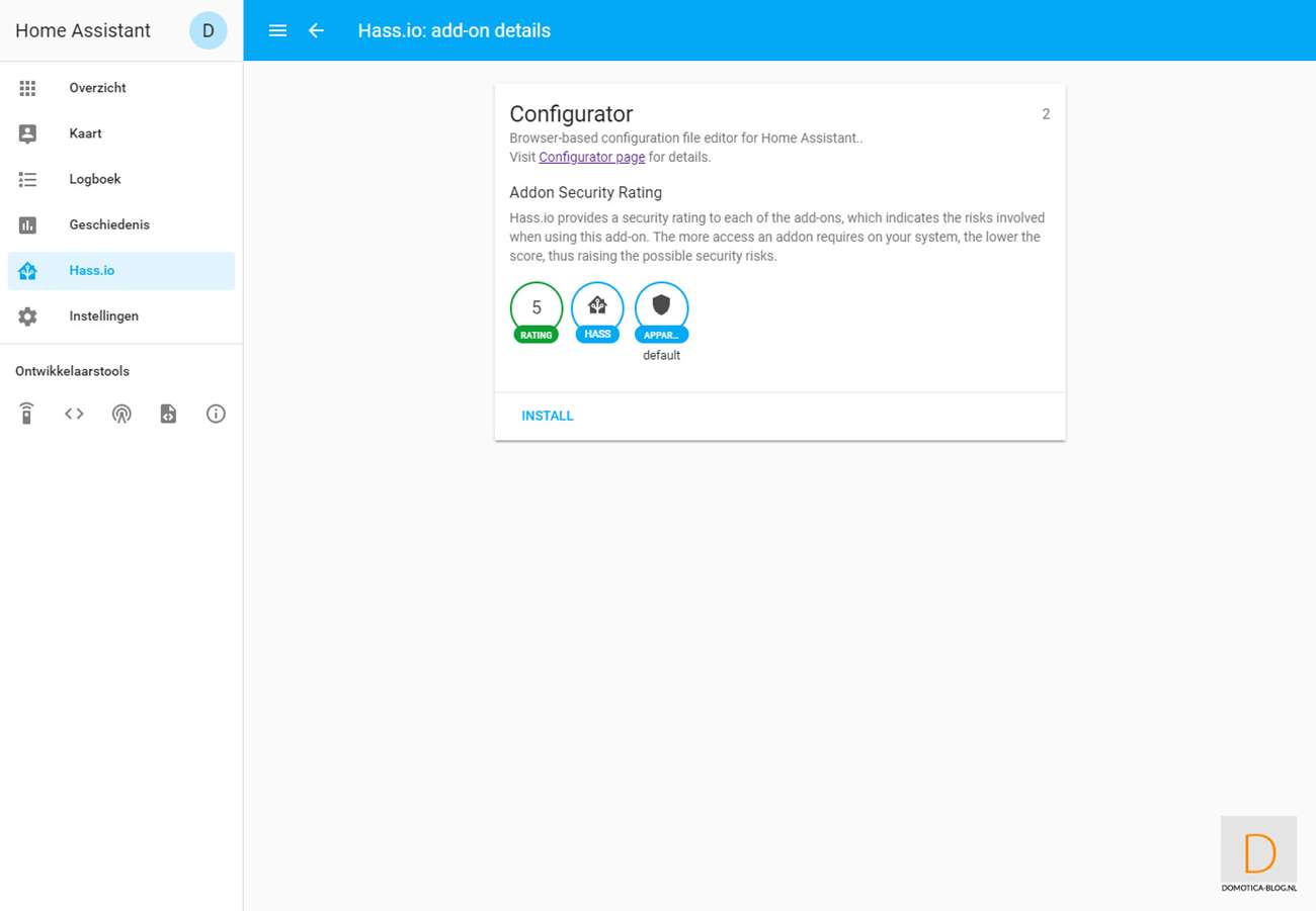 HASS beveelt aan om eerst de HASS configurator te installeren via add-ons. Hiermee kun je het configuratie bestand (configuration.yaml) bewerken waar alle instellingen in staan.