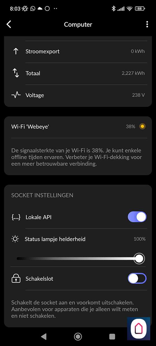 Bij de instellingen kun je de tussenstekker een naam geven, de standen inzien, je WiFi signaal sterkte bekijken en de status van het lampje wijzigen. Ook vind je hier de mogelkijkheid om de knop aan de zijkant uit te schakelen zodat je hem niet meer handmatig kan bedienen.